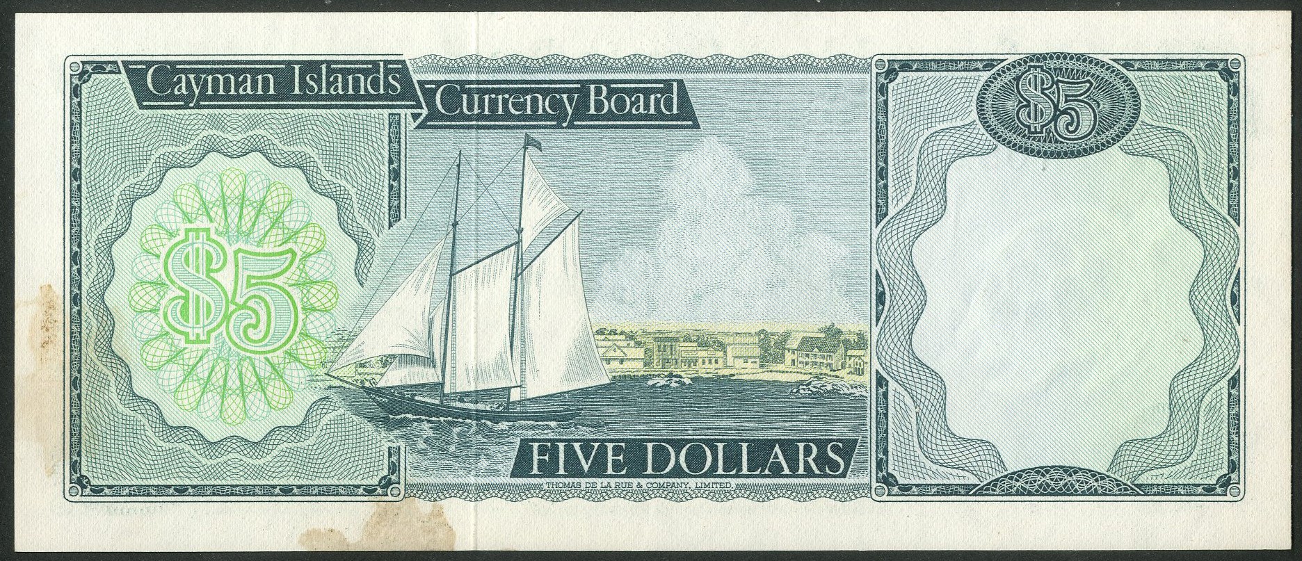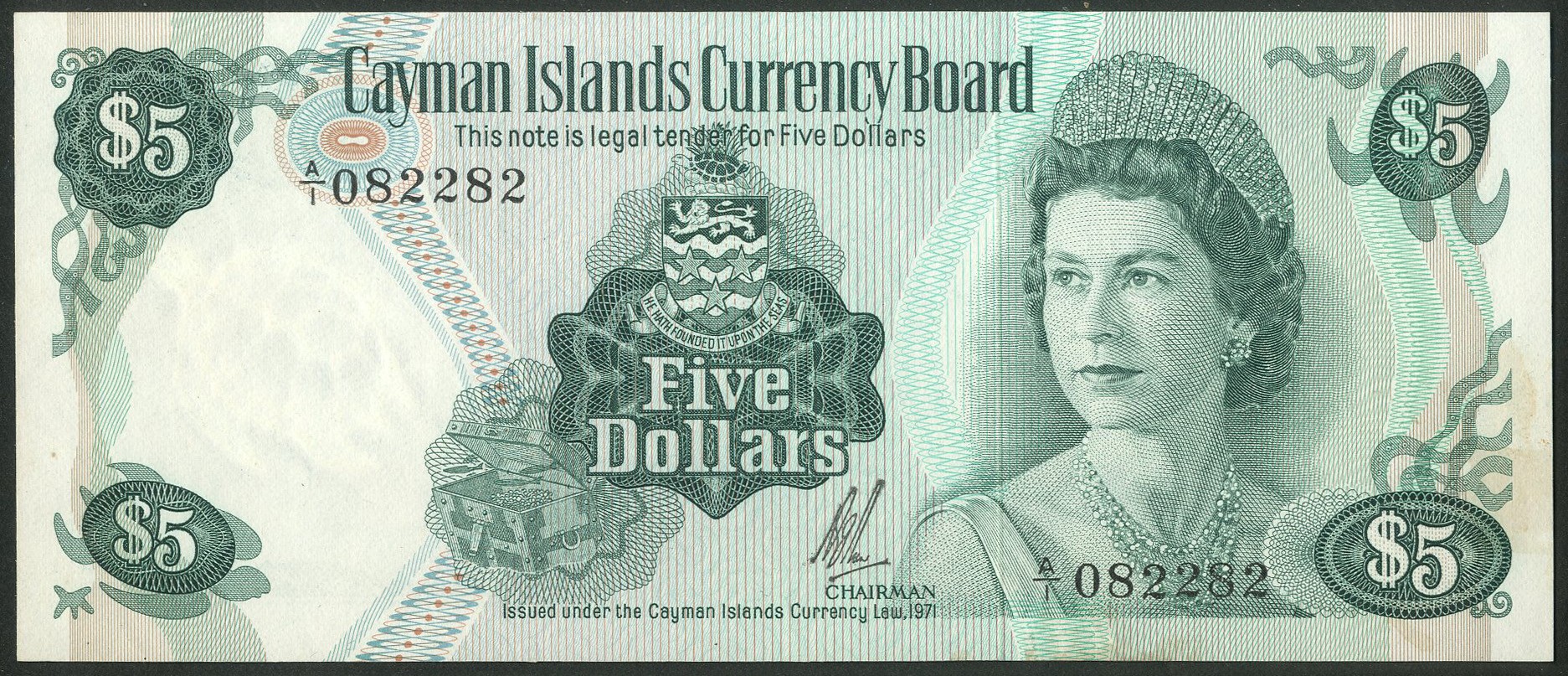 Cayman Islands, Currency Board, $5, 1971, A/1 082282 (WPM 2a), light pressing, staining reverse. VF-EF.