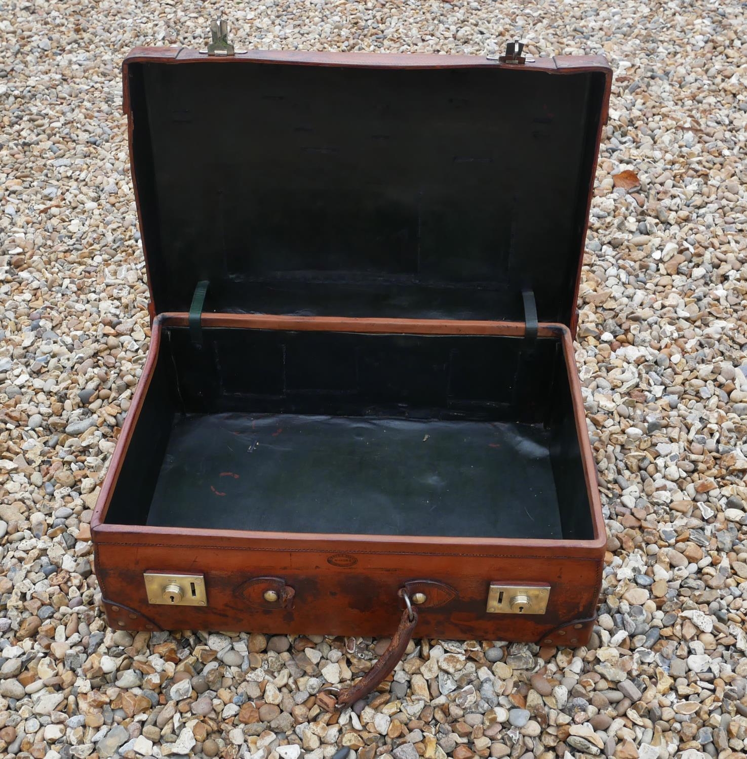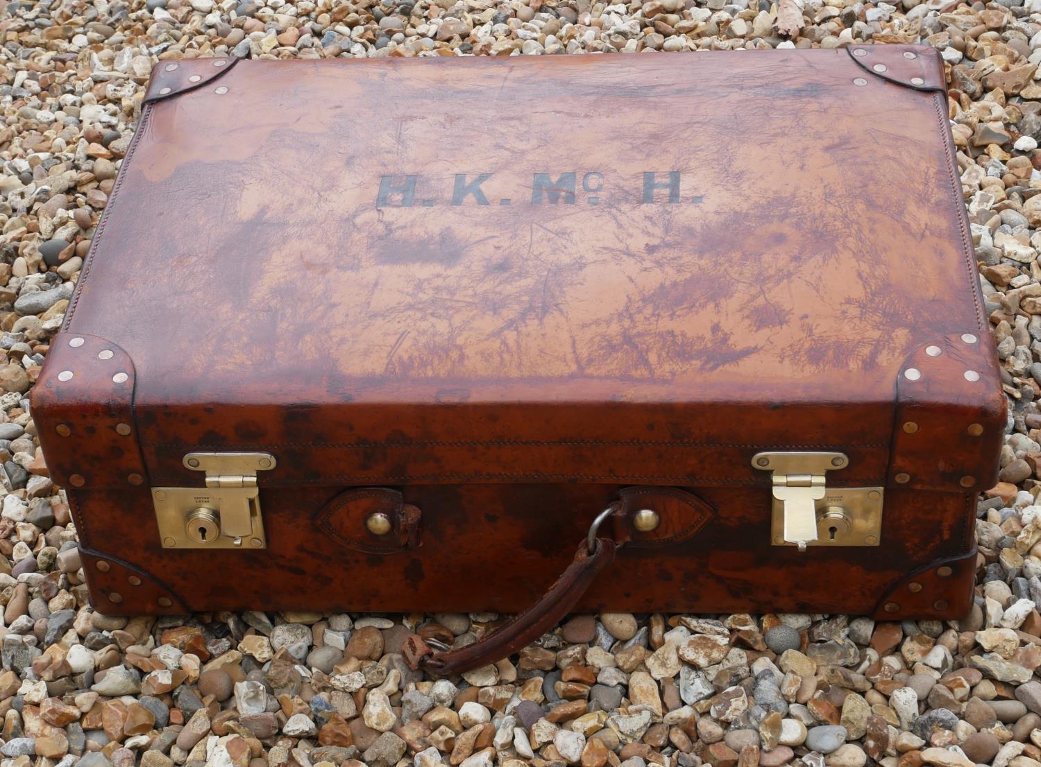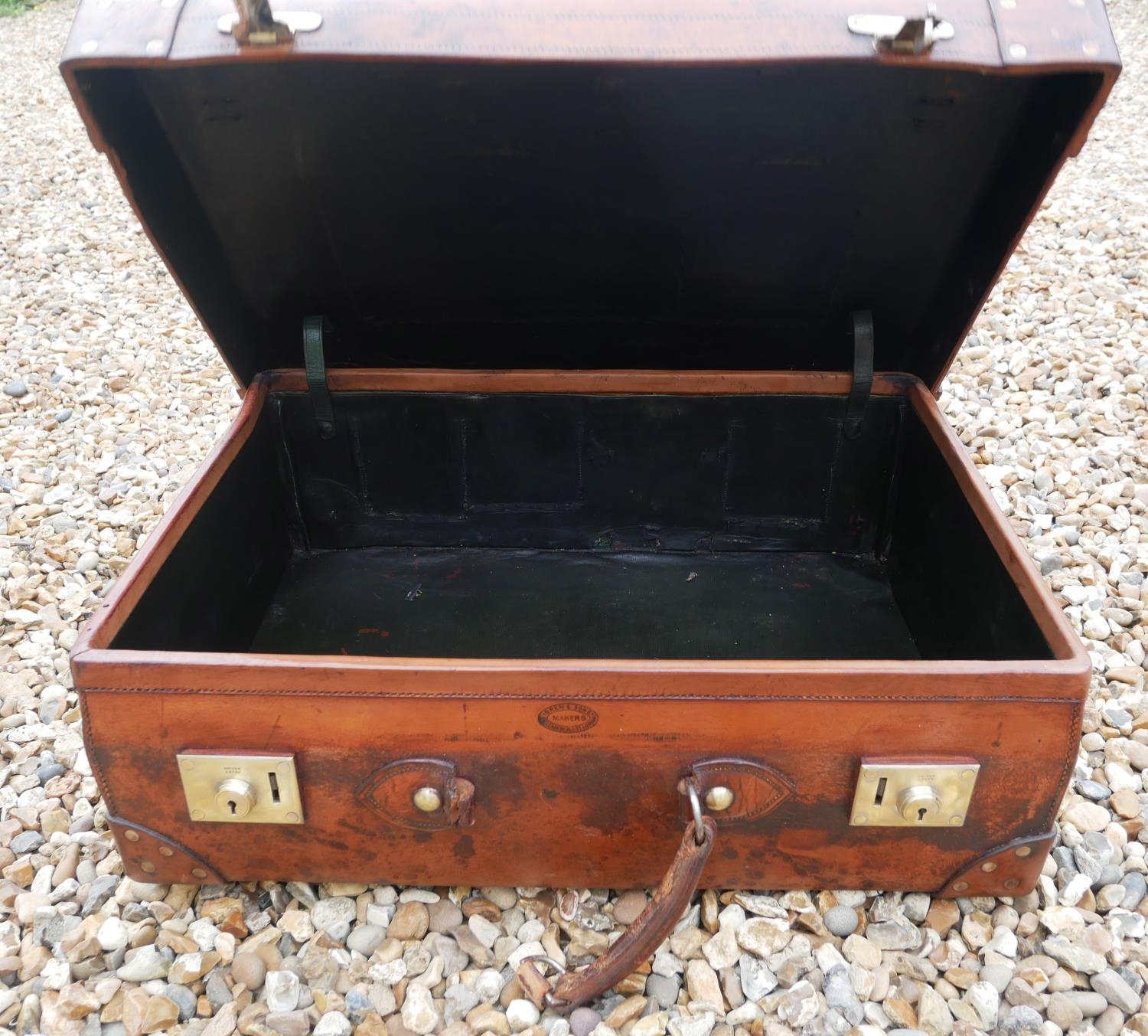 With polished brass lever locks, stamped maker’s mark.