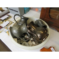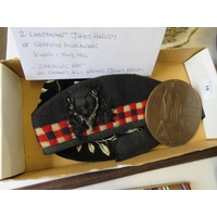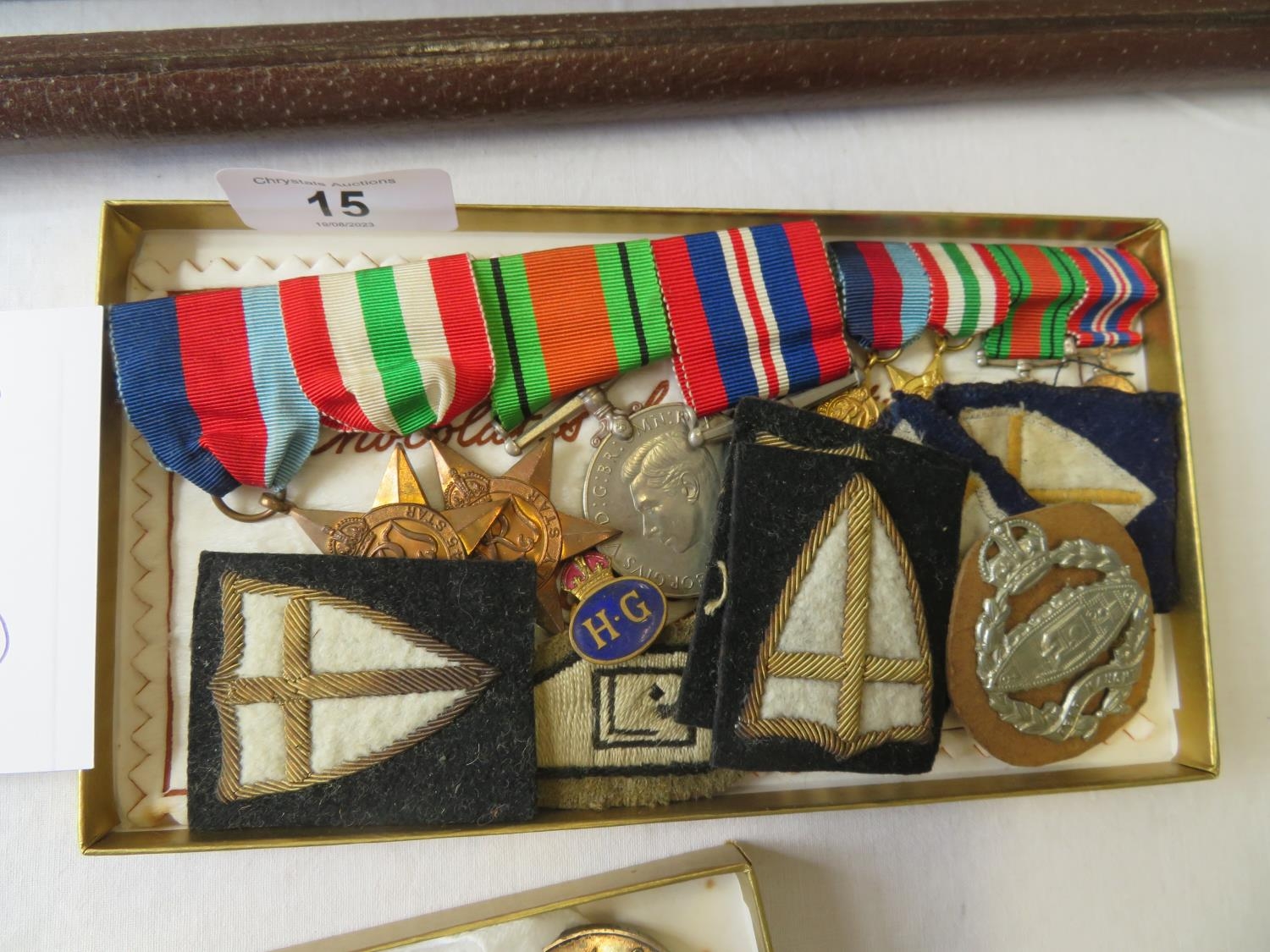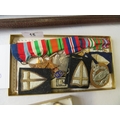 Four WW2 medal group for Major E J C Coward, Tank Corps plus other badges together with swagger stick