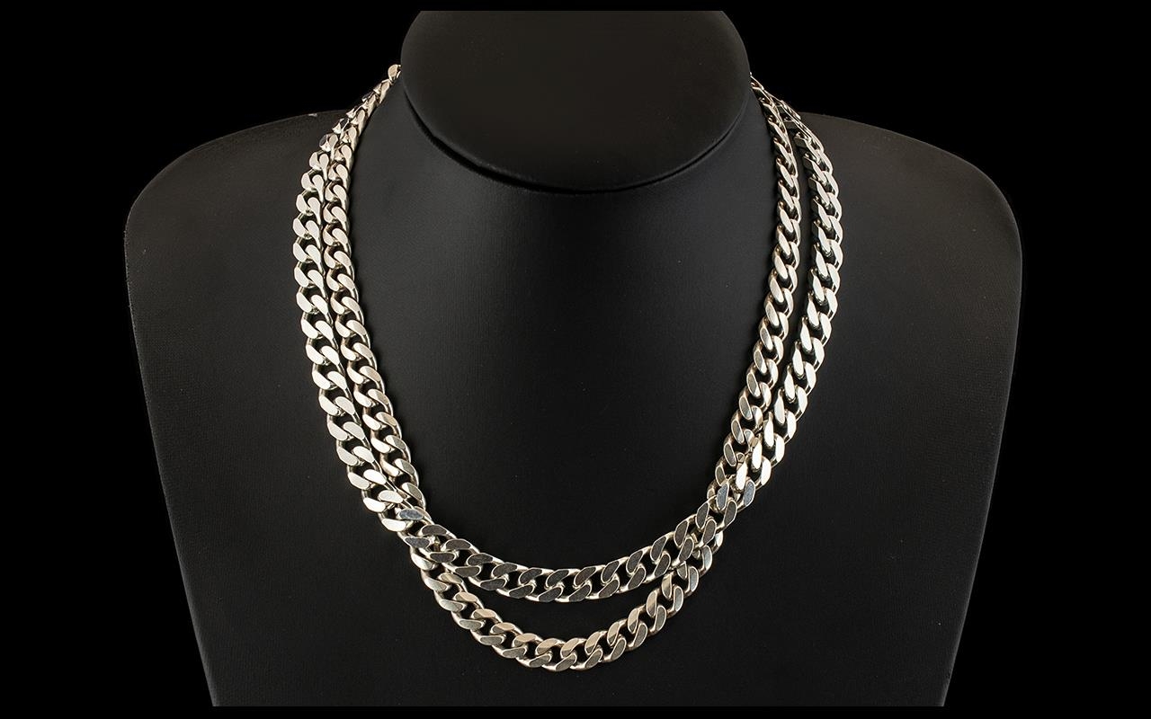 A Fine Quality Vintage Pair of Sterling Silver Curb Necklaces ( Solid ) with Excellent Clasps. Both Fully Hallmarked for Silver and Both In As New Condition. Each 18 Inches - 45 cms long. 108.2 grams.