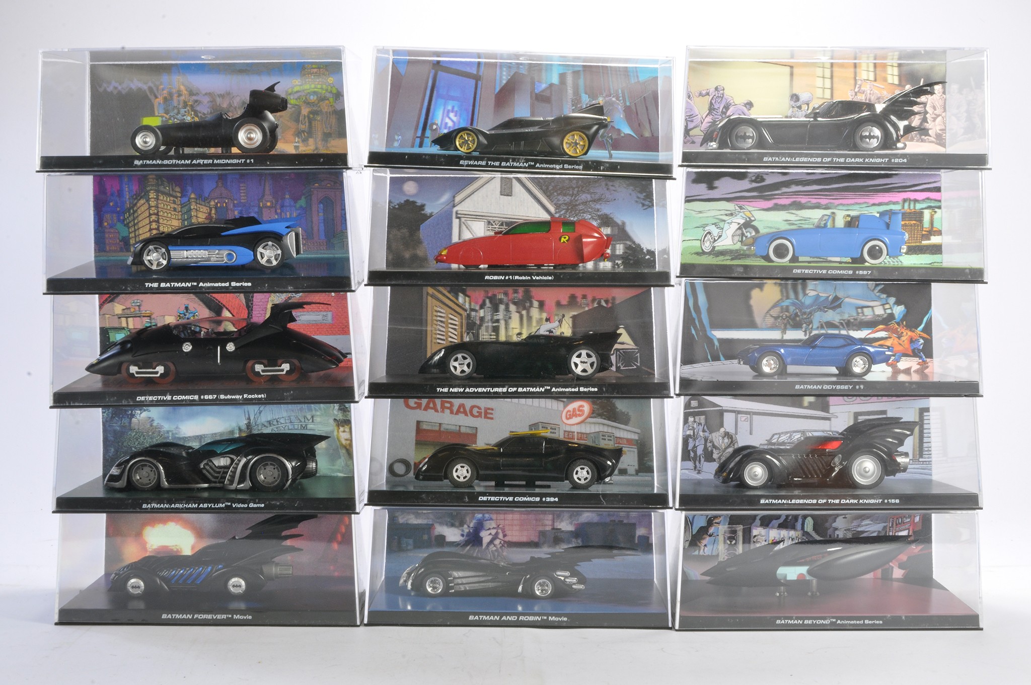 A group of fifteen Eaglemoss DC Comics - Batman 1/43 vehicles as shown. Look to be without fault in original display cases.