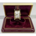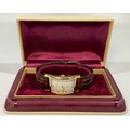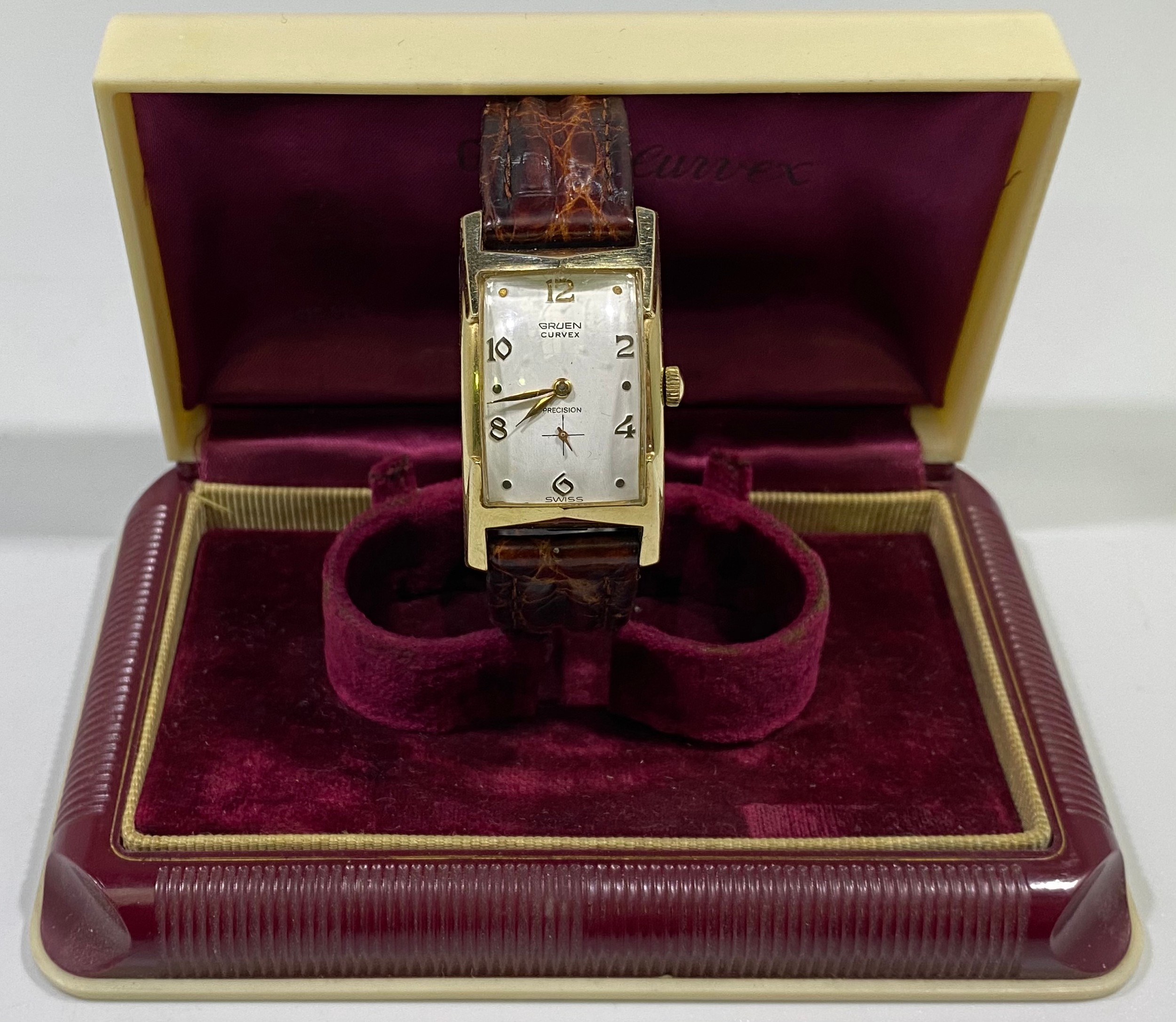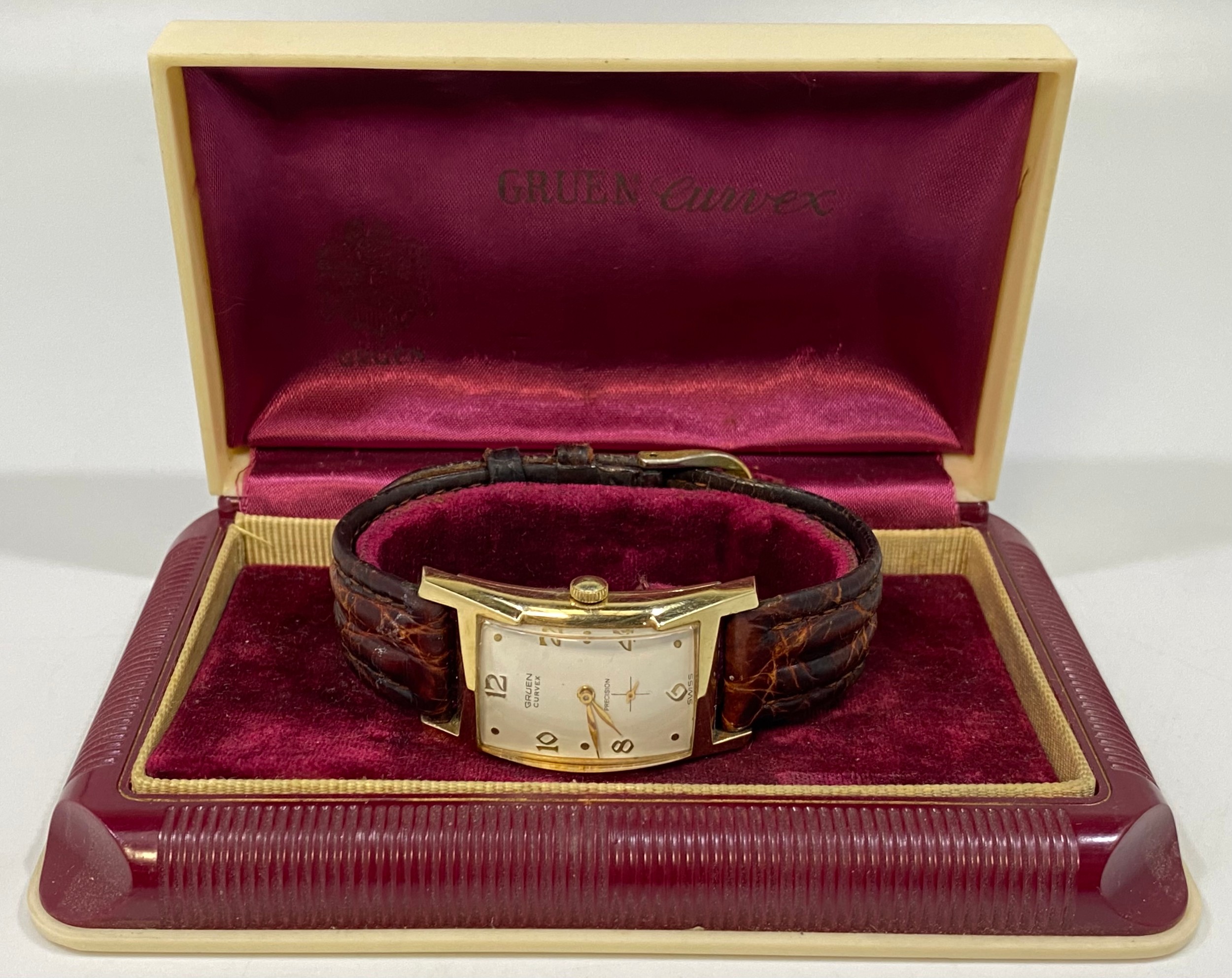A gold-plated Gruen 'Curvex' wristwatch, the curved, rectangular white dial with alternating Arabic numerals and dots denoting hours and subsidiary seconds dial, on a brown leather strap, in fitted and branded box