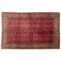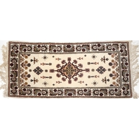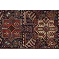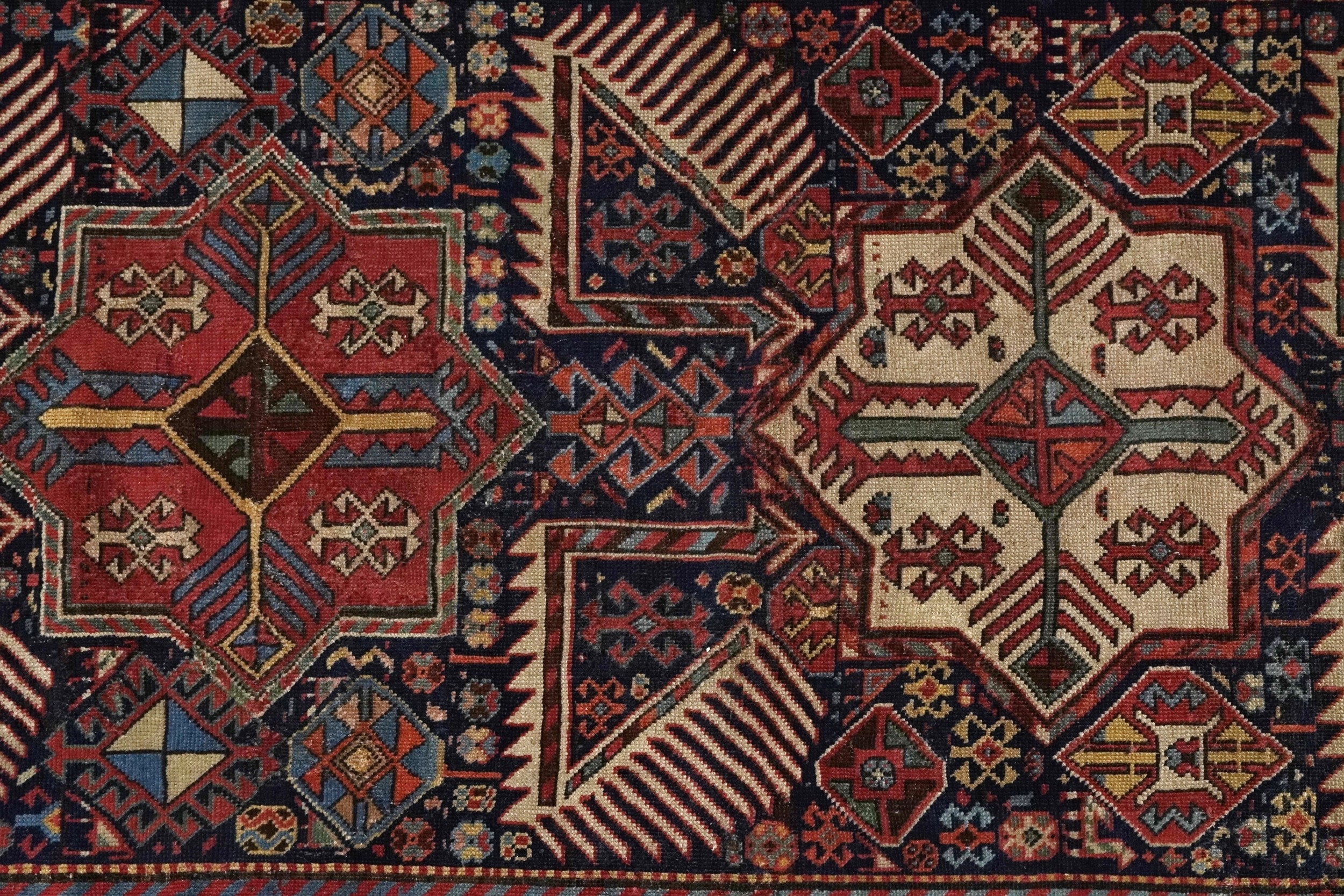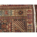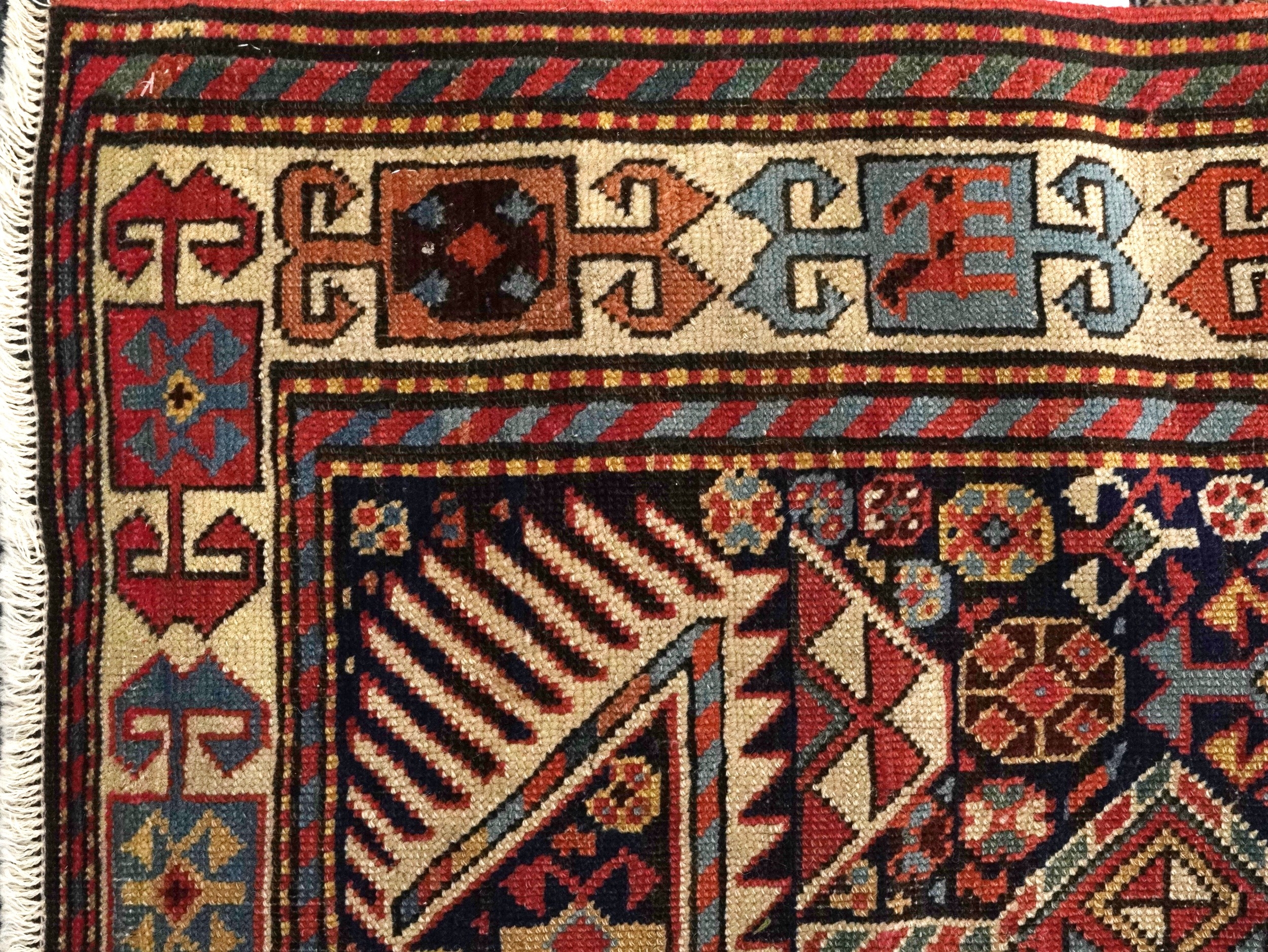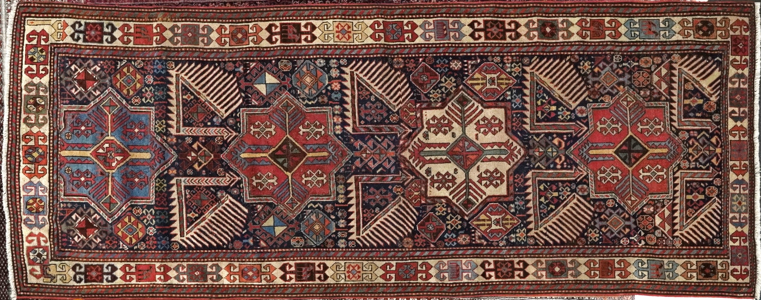 A Caucasian runner, 20th century, the blue field with four stylized flower head motifs within a complementary border, 284cm x 118cm.