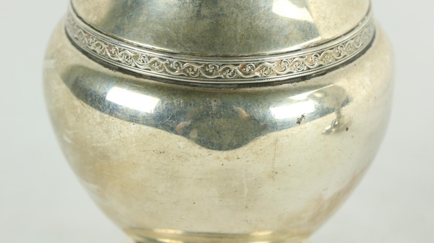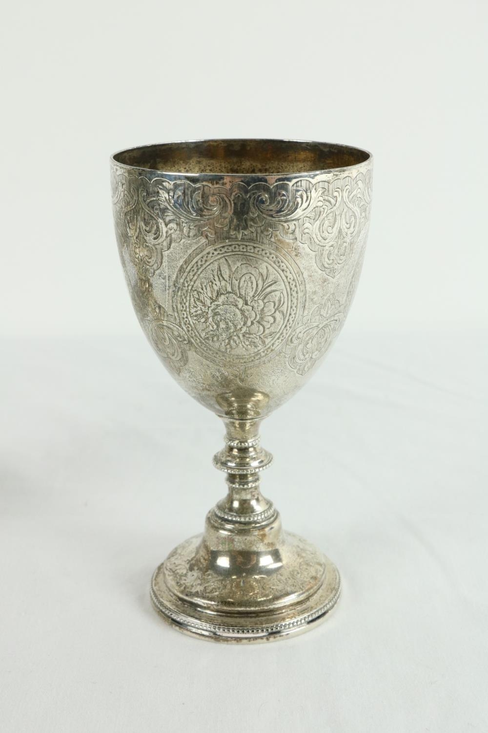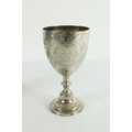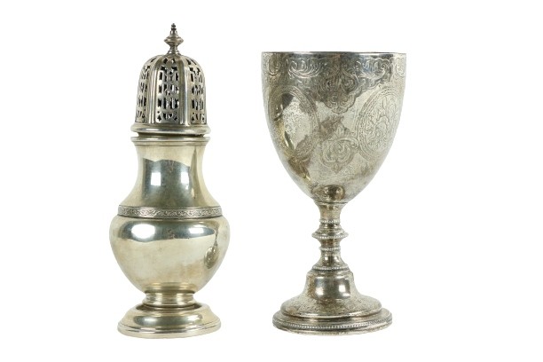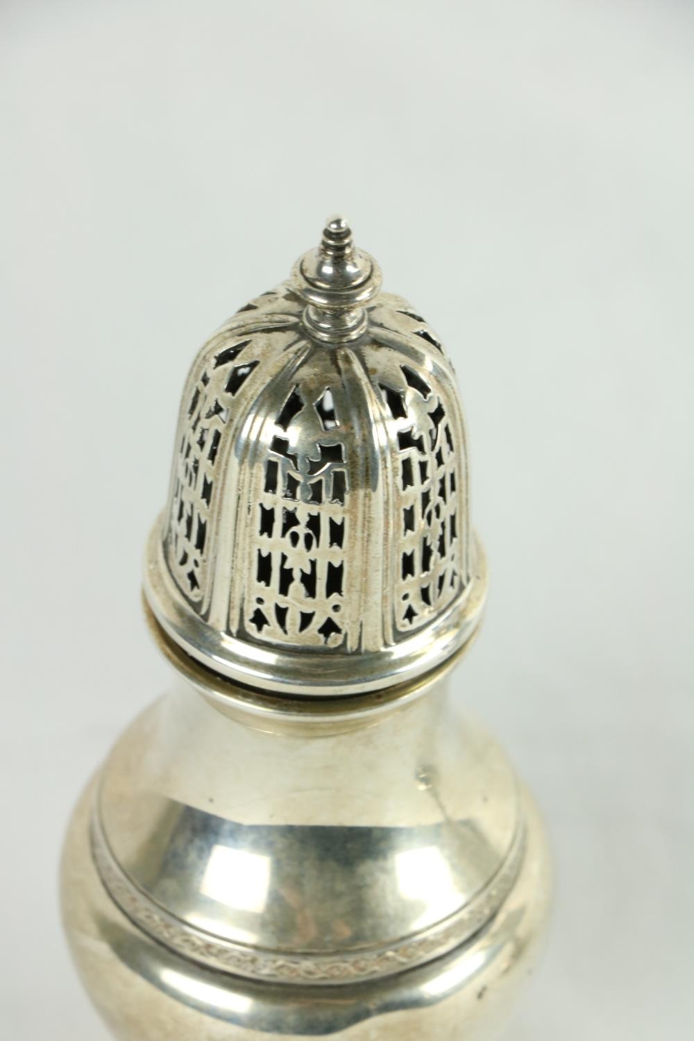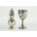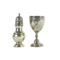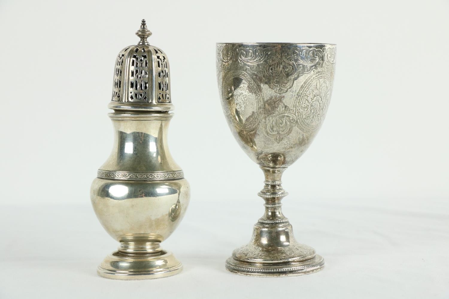 A heavy silver baluster shaped Castor Sugar Shaker, with pierced dome top, Chester 1932, 249 grams, and a chased Victorian silver Goblet by Hands & Son, London c. 1880, 167 grams. (2)