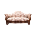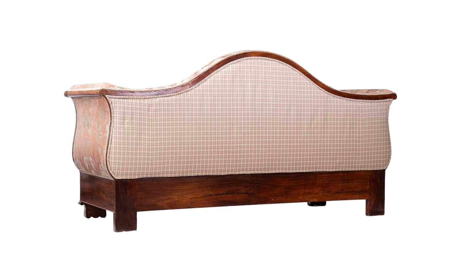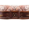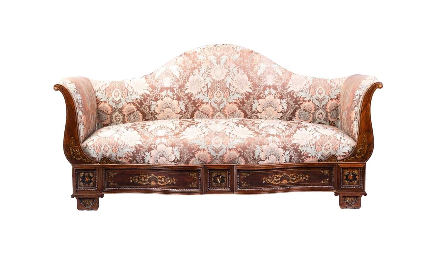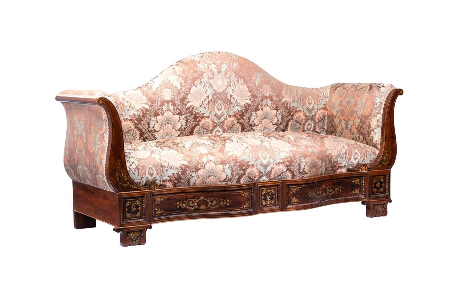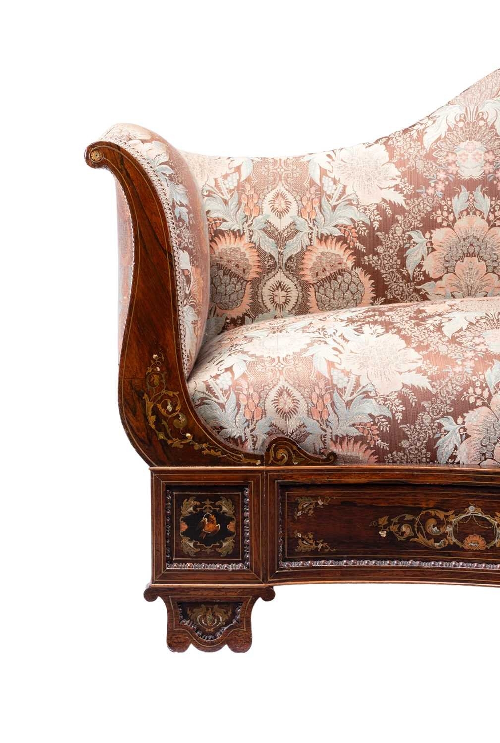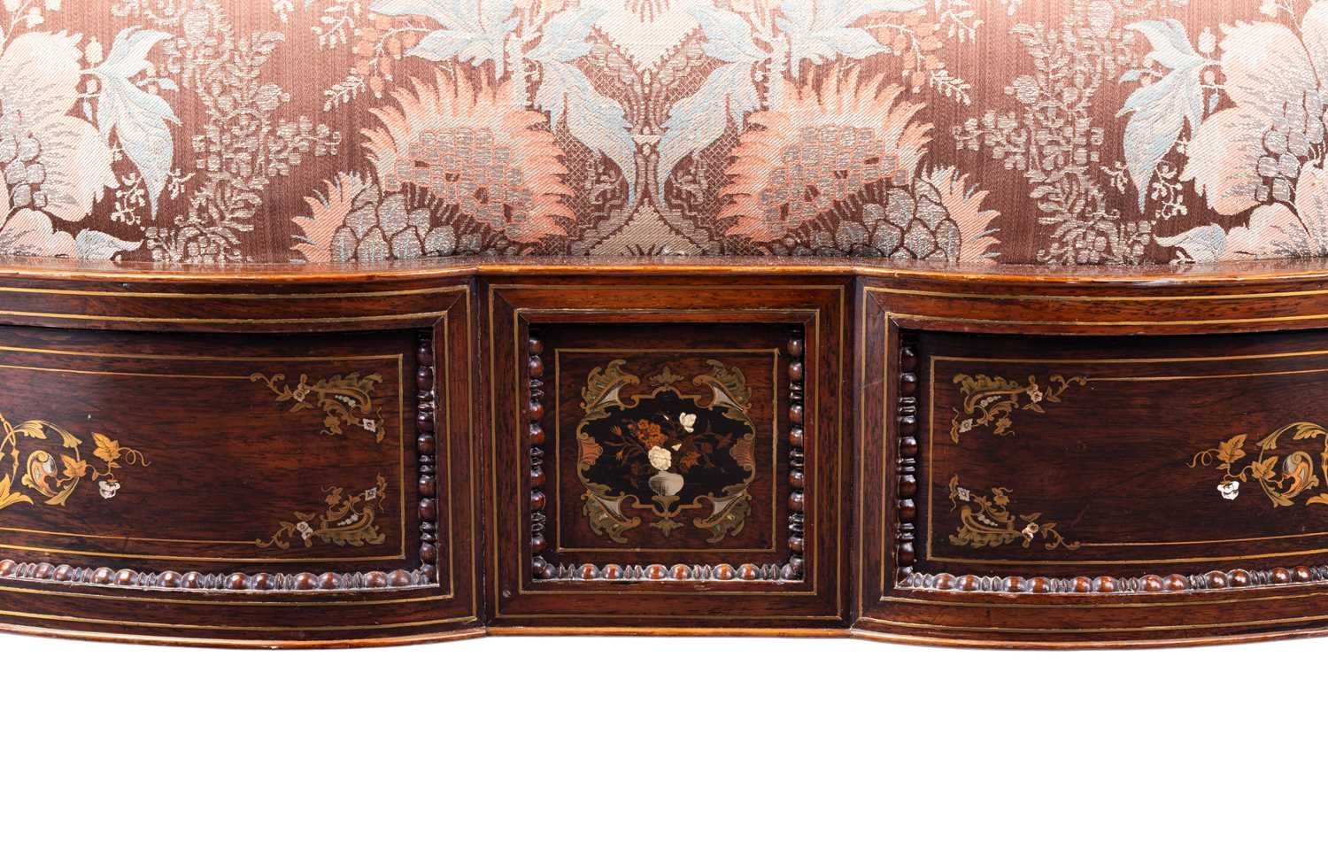 A rosewood and marquetry serpentine-fronted sofa, late 19th-century, with floral symmetrical damask overstuffed upholstery, 94 cm high x 172 cm wide, the seat 45 cm high.