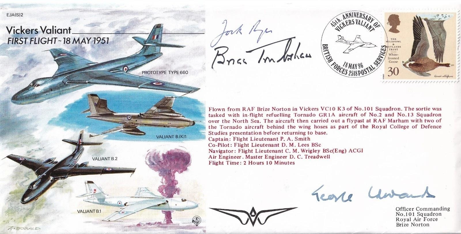 EJA(S)2c Vickers Valiant Flown cover Signed by Brian Trubshaw, Sir G Edwards +1. 18 May 96 BFPS 2518 45th Anniversary of Vickers Valiant 1st Flight. Personally Signed Brian Trubshaw Concorde Test Pilot, Sir G. Edwards Chief Designer and J. Bryce. Chief Test Pilot Details enclosed. Certified Copy 00114 of 499. Good condition. All autographs come with a Certificate of Authenticity. We combine postage on multiple winning lots and can ship worldwide. UK postage from £5.99, EU from £7.99, Rest of World from £9.99