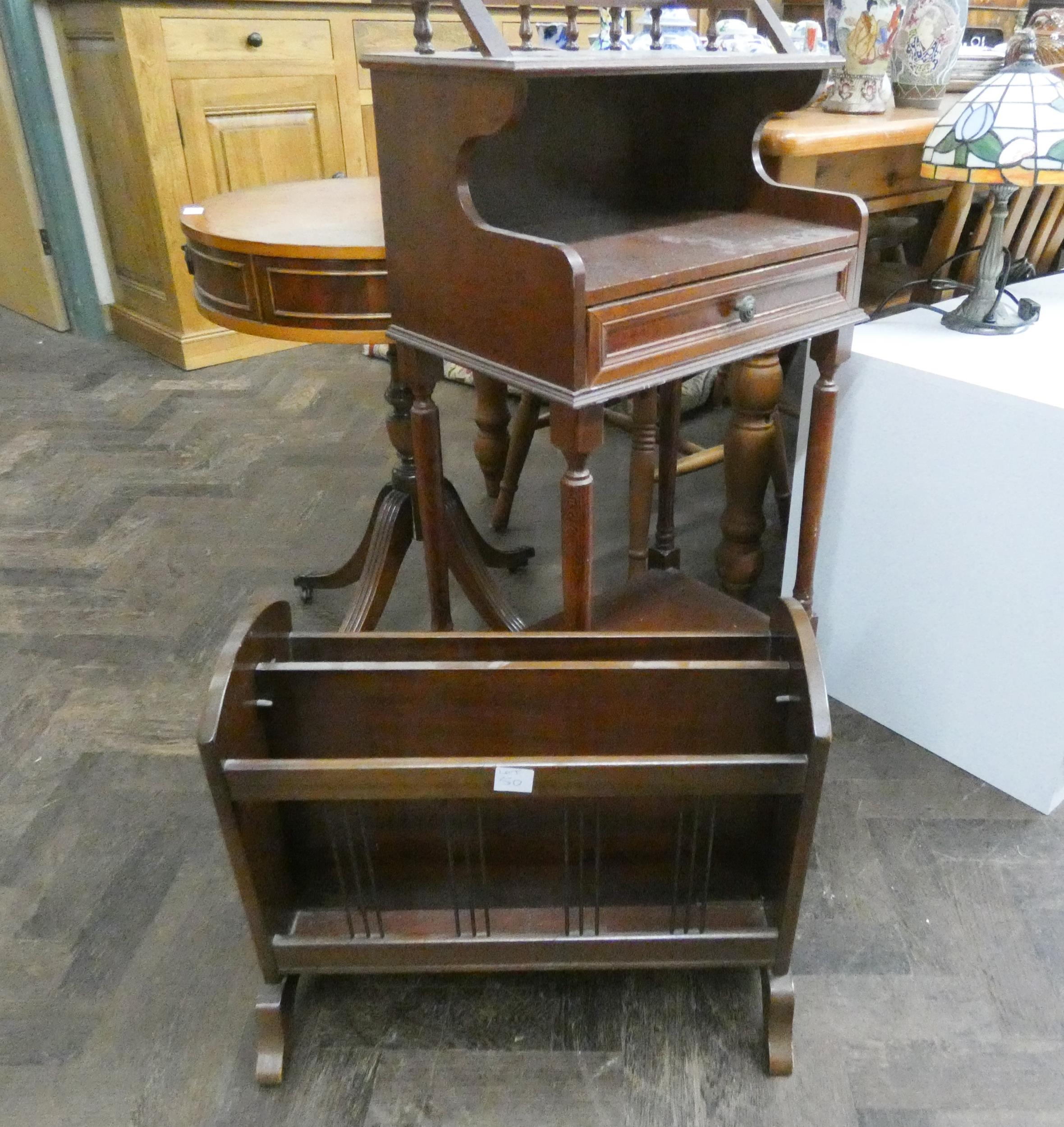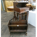 A mahogany three tier hall telephone table fitted drawer and a mahogany magazine rack