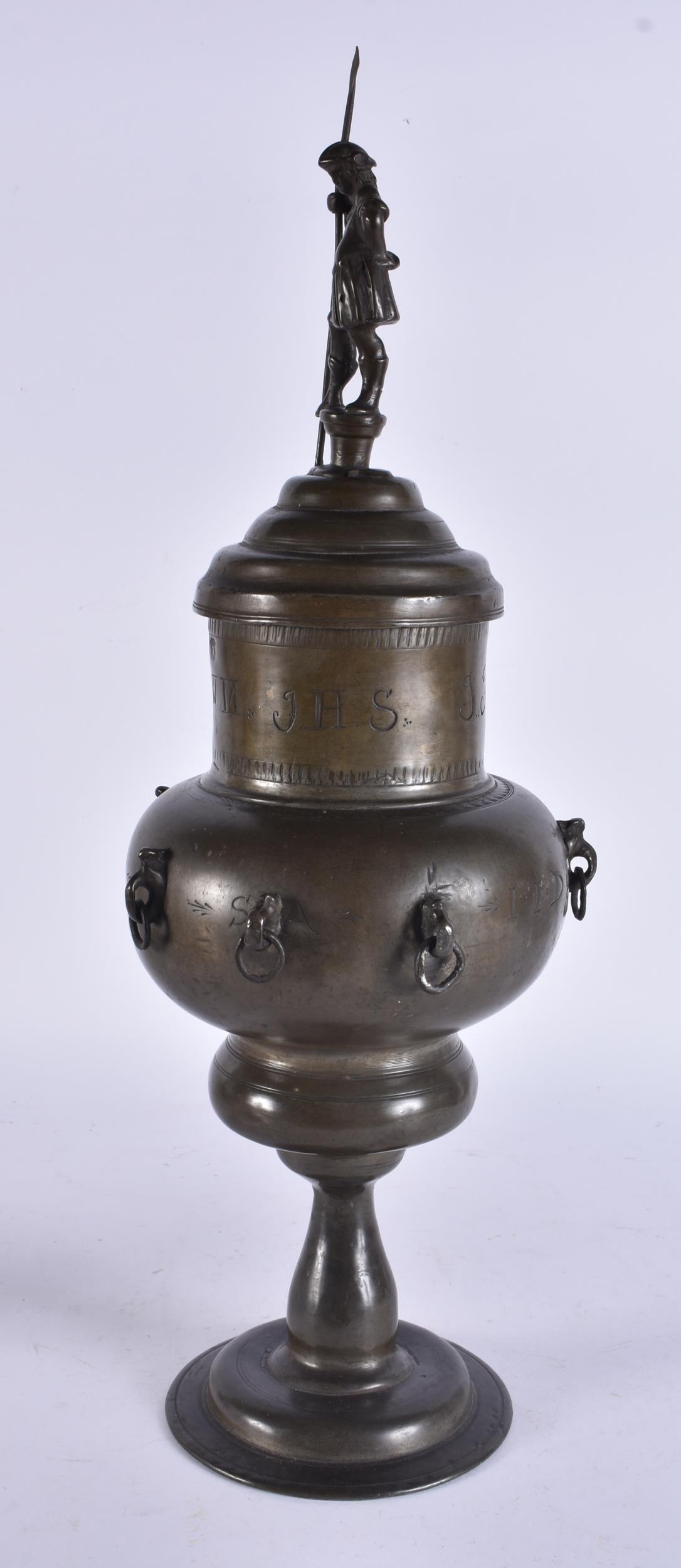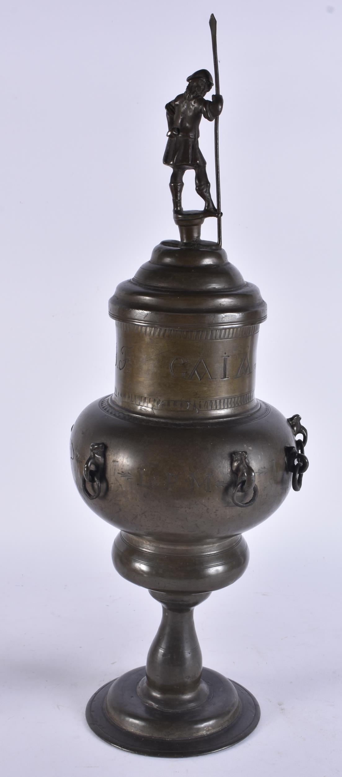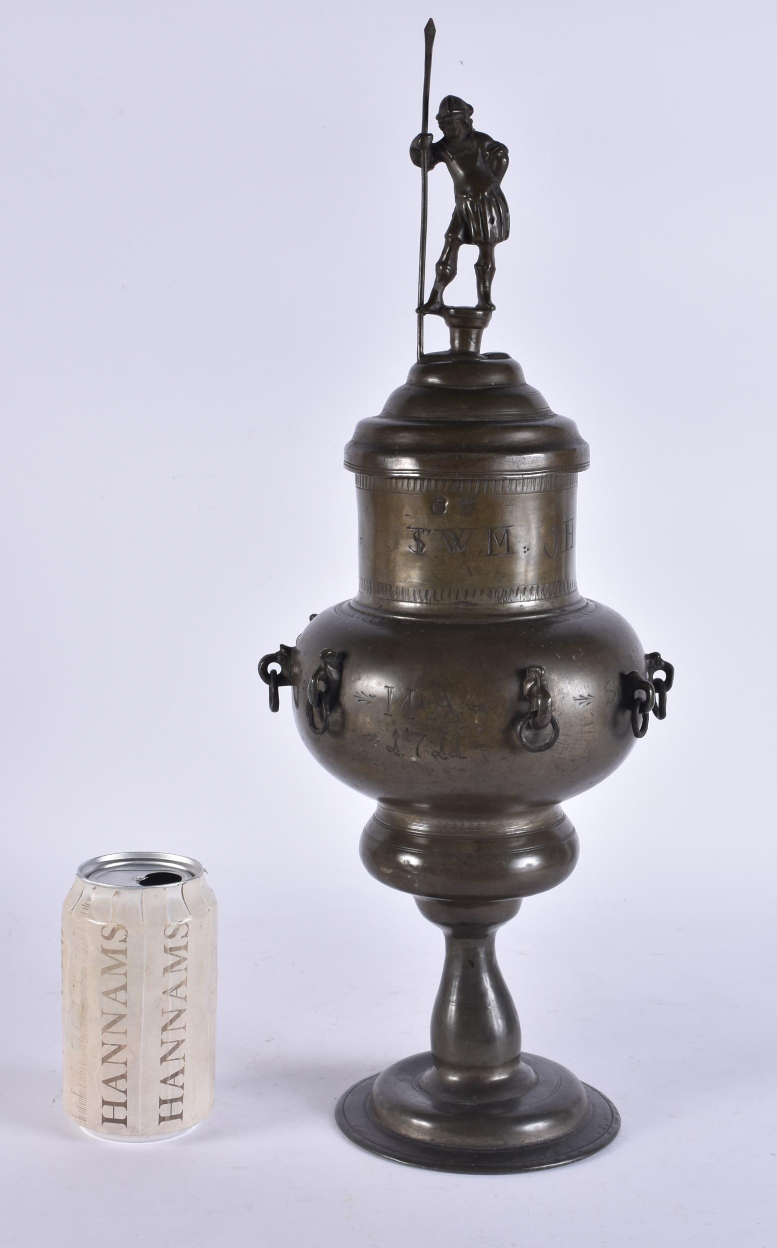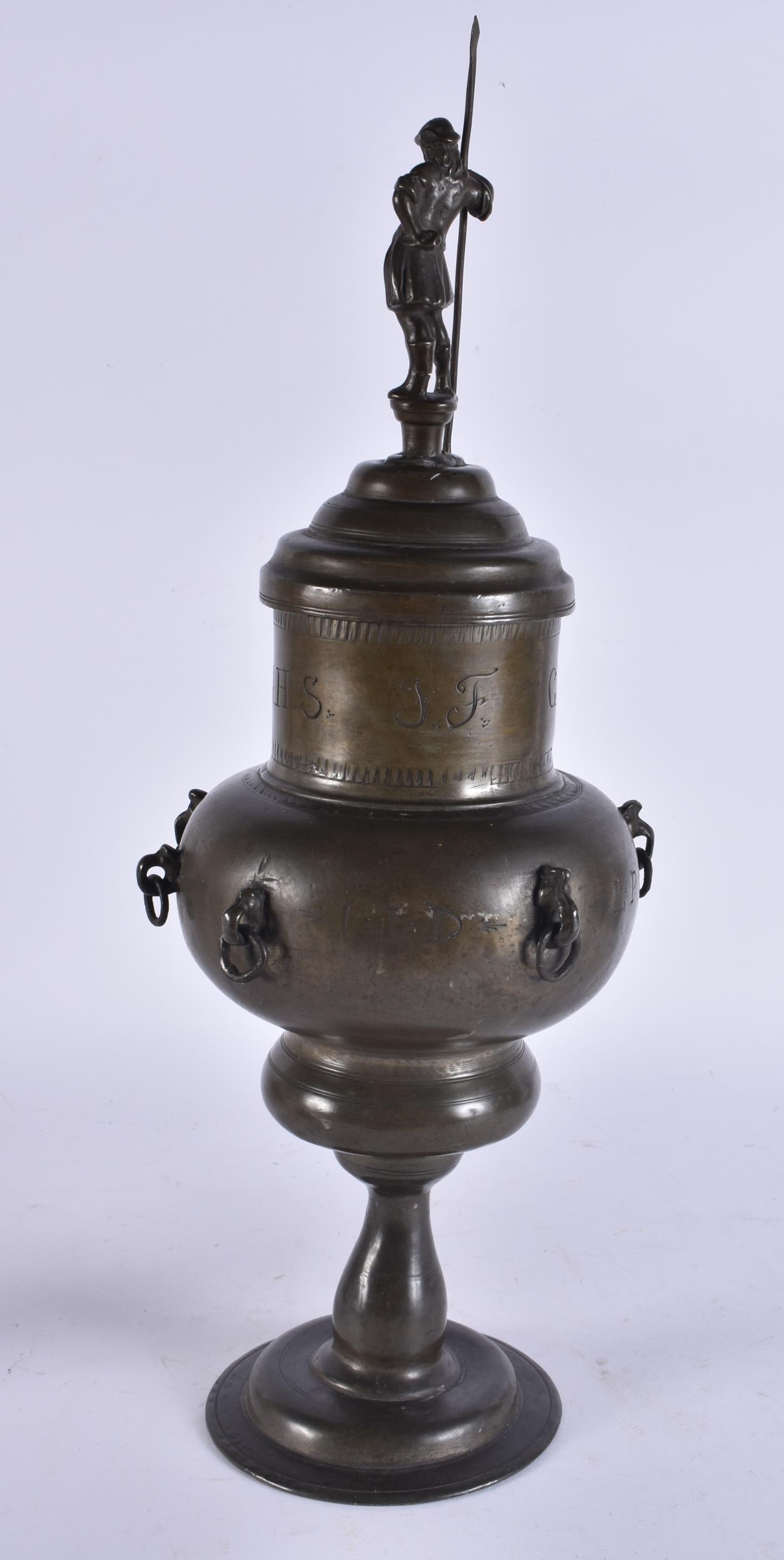 AN UNUSUAL EARLY 18TH CENTURY EUROPEAN PEWTER GUILD VASE AND COVER C1711. 47 cm high.