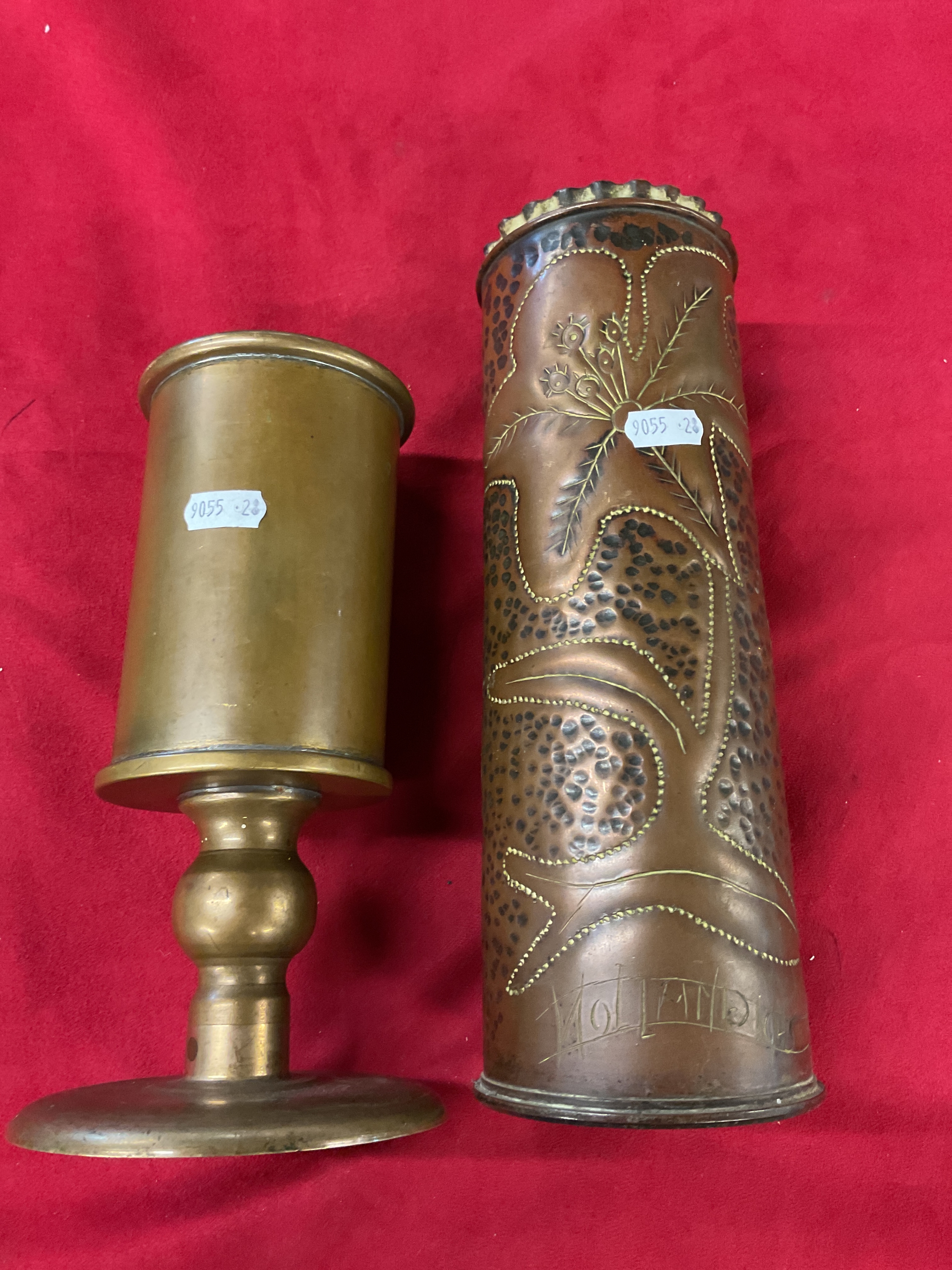 A trench art was having floral decoration and inscribed Holland 1945 together with another