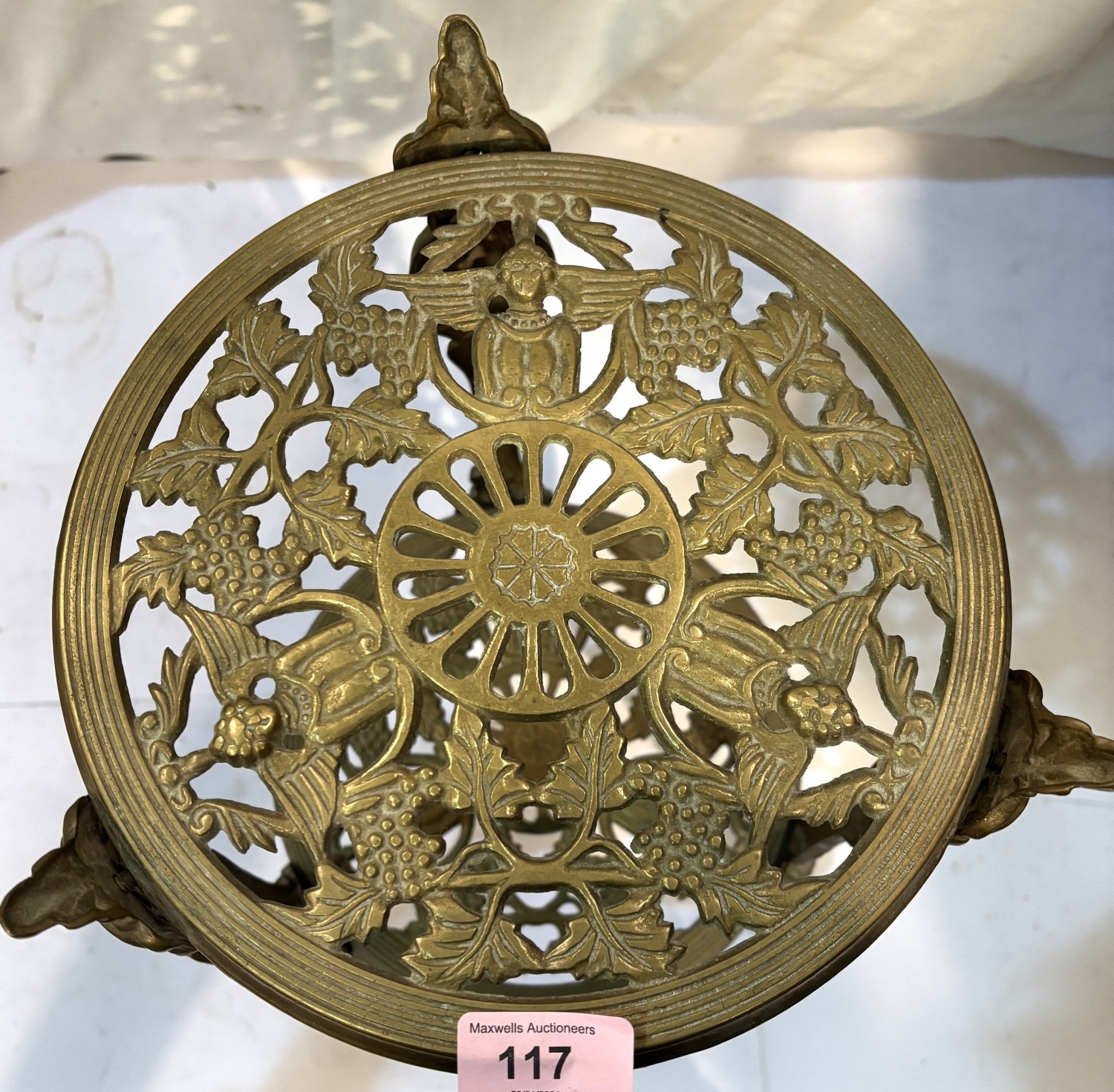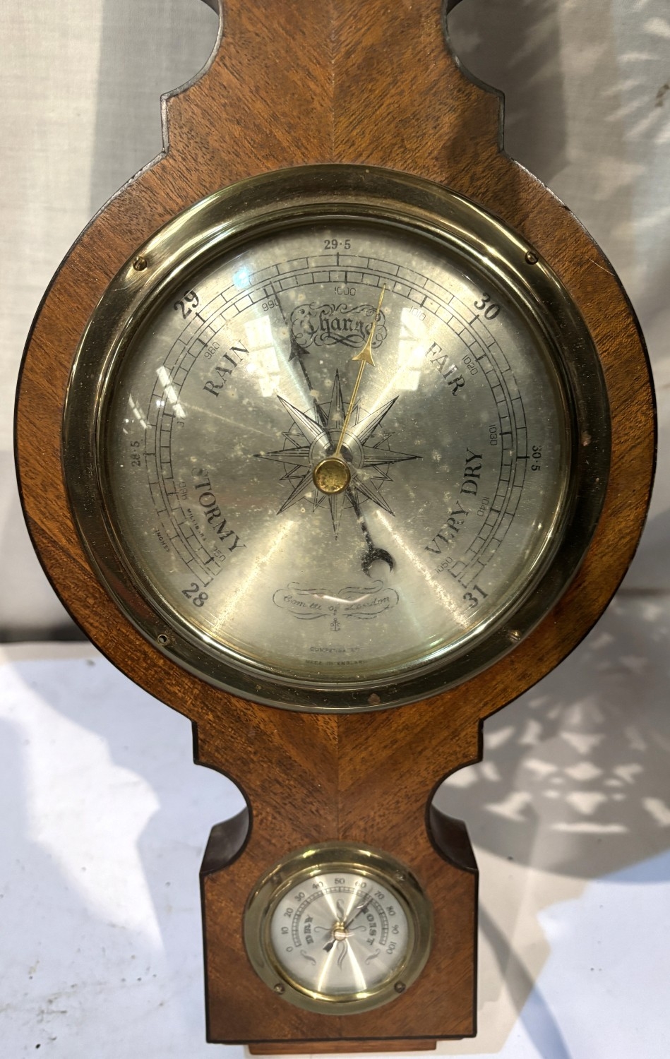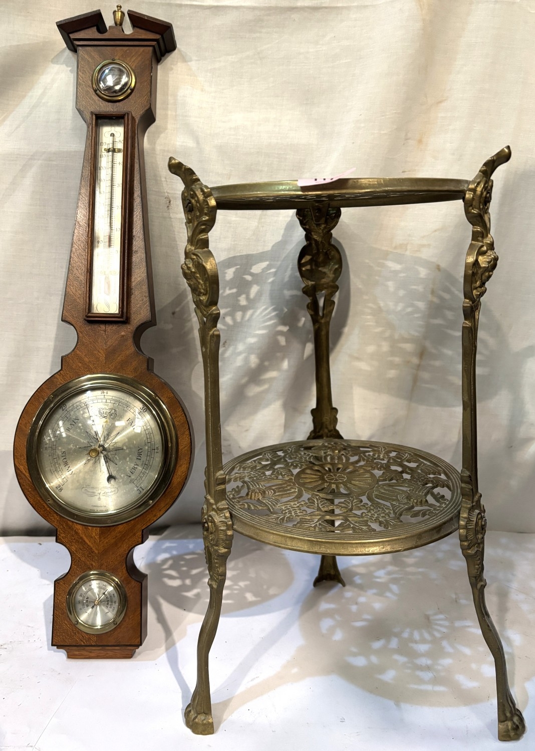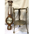 A brass two height stand, brass coal bucket, brass door stop and a Comitti aneroid barometer.