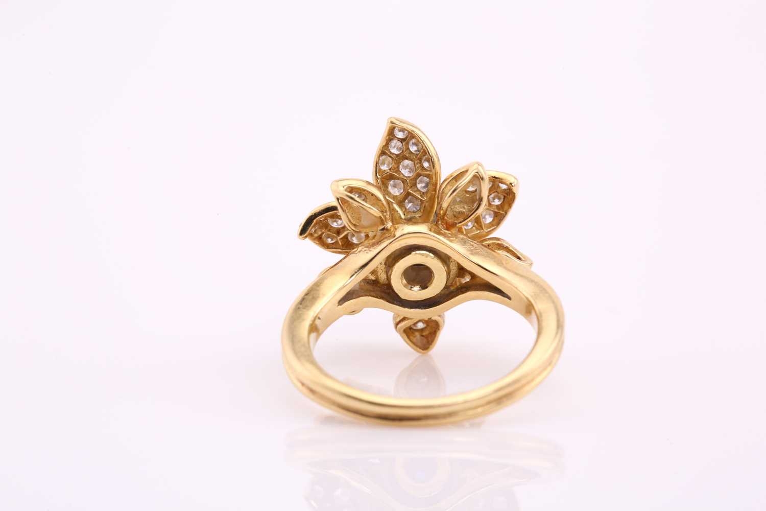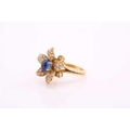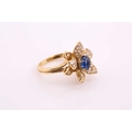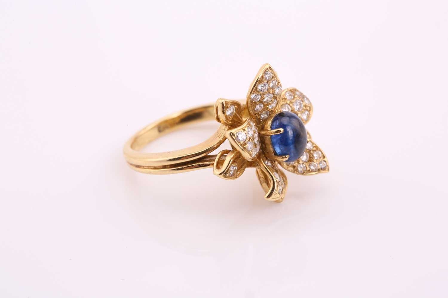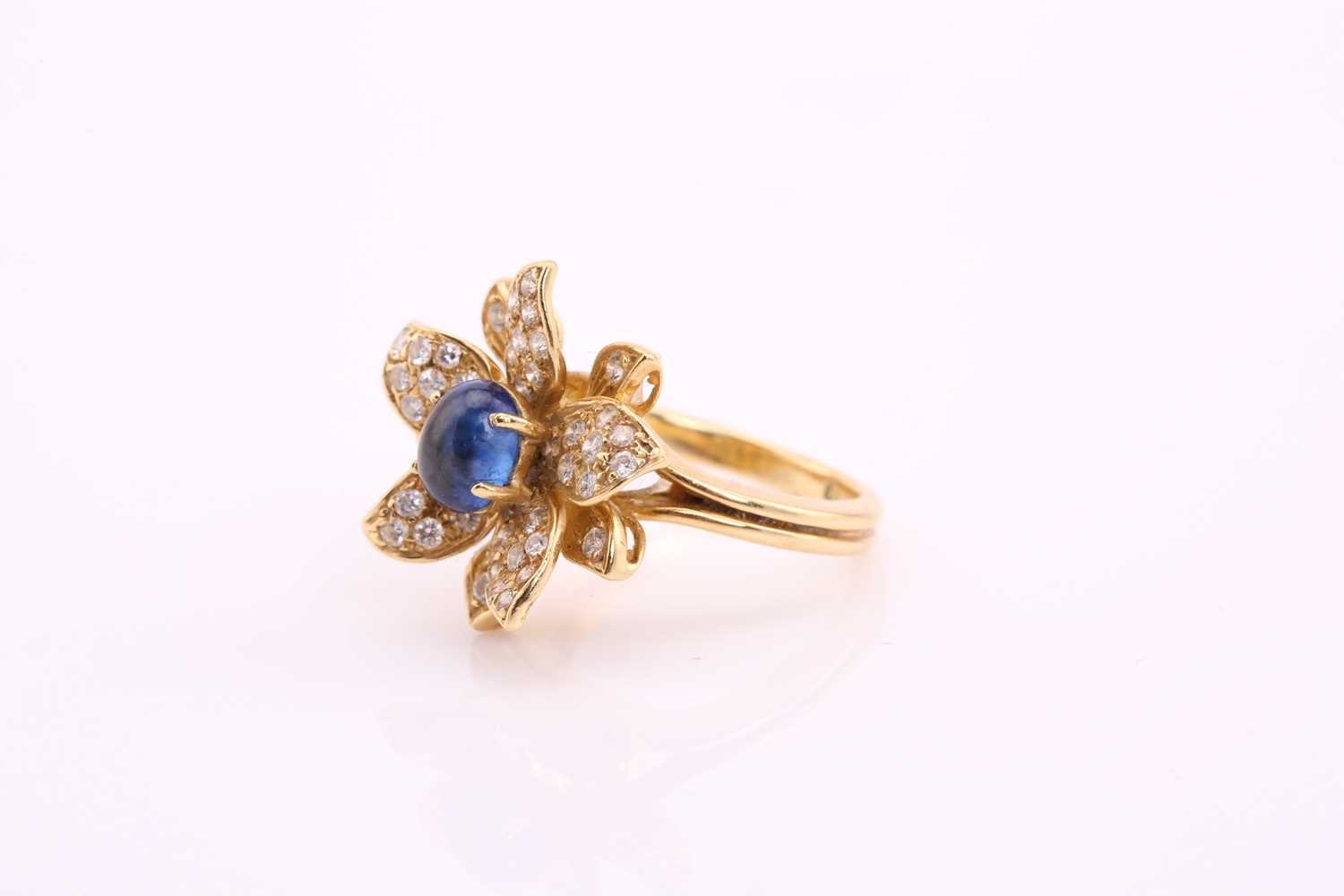 An 18ct gold sapphire and diamond flower ring, comprises an oval sapphire cabochon with a high dome, measuring 6.4 x 5.1 mm, claw set in the centre on a yellow gold floral mount, surrounded with layered petals pavé set with diamonds, to a conjoined split shank, British hallmarked as 750, ring head measuring 1.8 x 1.7 cm, ring size K, total weight of item 7.6 grams.