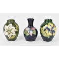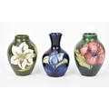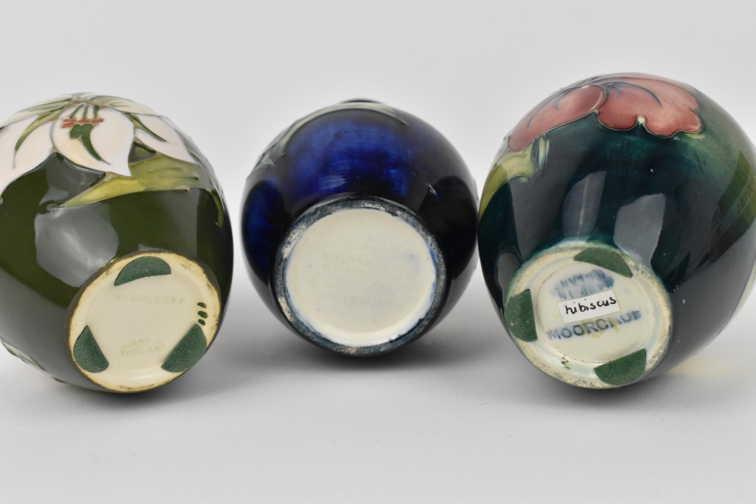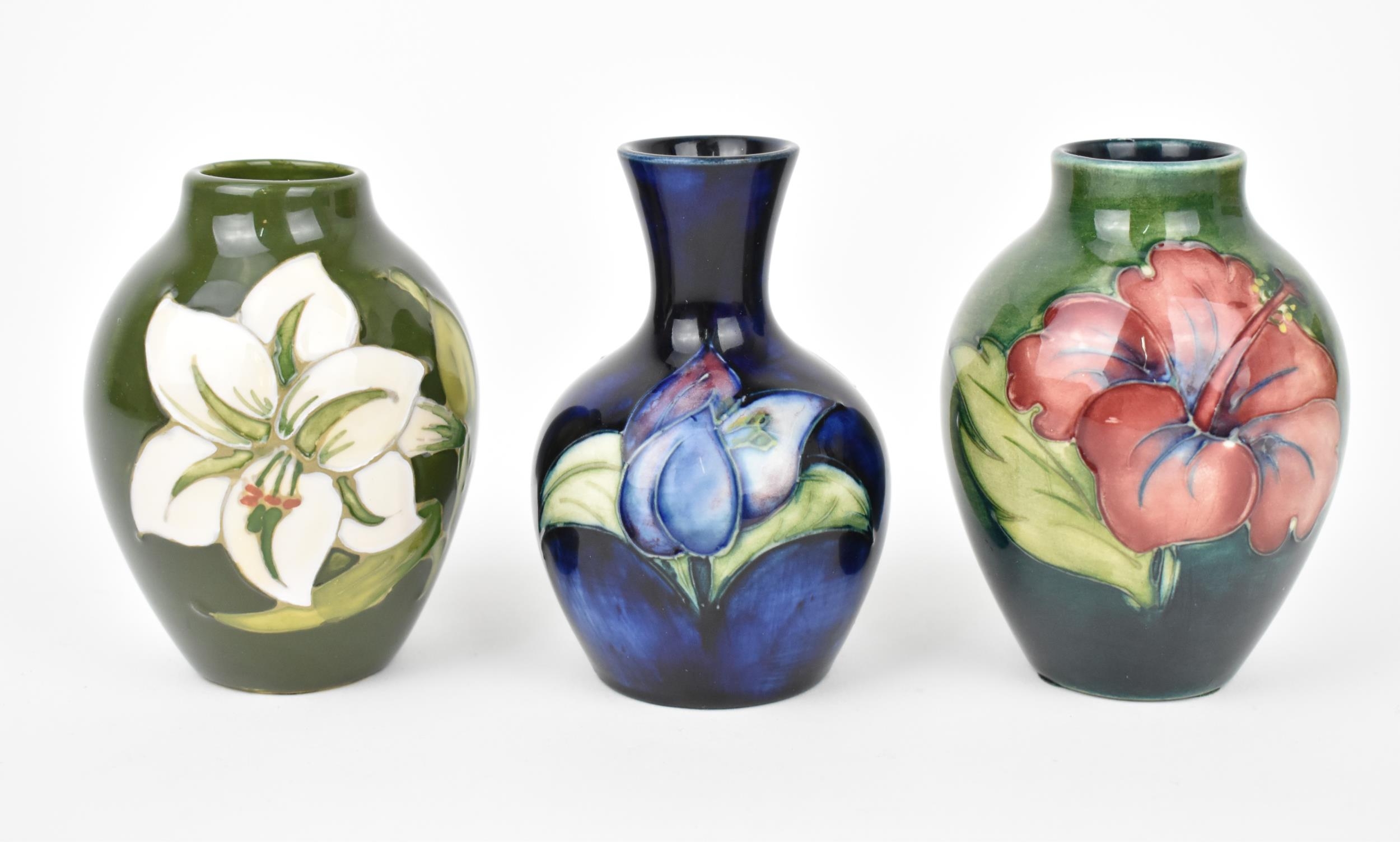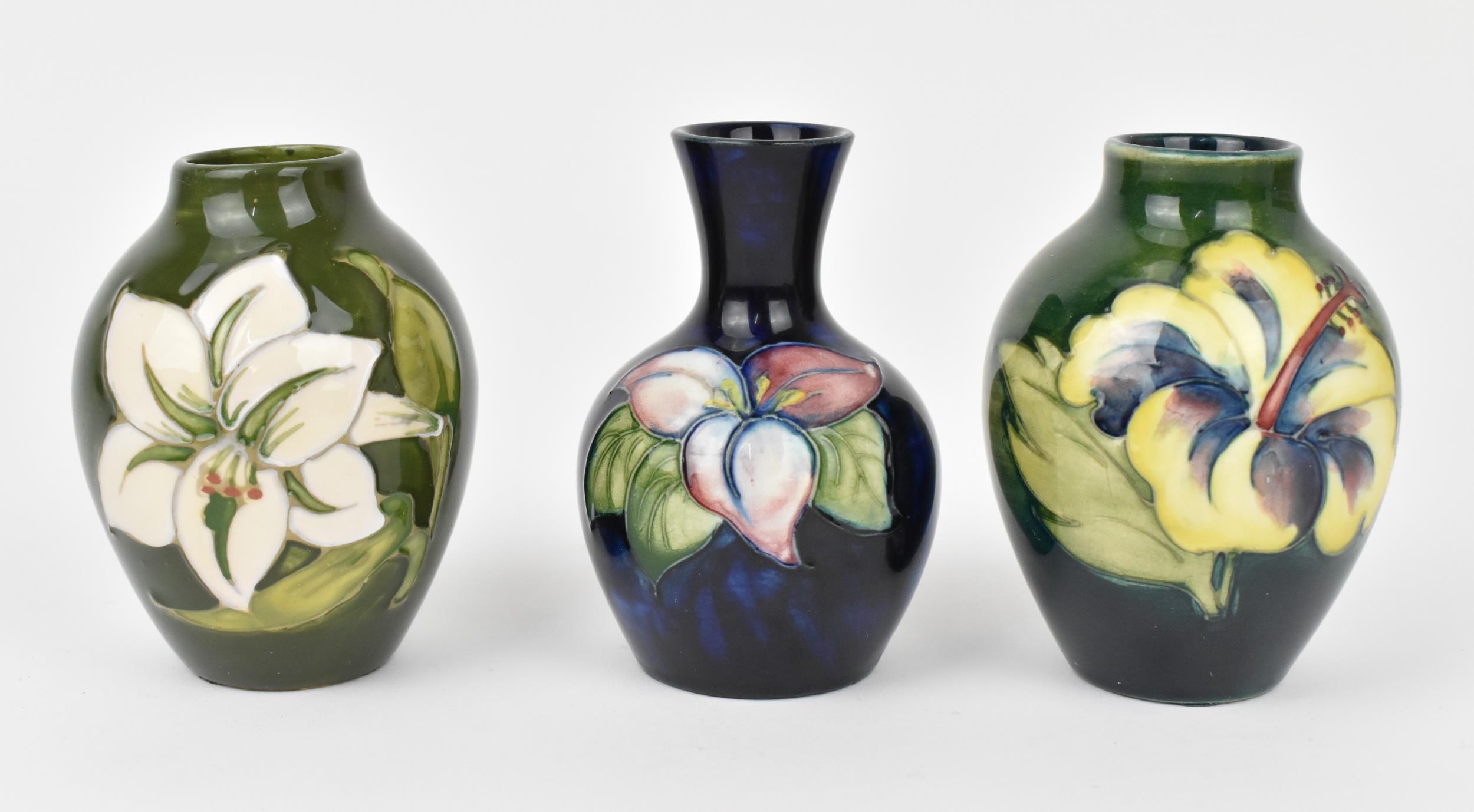 A small collection of Moorcroft ceramic vases, to include 'Hibiscus', 'Bermuda Lily' and 'Bougainvillea' patterns, each impressed to underside, tallest 9 cm