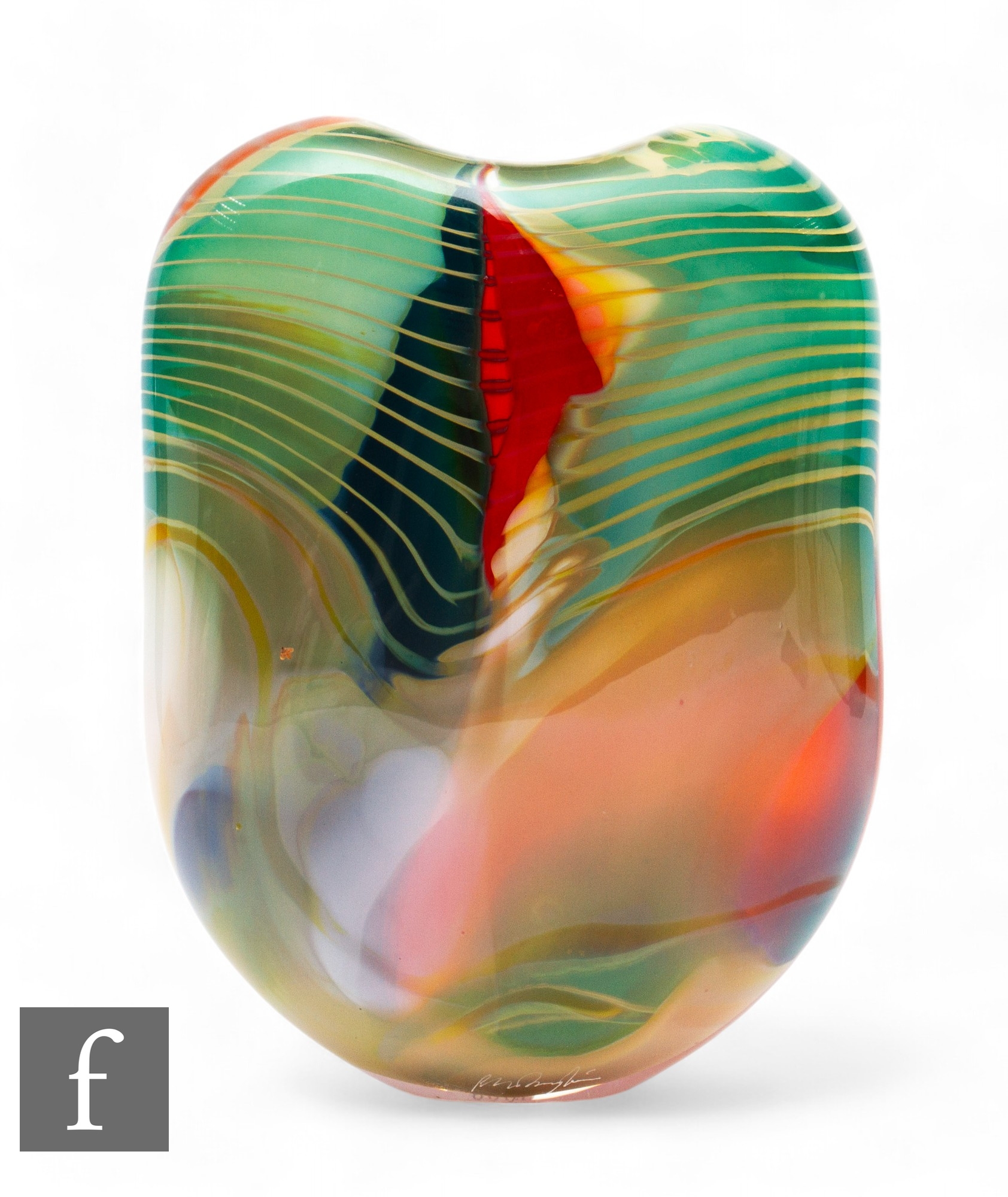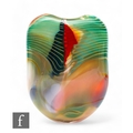Peter Layton - A contemporary studio glass vase in the Paradiso pattern, of compressed ovoid form, decorated with tonal green bands against the ruby and opal ground, engraved signature, height 29.5cm.