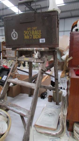A plywood ammunition box (0.303 Ball MK7 BDR) and a wooden step ladder. (Collect only)