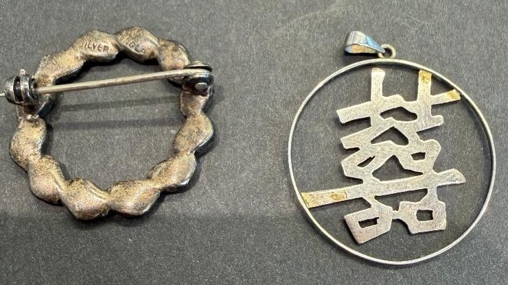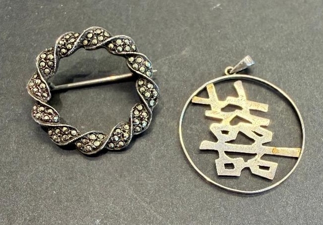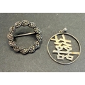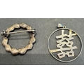 Jewellery : Circular silver pendant with Japanese writing style design, plus silver broach total weight 7.2g