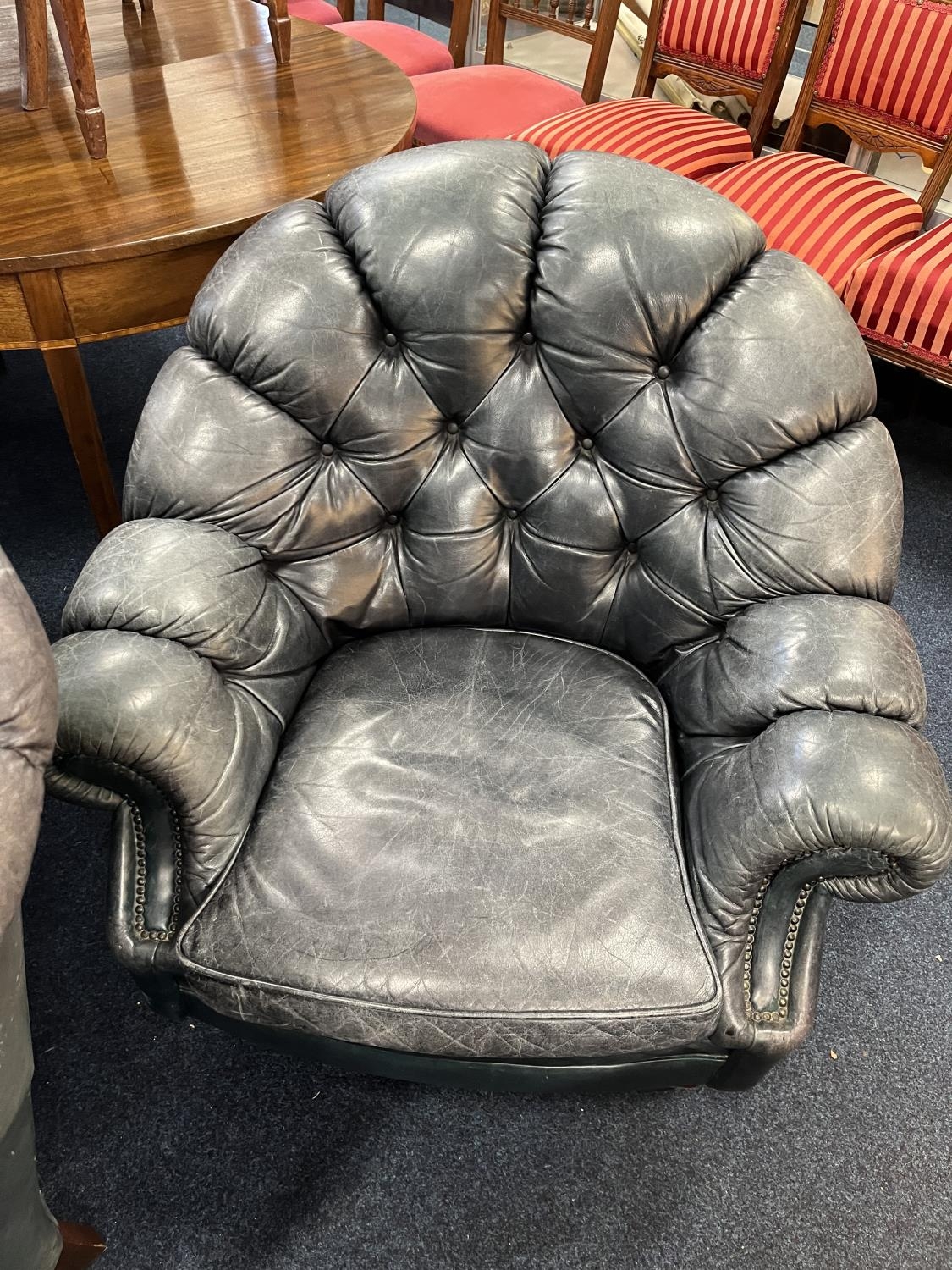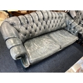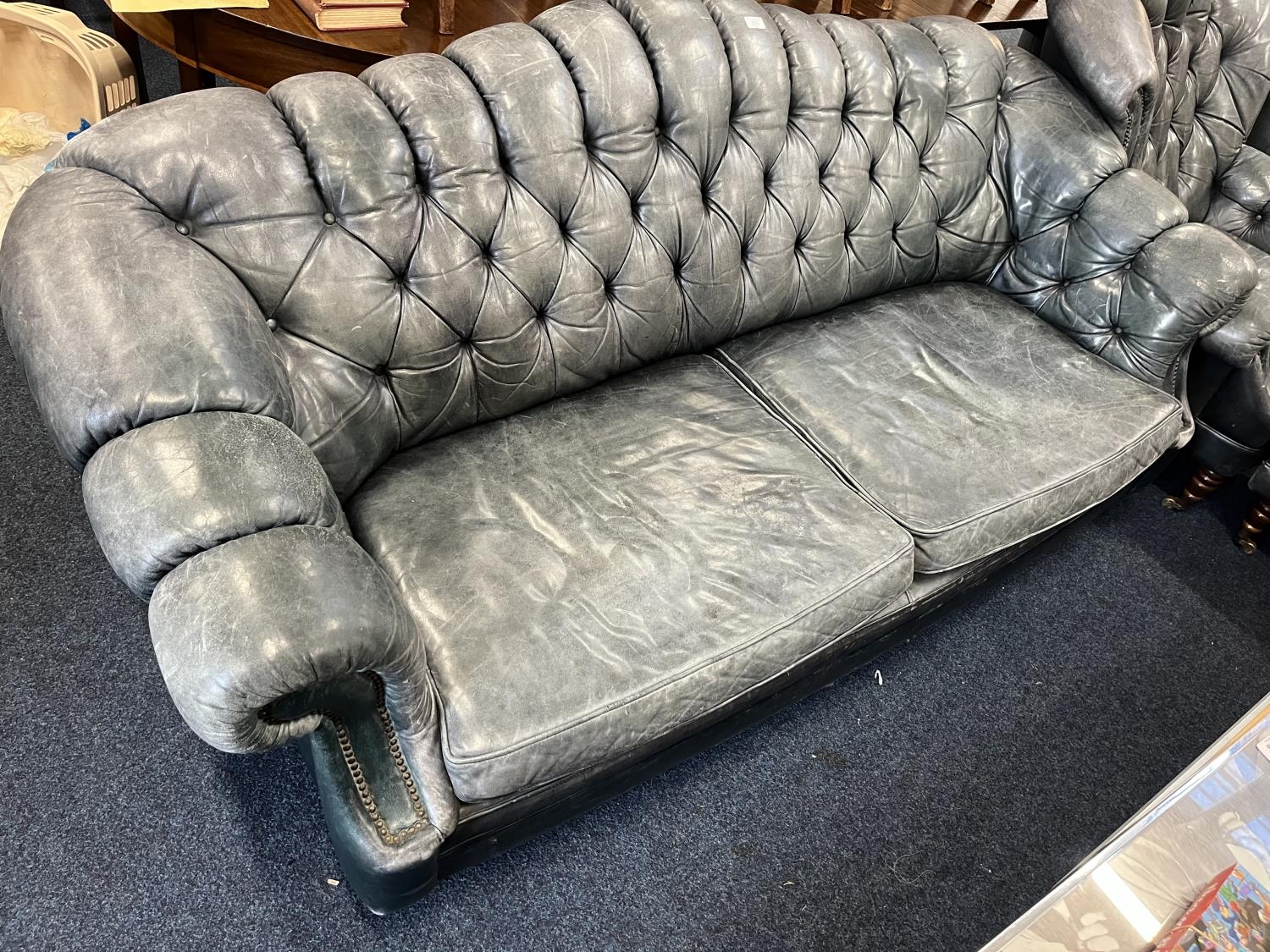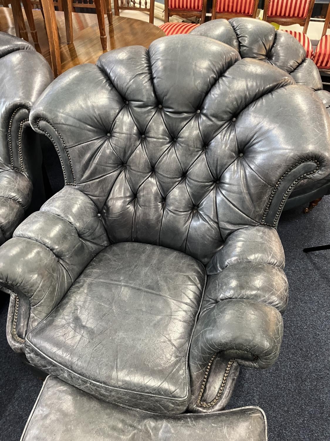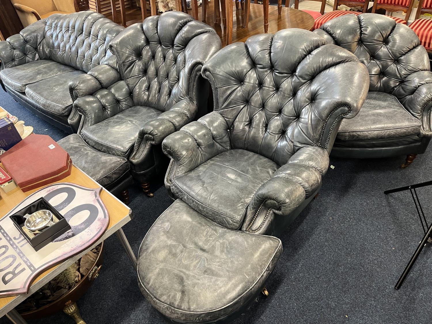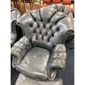 Chesterfield style green leather suite comprising sofa, two armchairs, a tub chair and two footstools.