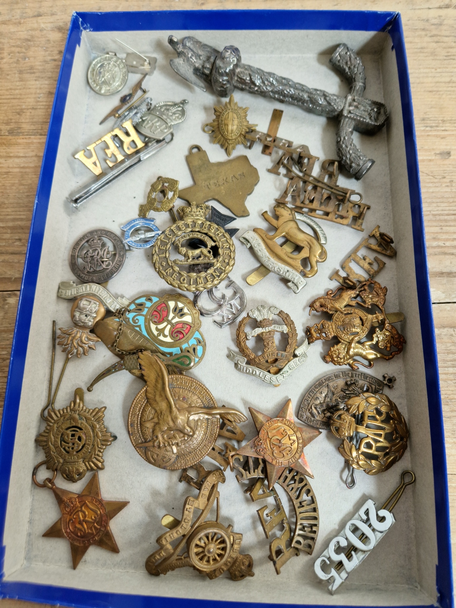A tray of military badges and related items, etc.