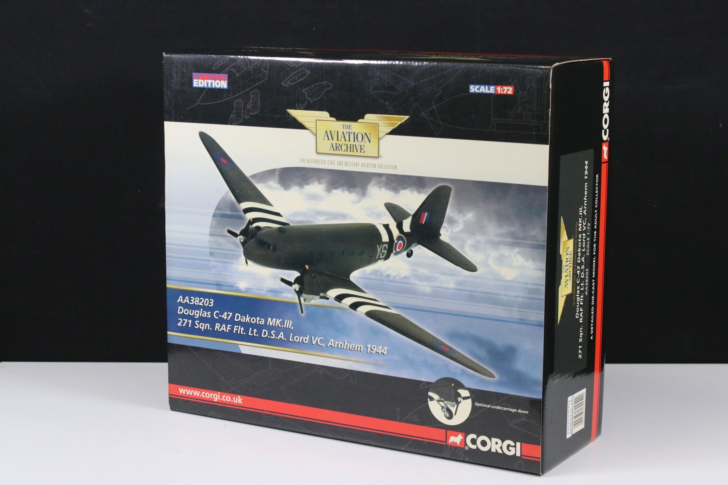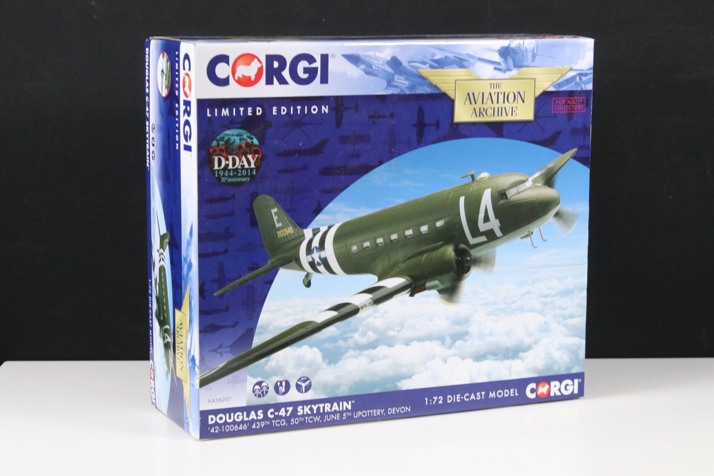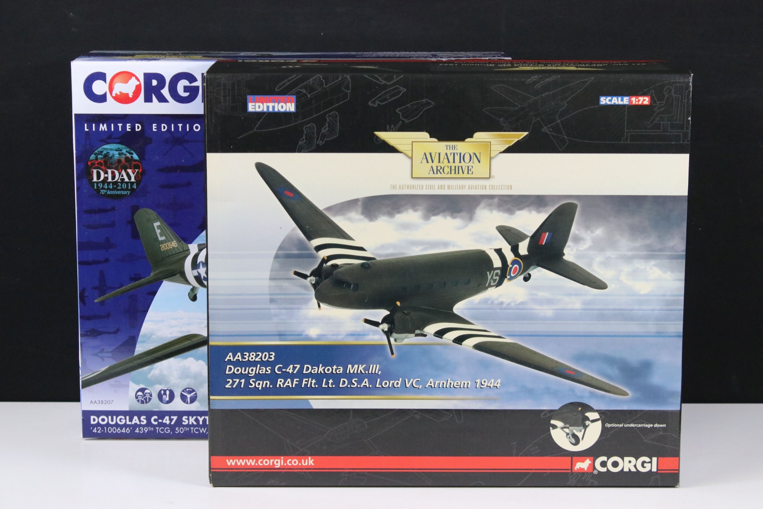 Two boxed 1/72 Corgi Aviation Archive diecast model aircraft to include AA38203 Douglas C-47 Dakota MK.III 271 Sqn RAF Flt. Lt. D.S.A. Lord VC Arnhem 1944 and AA38207 D-Day 70th Anniversary Douglas C-47 Skytrain 439th TCG 50th TCW June 5th Upottery Devon, all diecast ex and appearing complete, boxes vg overall