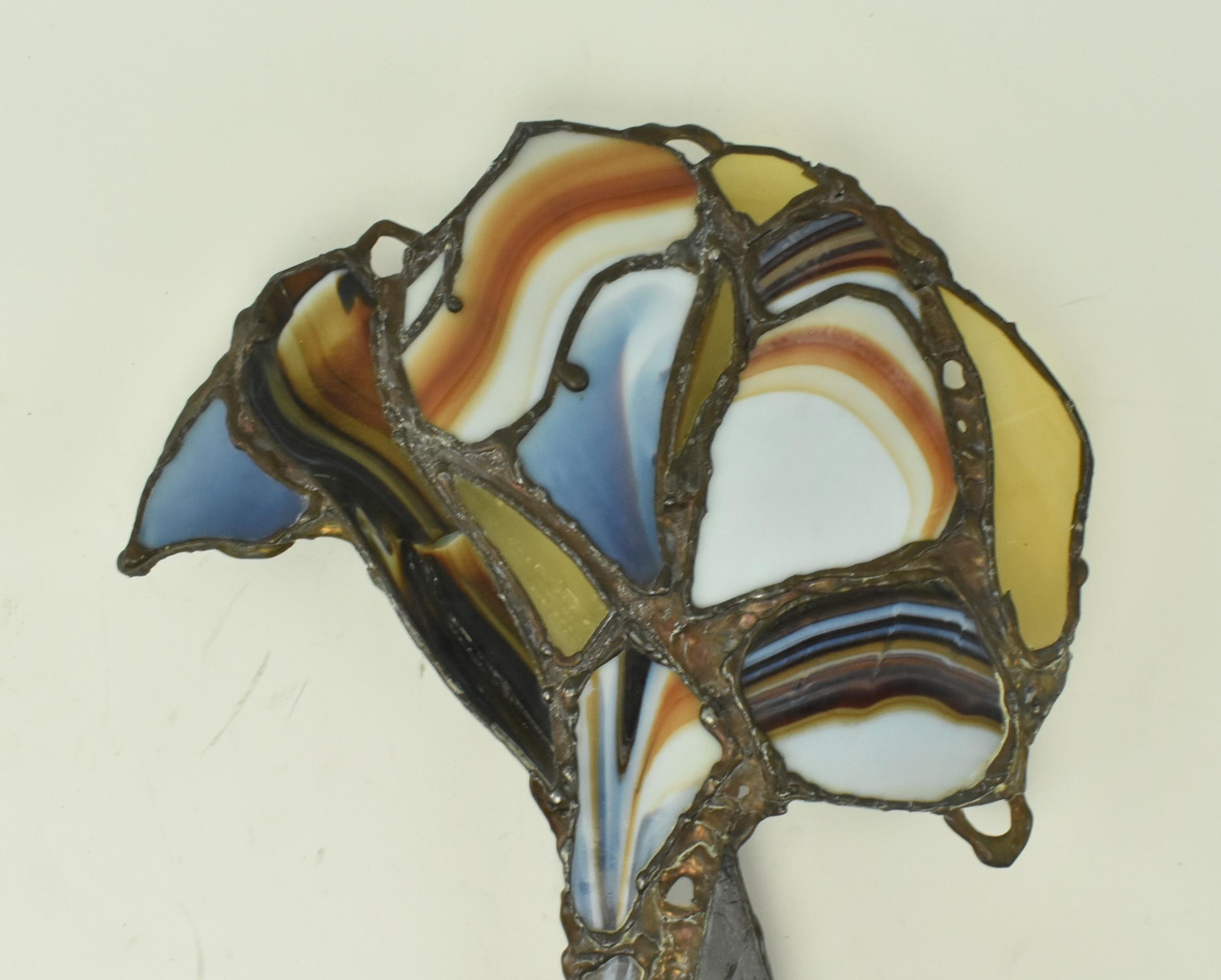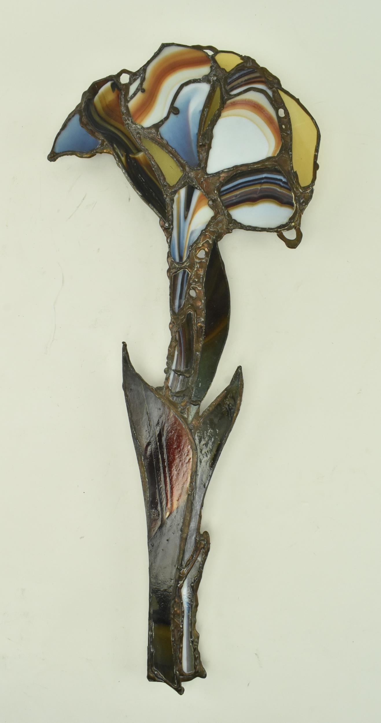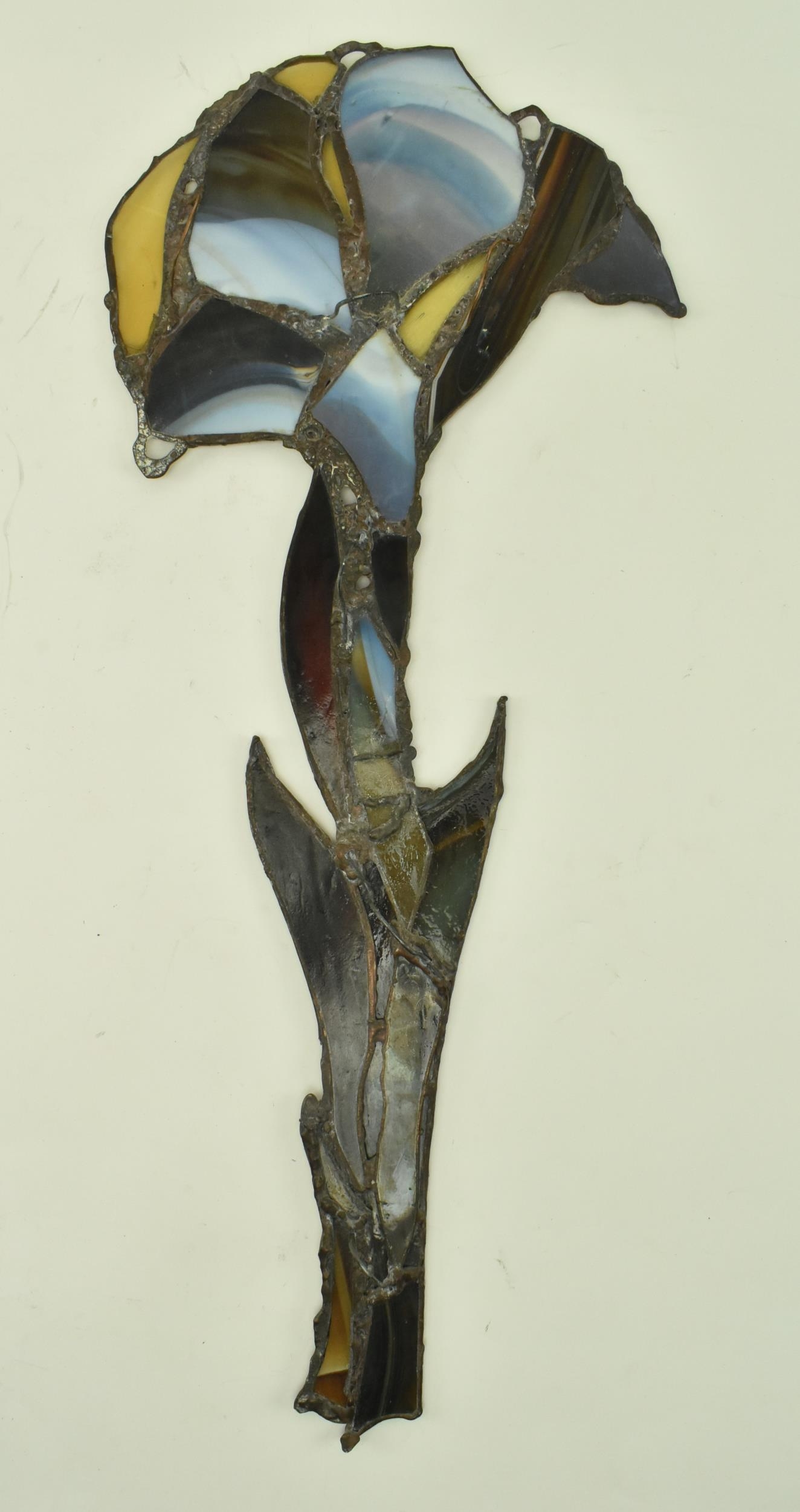 John Leathwood, Hull - An Art Nouveau style stained leaded glass decorative flower wall panel. The panel in polychrome glass, blue brown and white tones. Measures approx. 62cm tall x 26cm wide. Some general wear & damage due to age.