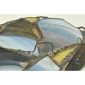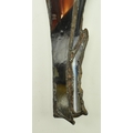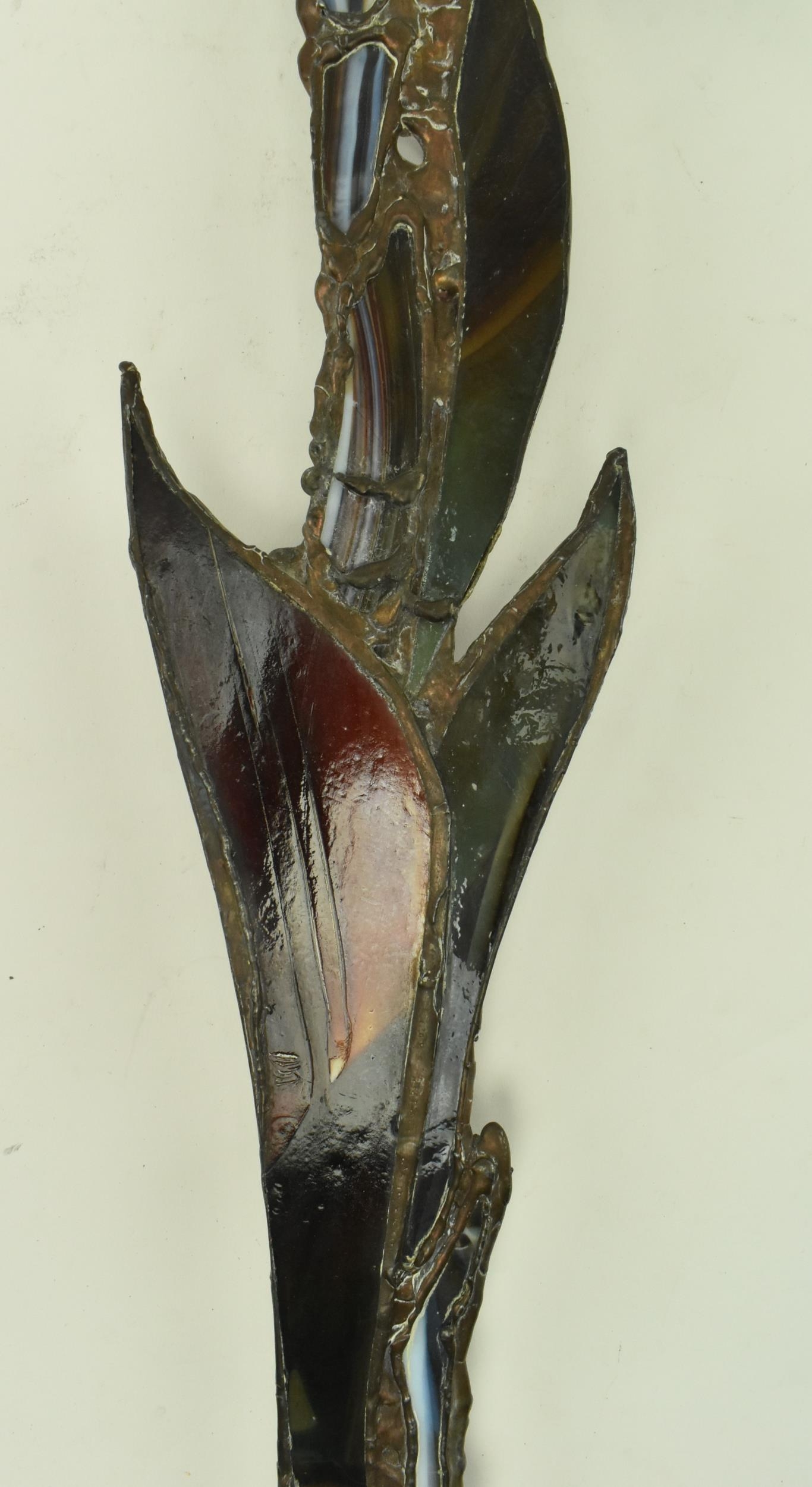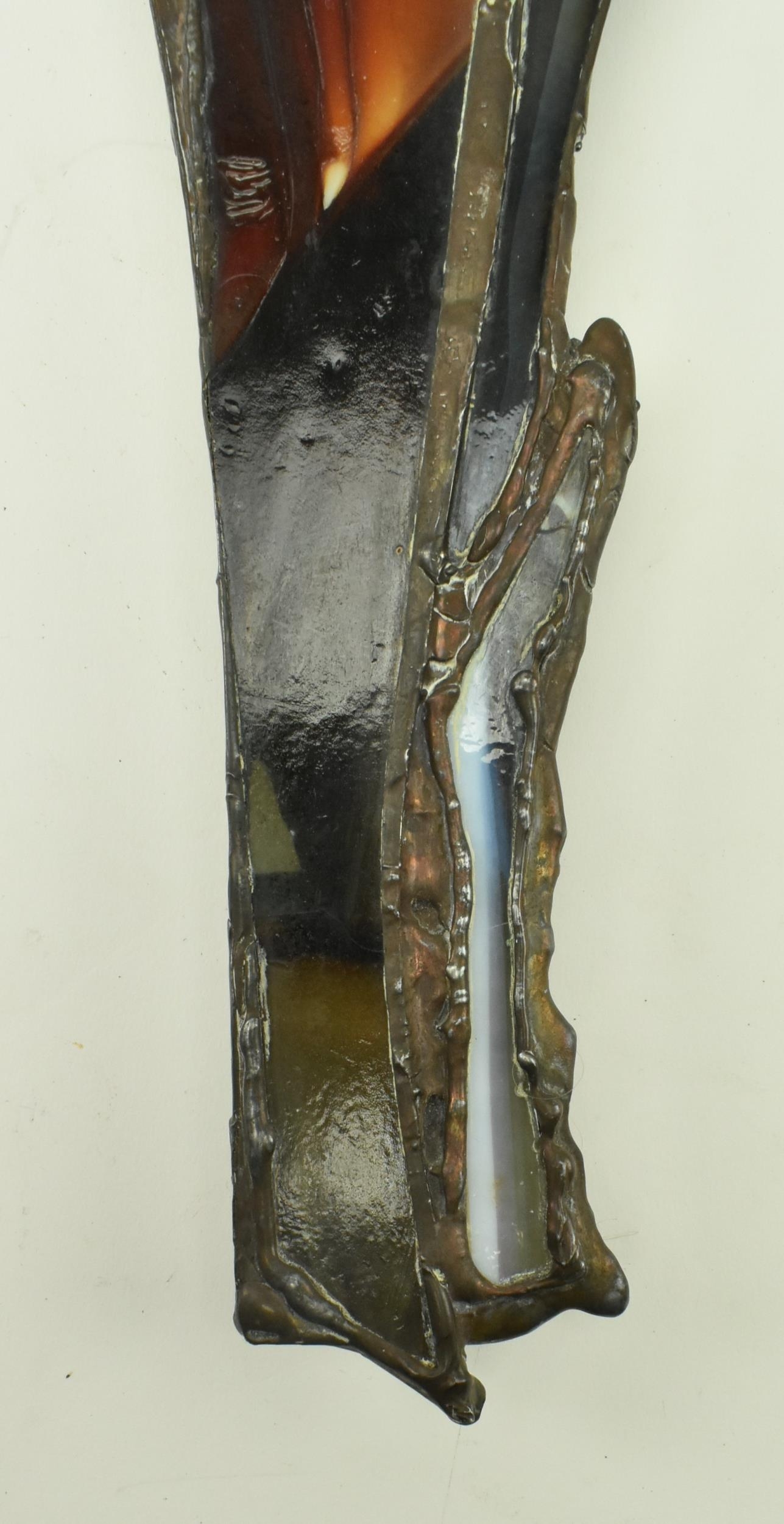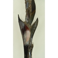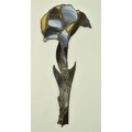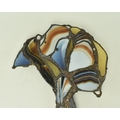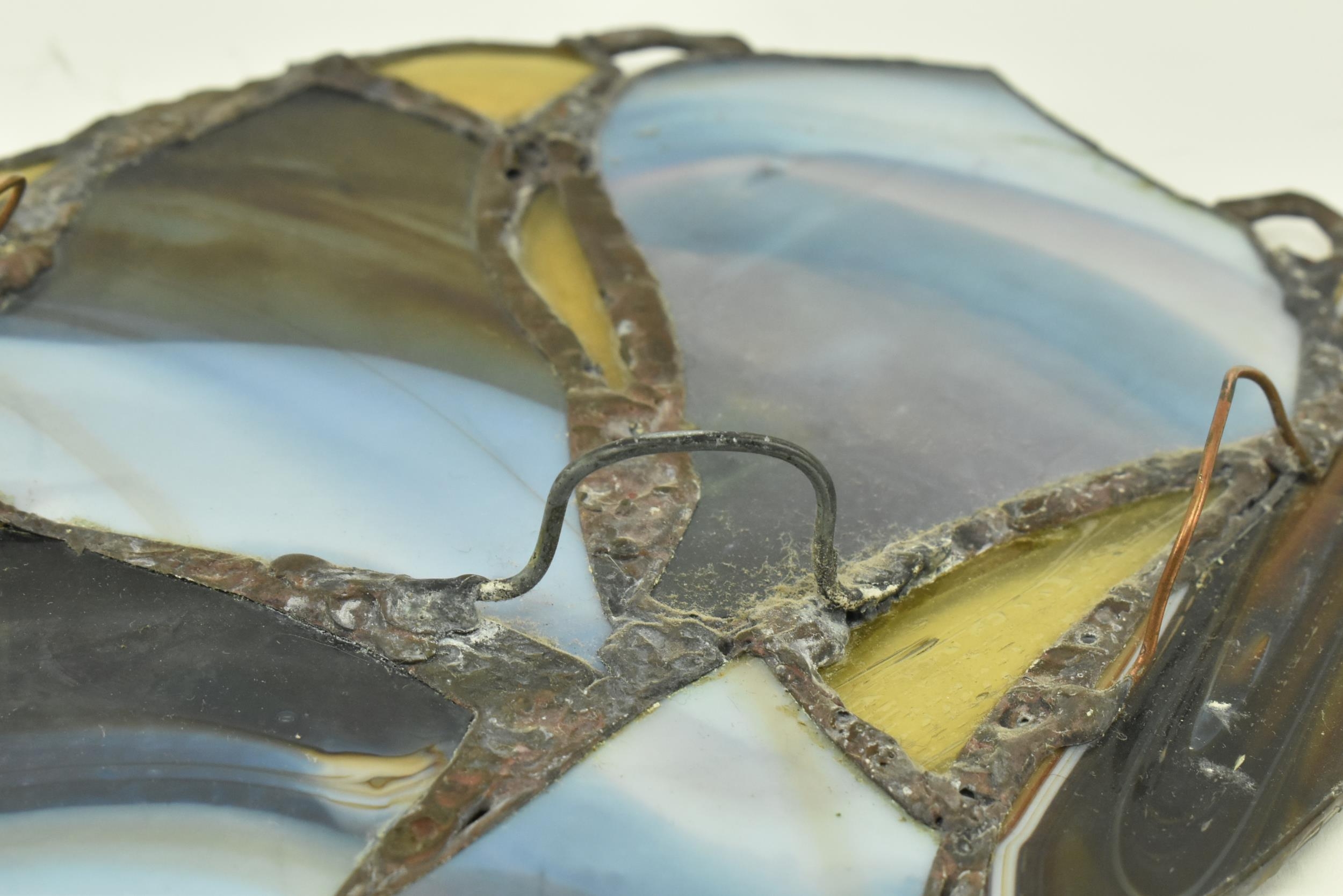 John Leathwood, Hull - An Art Nouveau style stained leaded glass decorative flower wall panel. The panel in polychrome glass, blue brown and white tones. Measures approx. 62cm tall x 26cm wide. Some general wear & damage due to age.