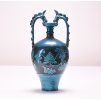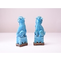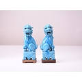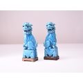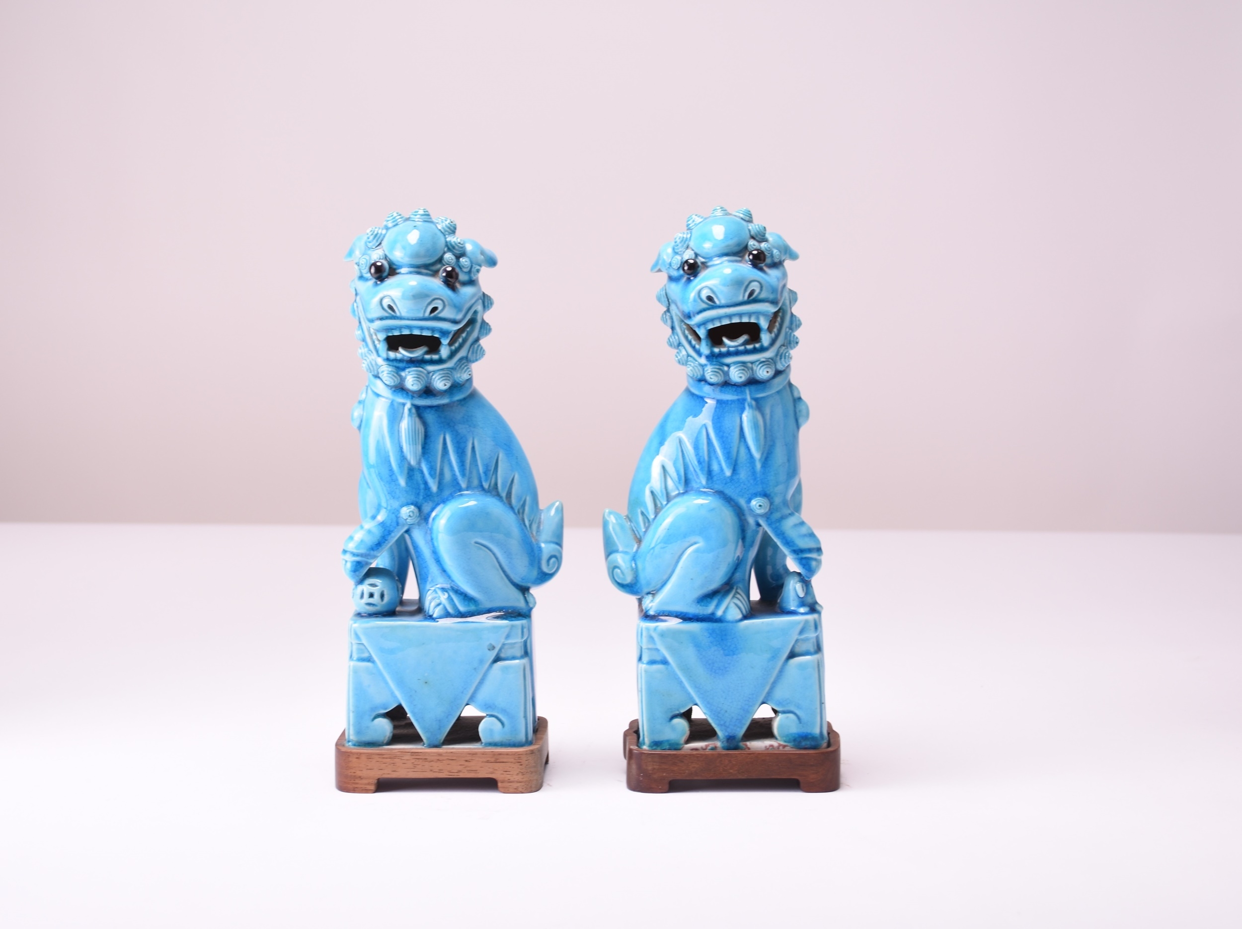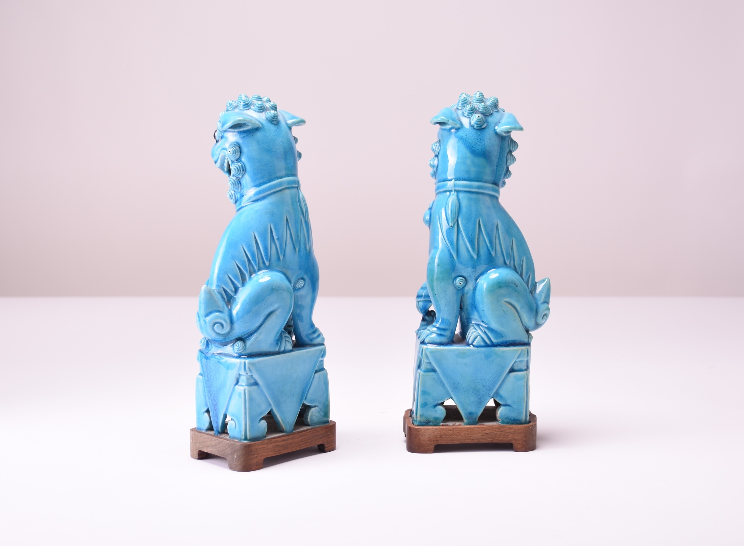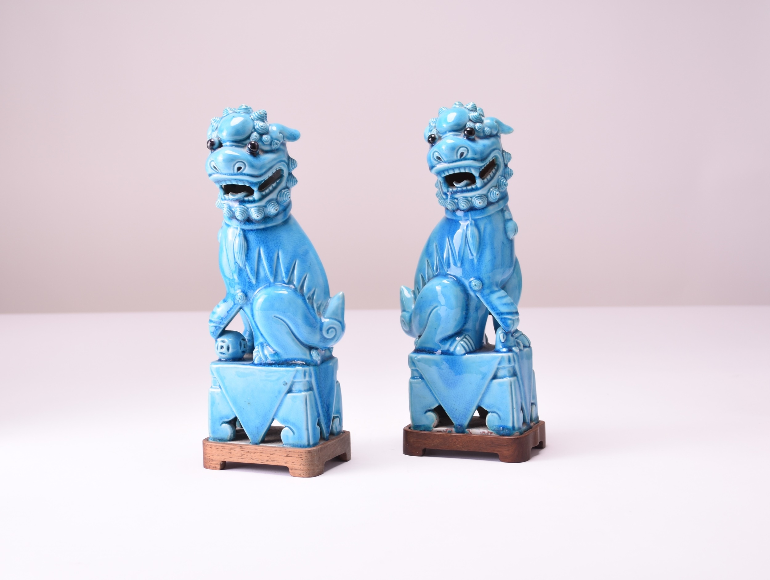 A pair of Chinese turquoise-glazed figures of guardian lions Early 20th century Modelled seated on shaped pedestals, with fitted rosewood bases. 26cm high (2) Property of a deceased estate in Shrewsbury.