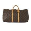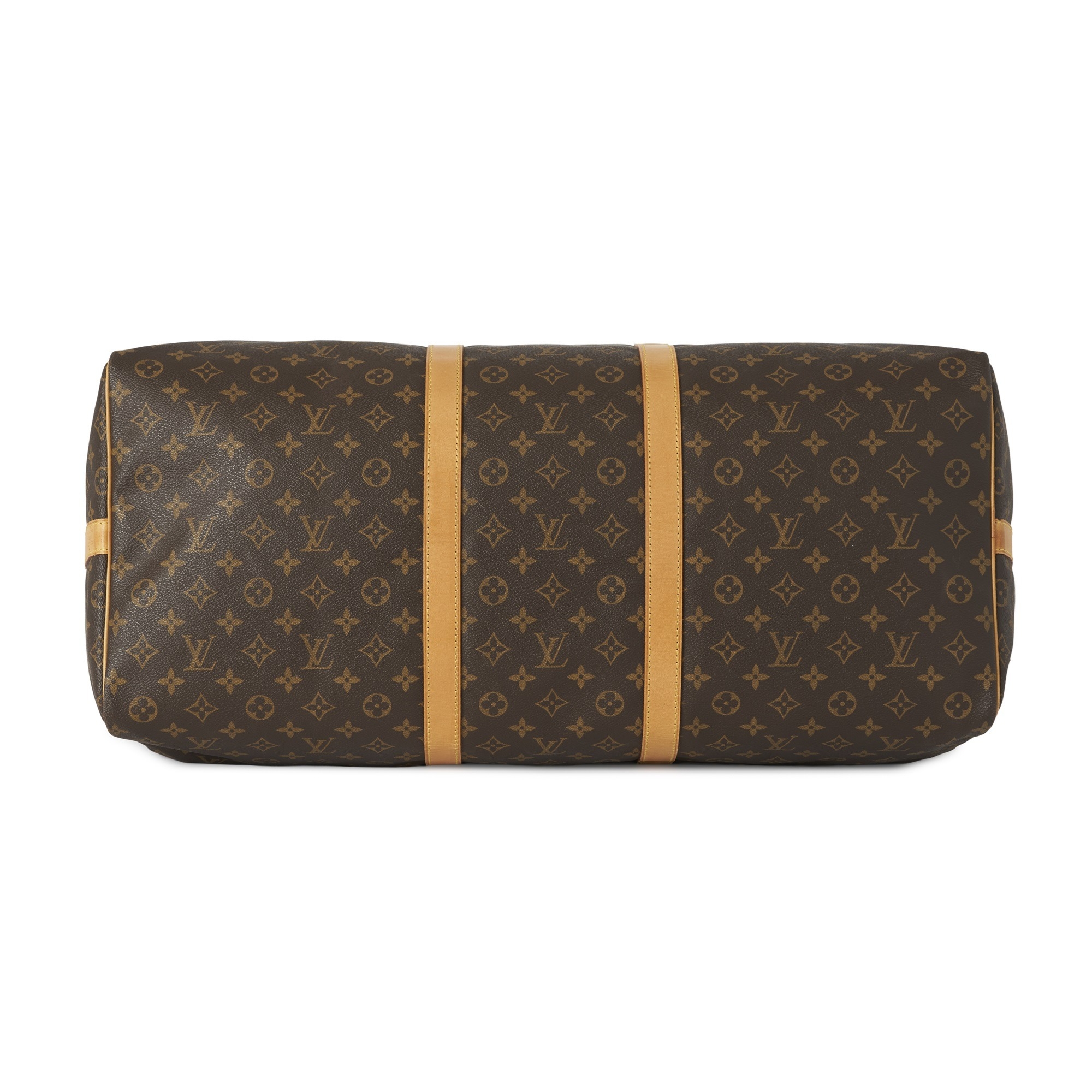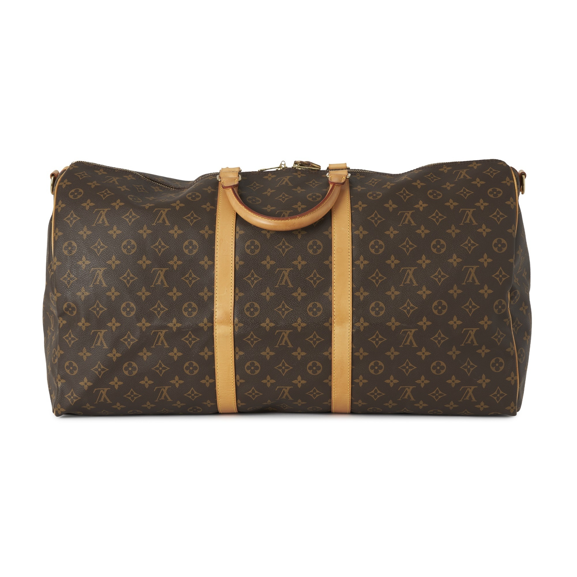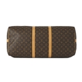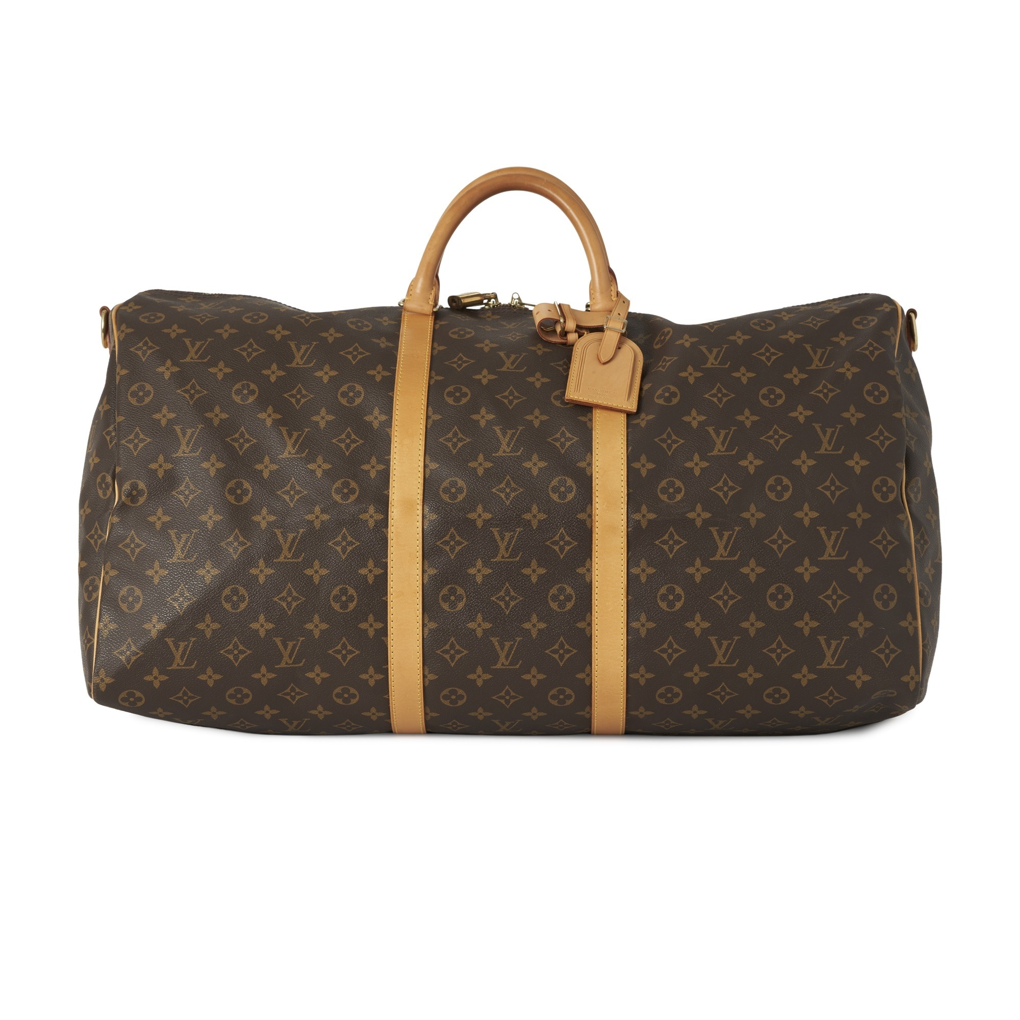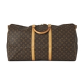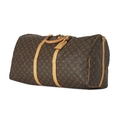 Louis Vuitton, a monogram Keepall Bandouliere 60 luggage bag, with natural leather trim, rolled leather handles, leather ID tag, and double top zip fastenings, deficient of shoulder strap, measuring 26 by 33 by 60cm, with maker's dust bag