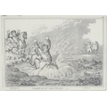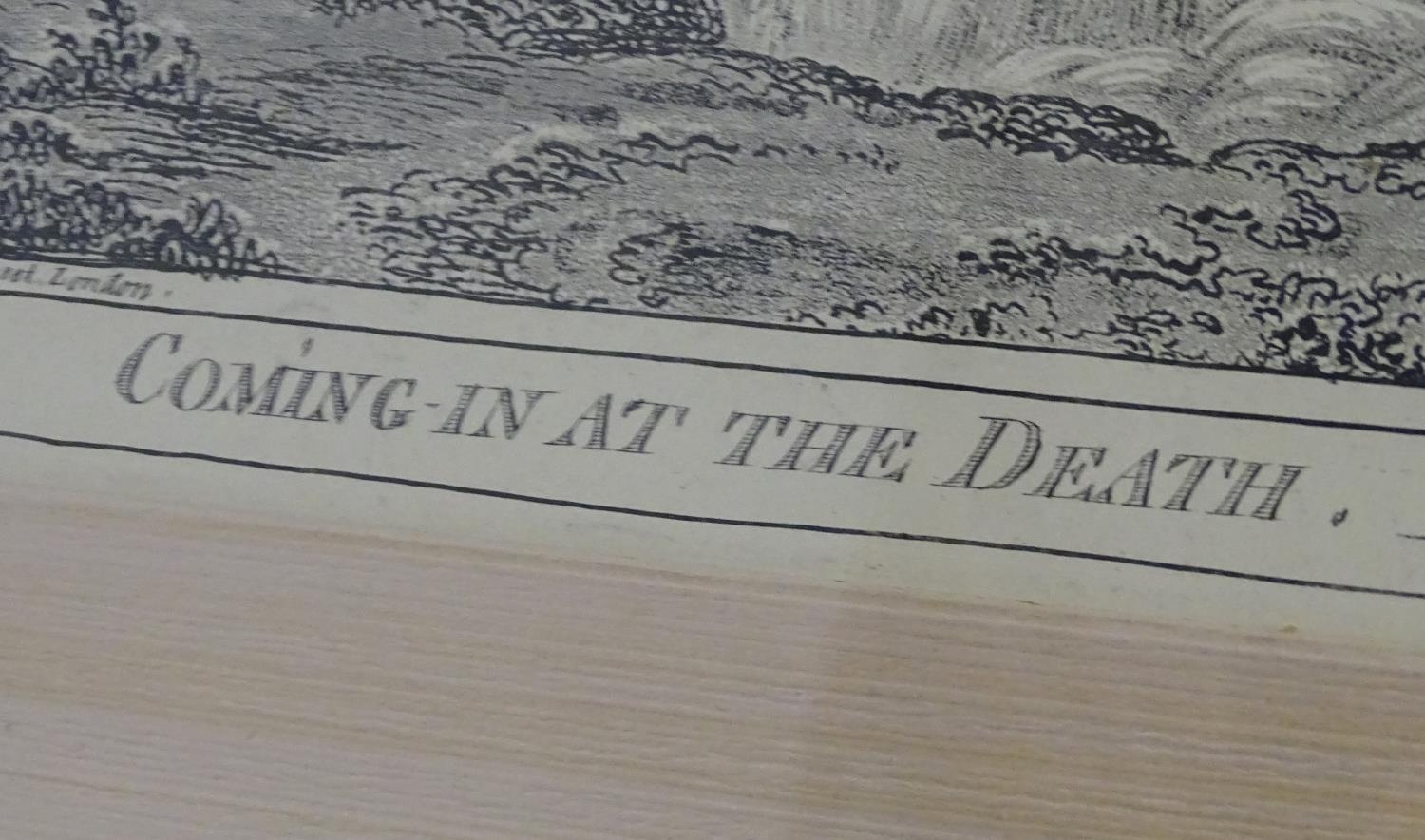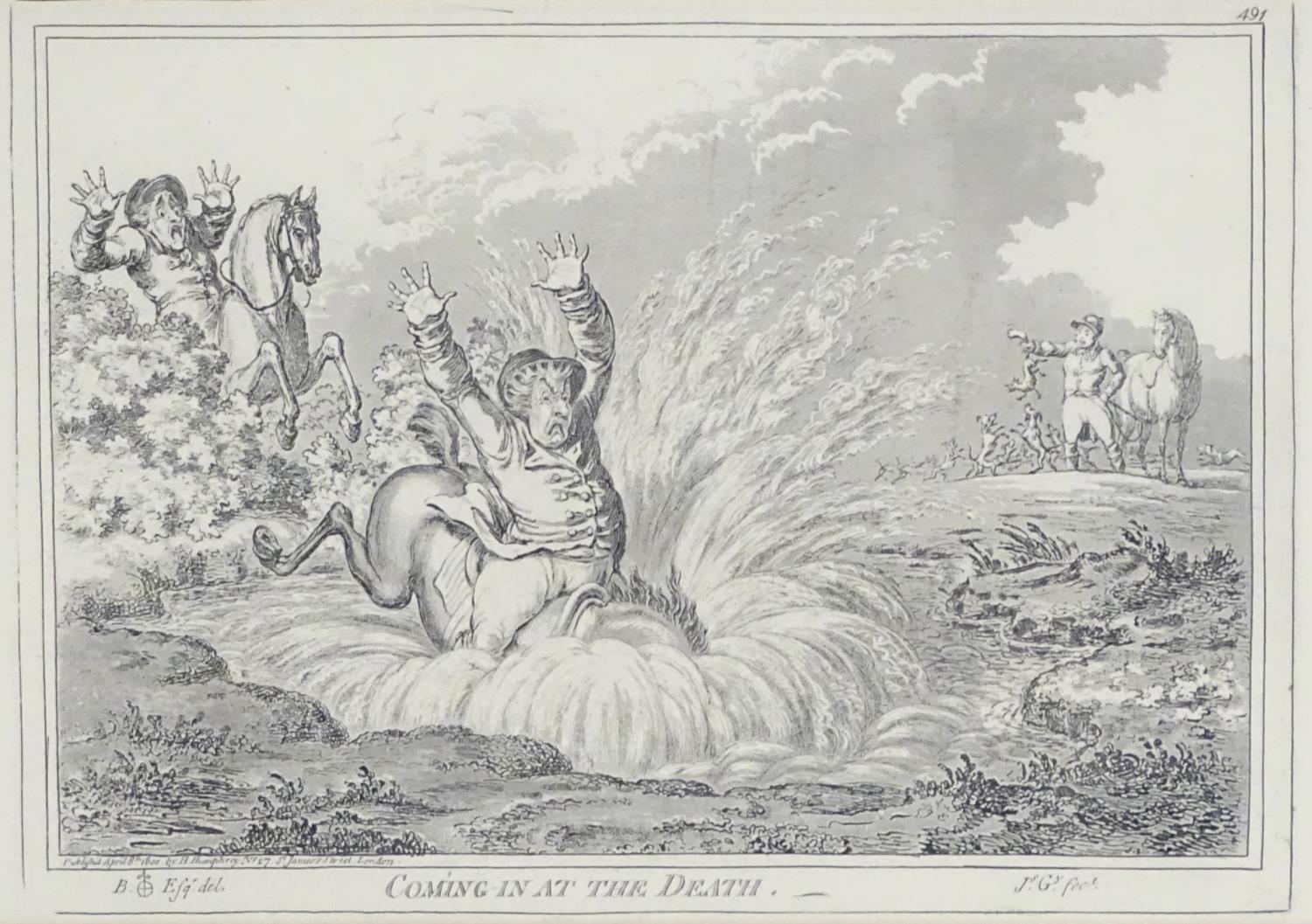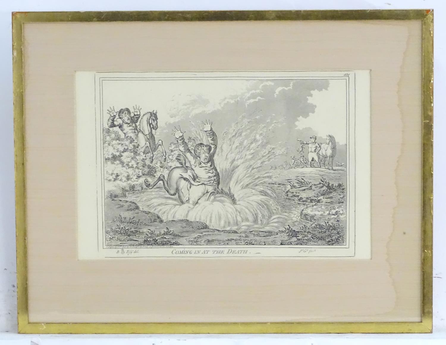 After James Gillray (1756-1815), Etching and aquatint, Coming in at the Death, A caricature / satirical depiction of a hunt. Published by H. Humprey, London 1800. Approx. 10" x 13 1/4"