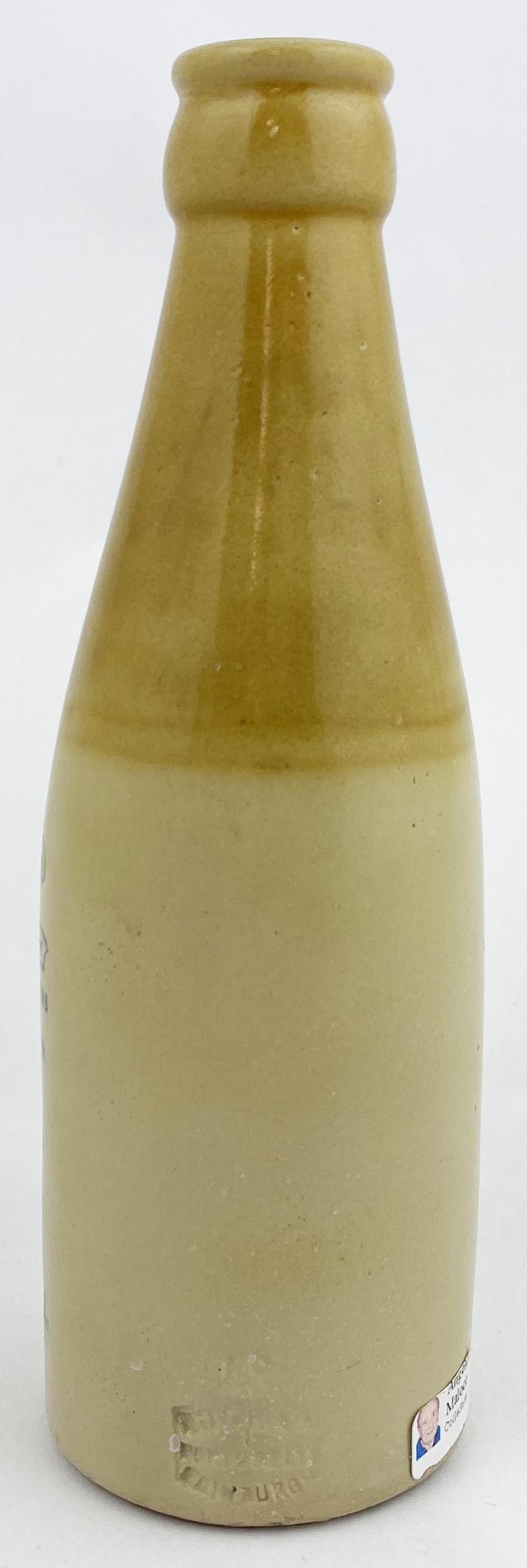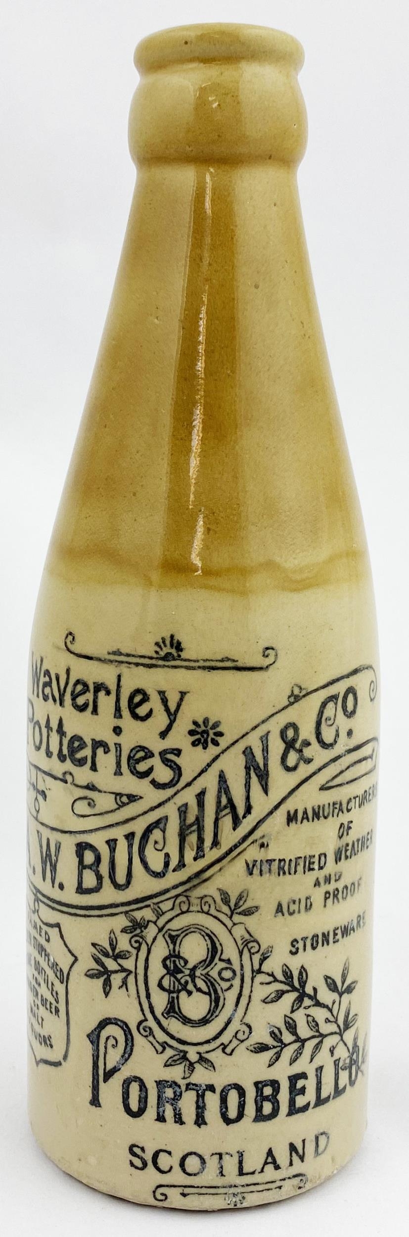BUCHAN SAMPLE GINGER BEER BOTTLE. 6.9ins tall, ch., t.t., c.c.. A very rare split size Buchan advertising ginger, restored body & middle transfer area (Simon Bennett job?). Perhaps a rare chance to own one of the top pottery sample rarities? Angelo Maloco Collection