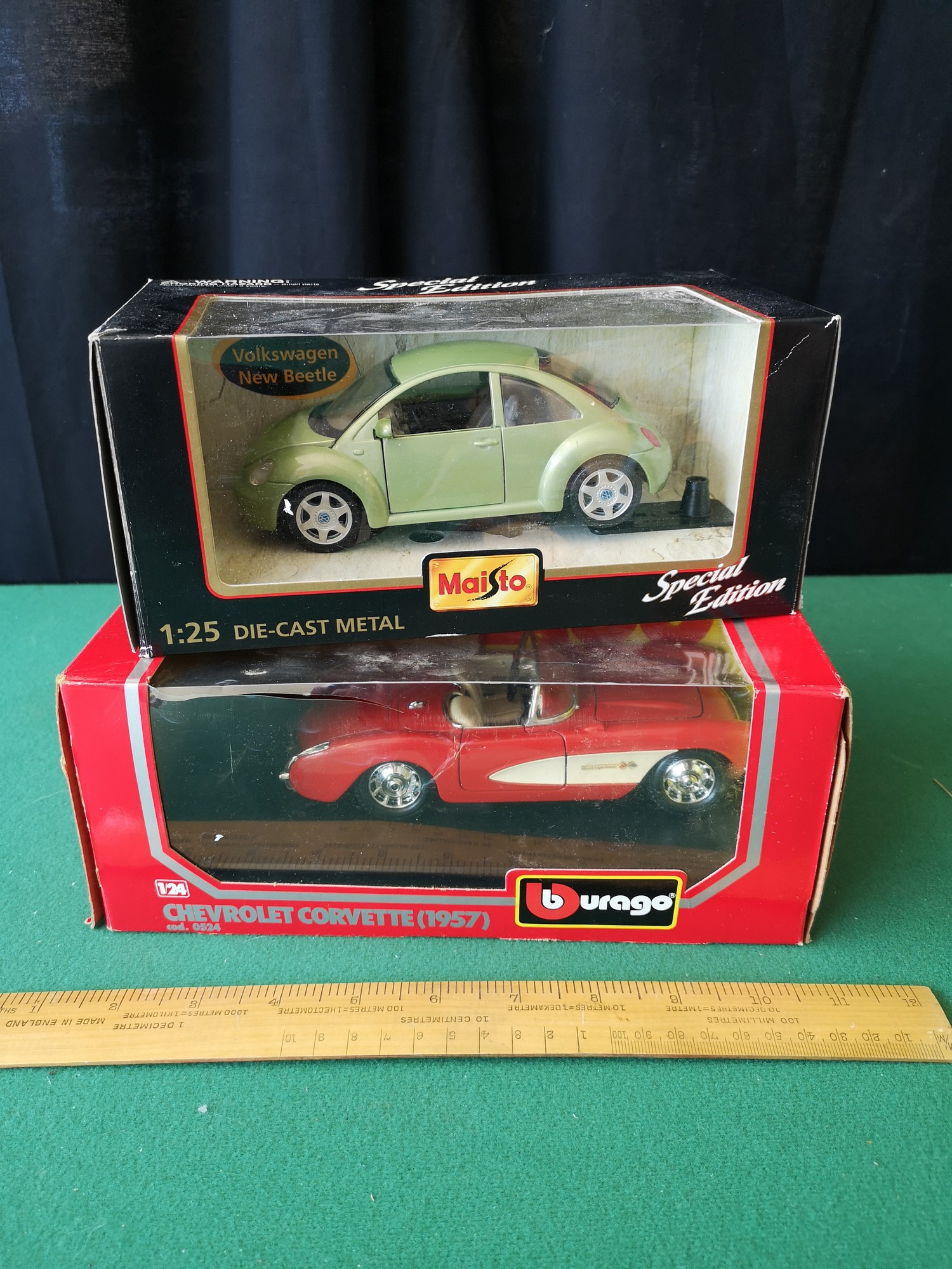Boxed burago chevrolet corvette 1957 model together maisto voltswagon beetle model.