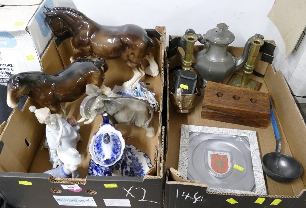Boxes of ornaments, Lladro, brassware etc
