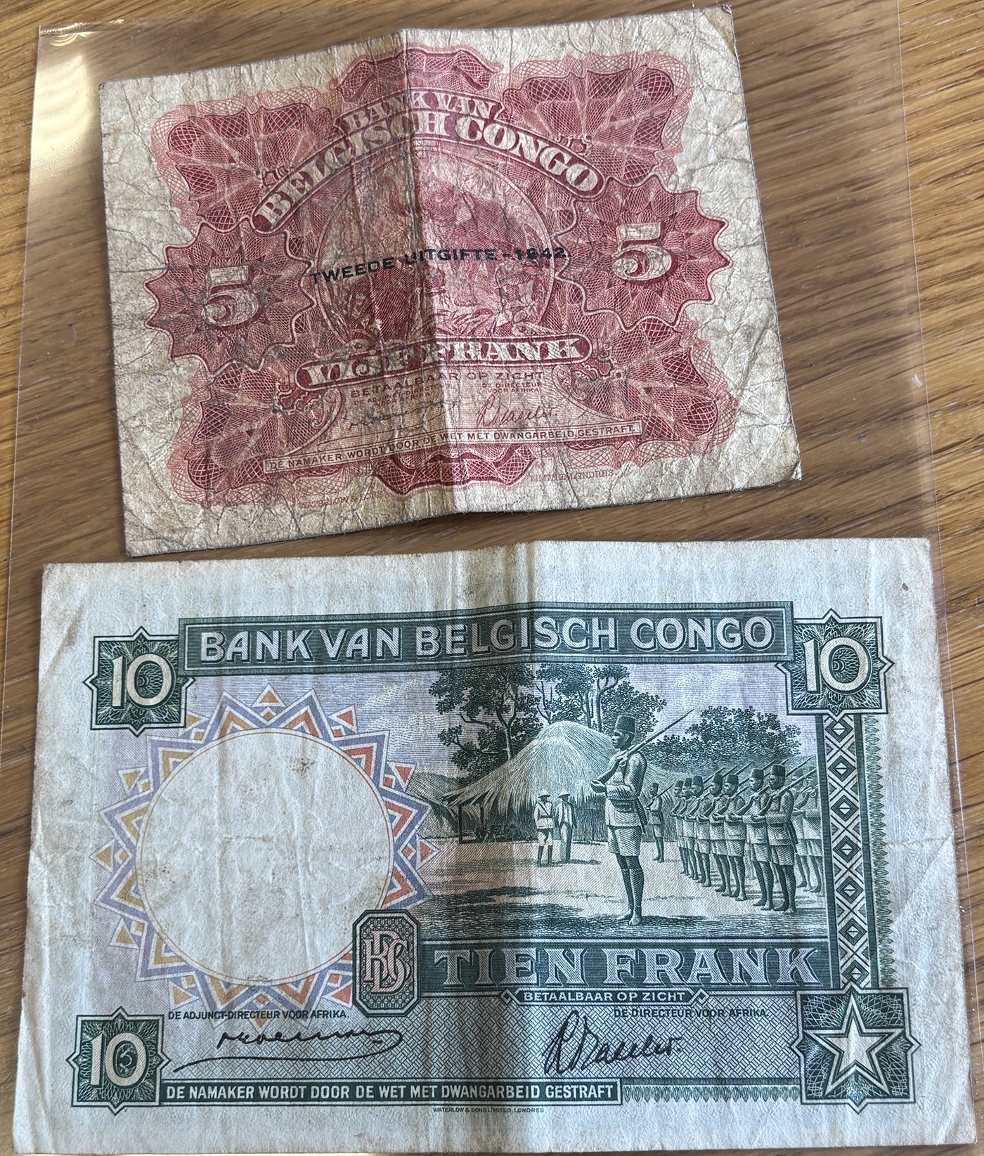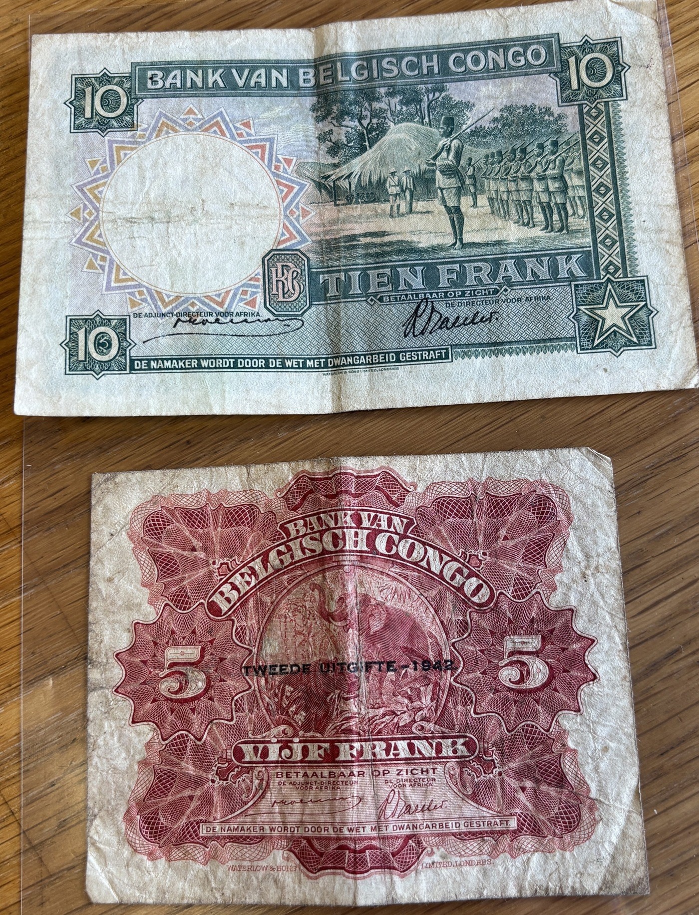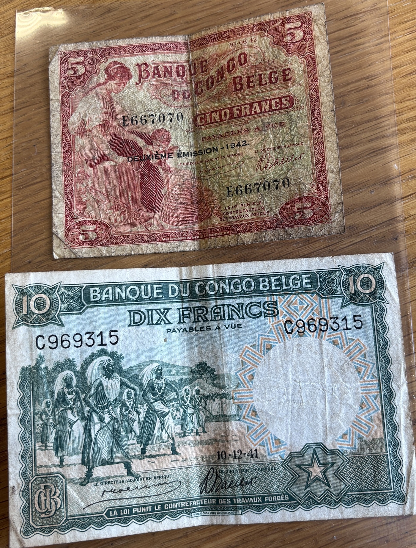 Belgian Congo. Range, generally good fine to very fine, with 1941 10Fr (10 Dec) C969315, E237136, 1942 5Fr (10 June) A070833, E667070 with Emission 1942 overprint. Qty 4 (N)