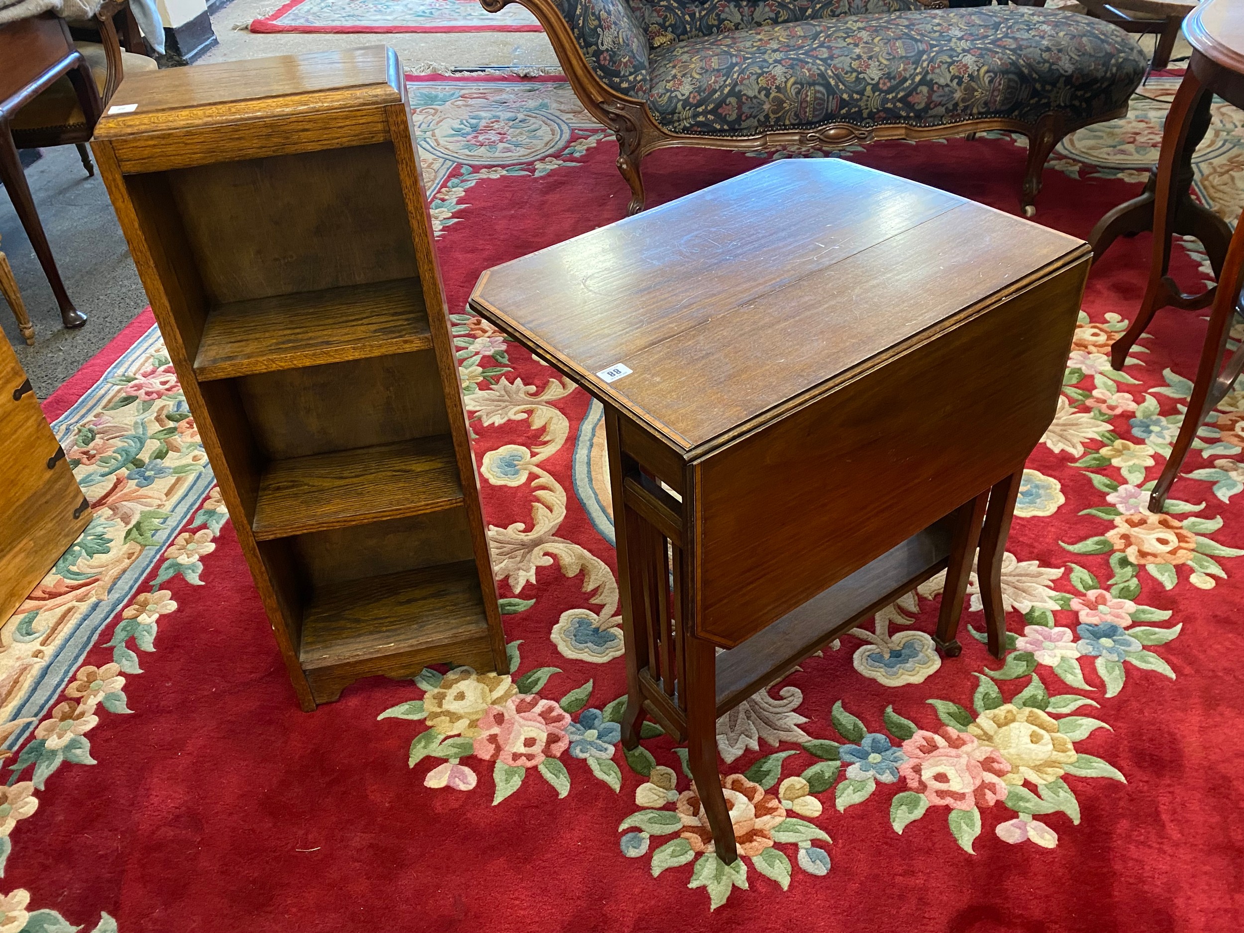 An Edwardian mahogany and satinwood crossbanded Sutherland table fitted two rectangular drop flaps, vertical splats to the ends united by undertier, on splayed legs - 23 1/2in. wide and an oak openfront bookcase - 12in. wide