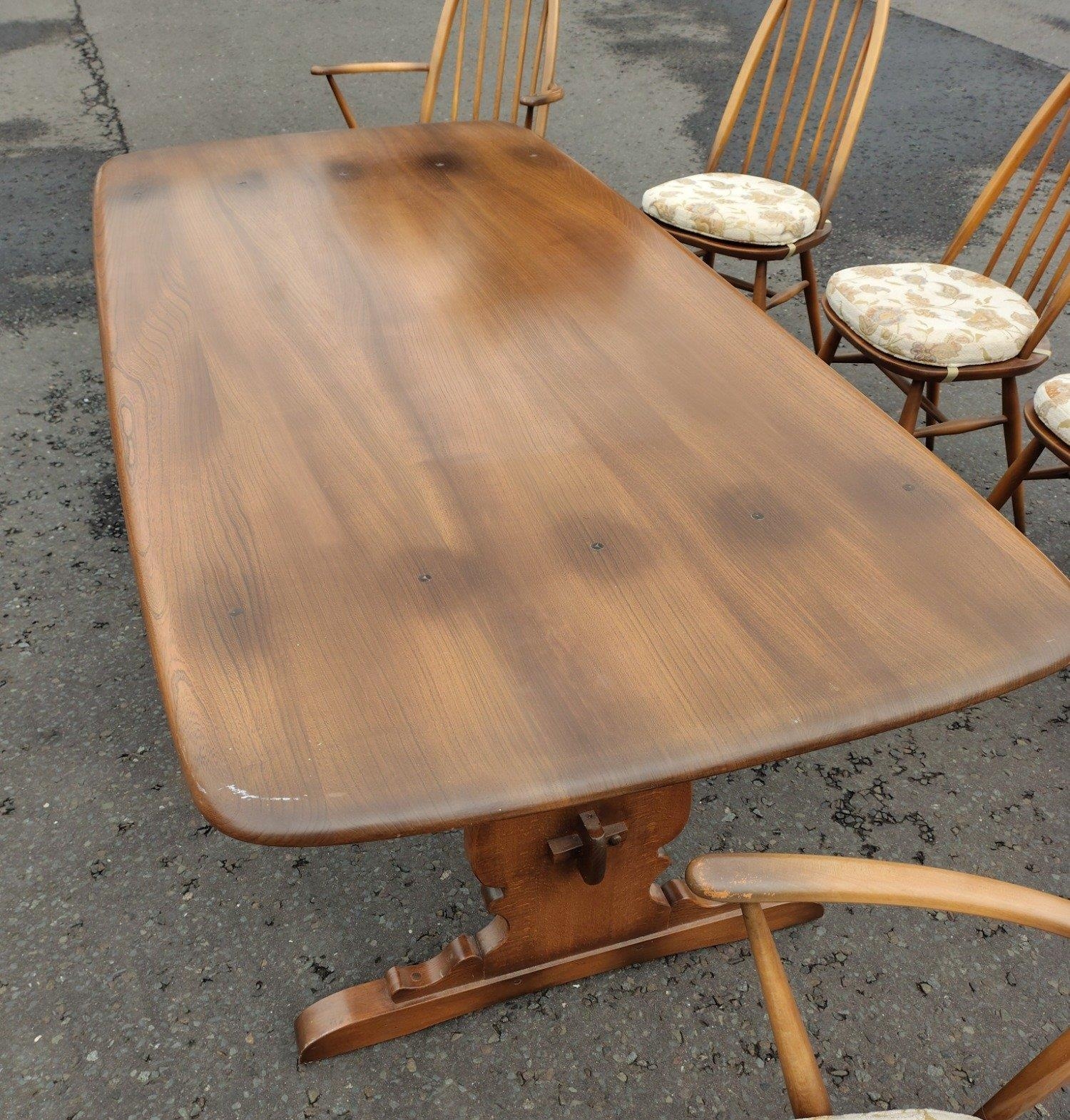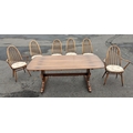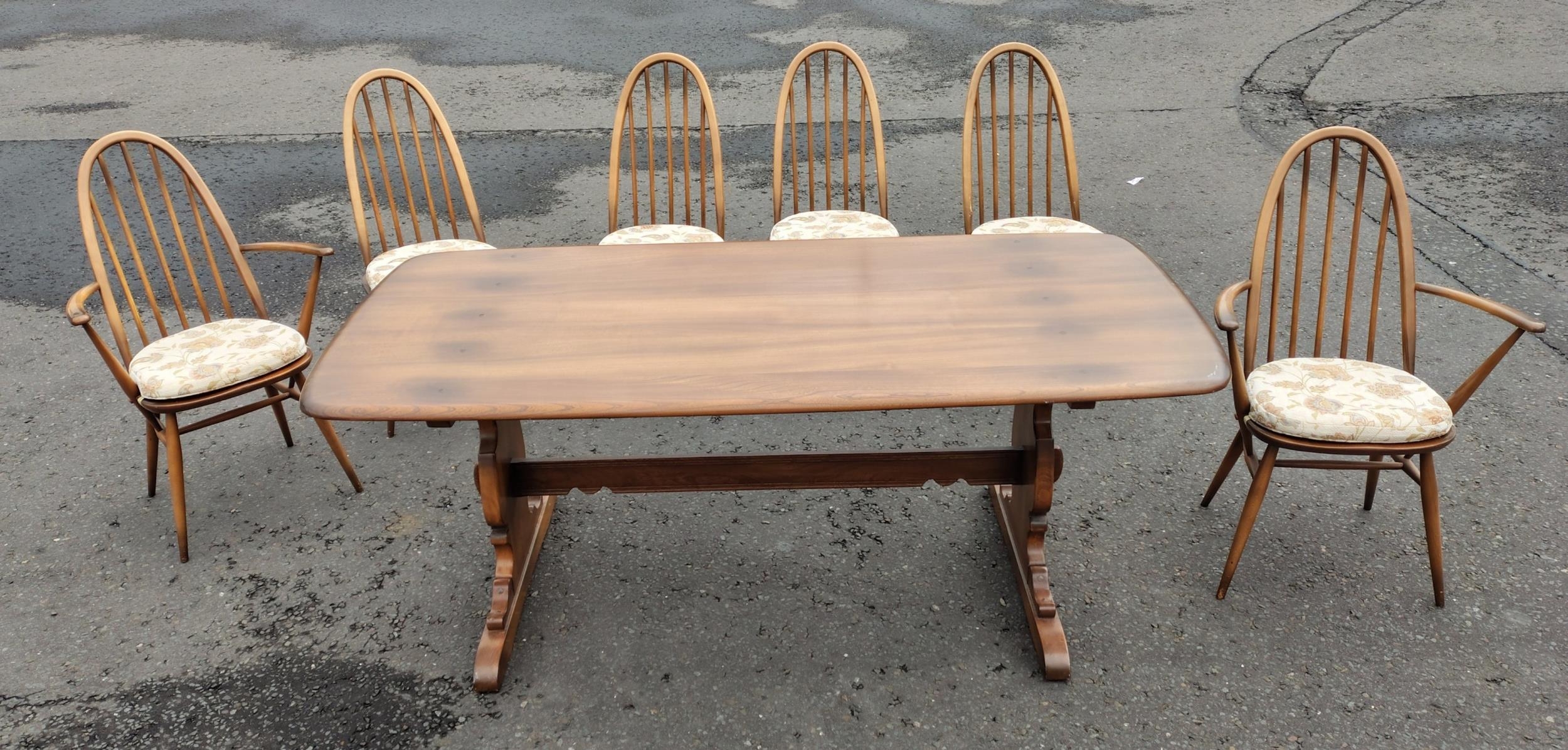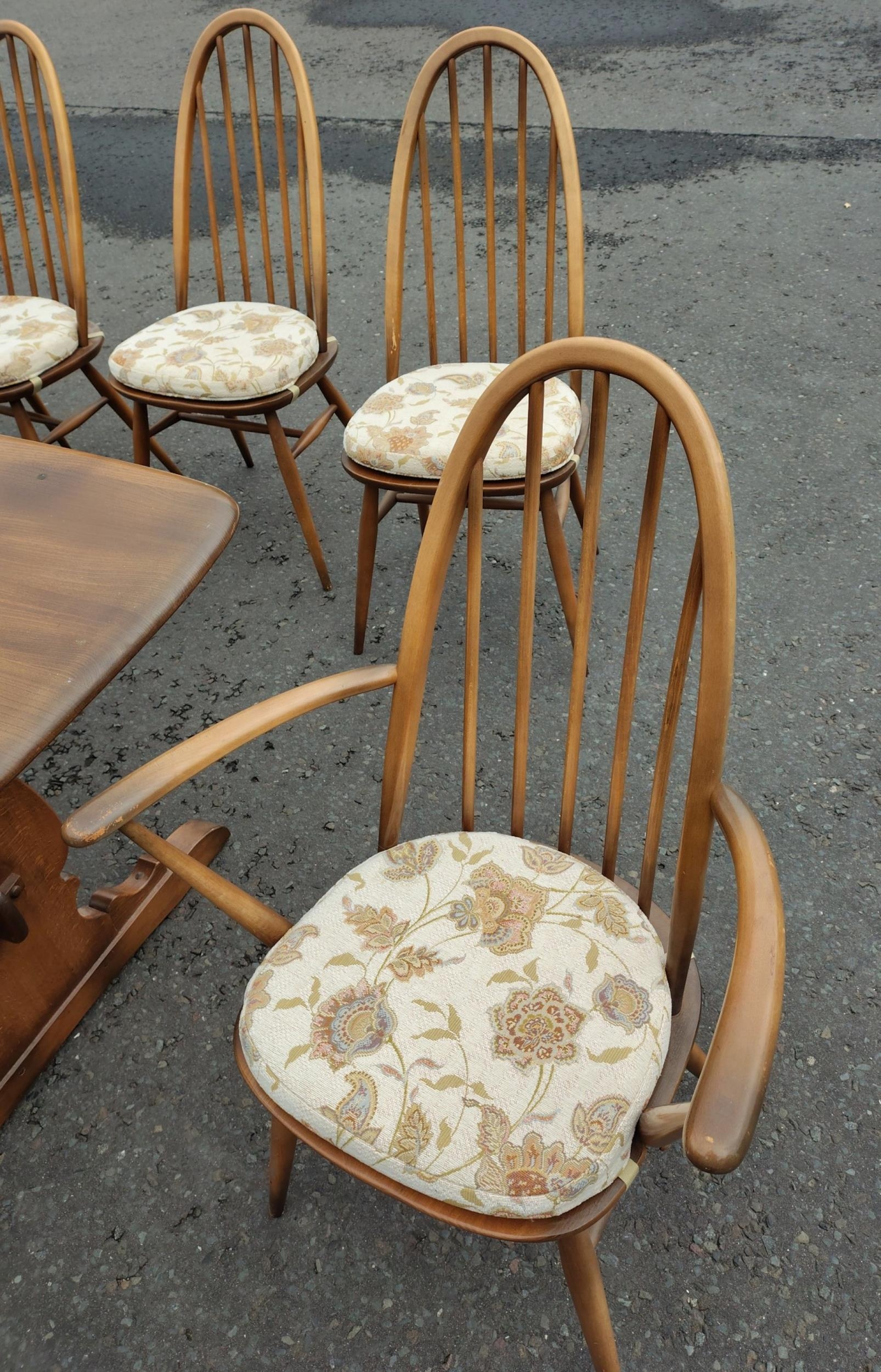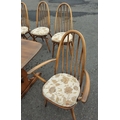 ERCOL six place dining table with chairs. All in good condition. Chairs with detachable light cream seat pads. Table is 178cm wide approx.