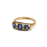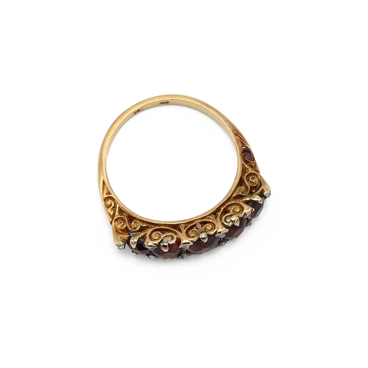 A Victorian 18ct yellow gold garnet seven stone ring, with rose cut diamond accents, ring size O1/2, total gross weight approximately 4g. (J)