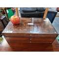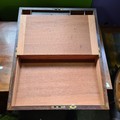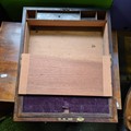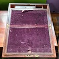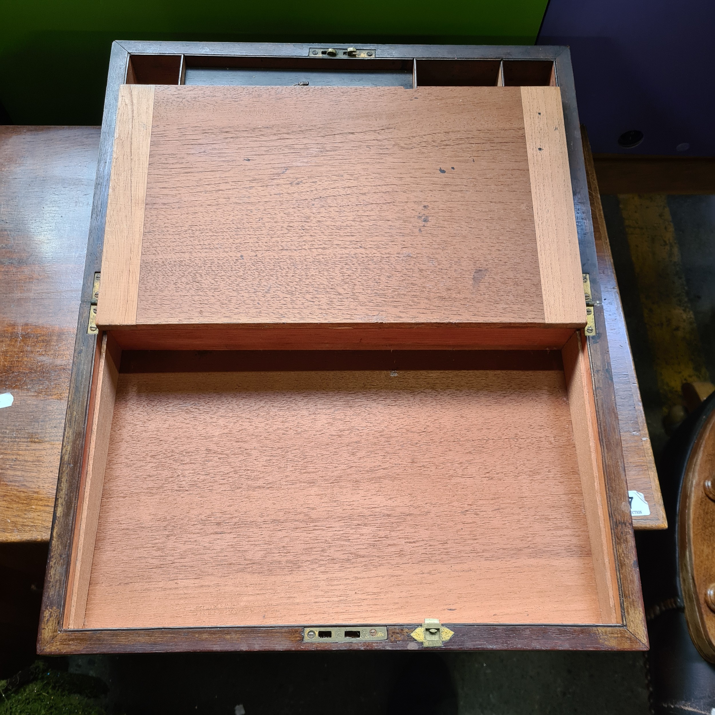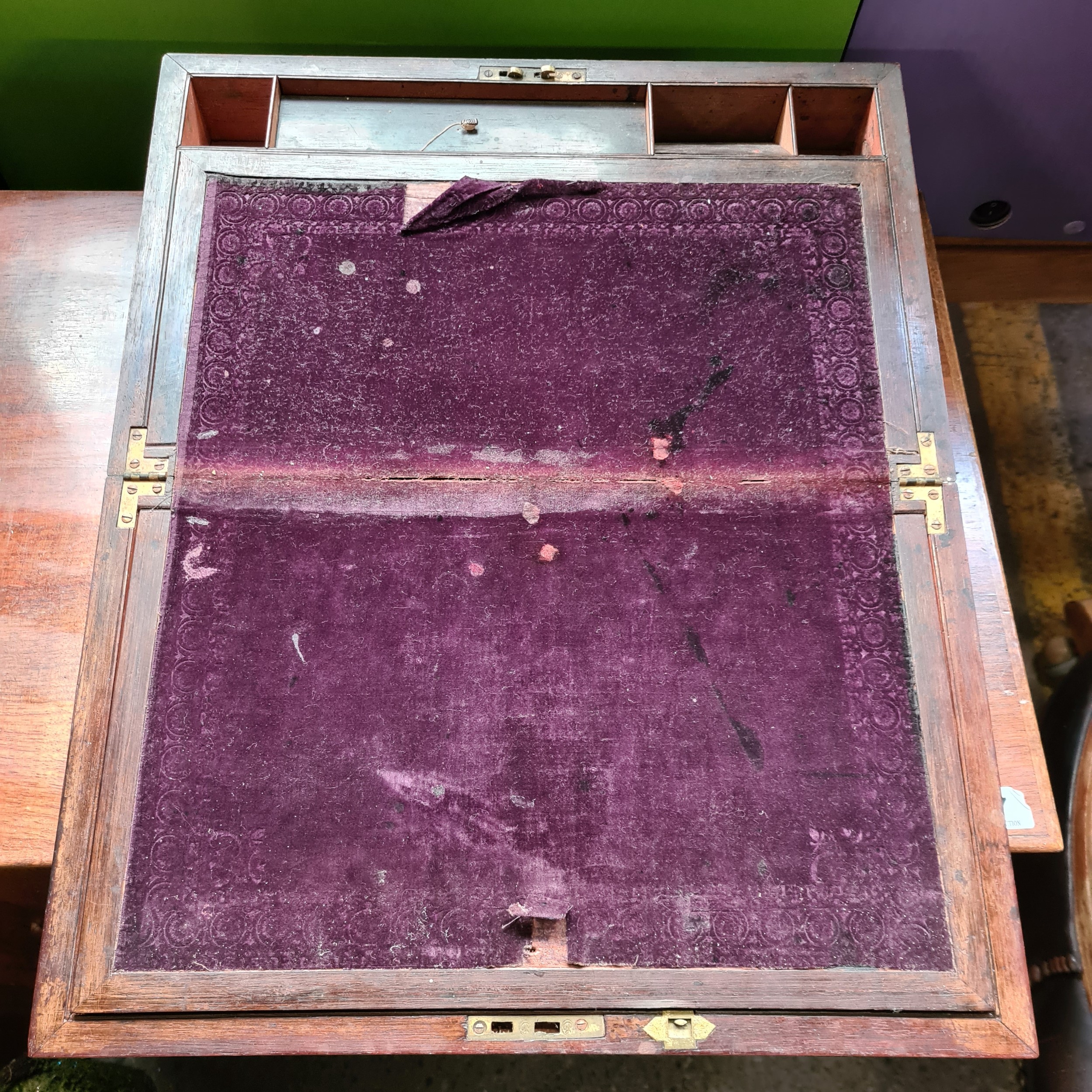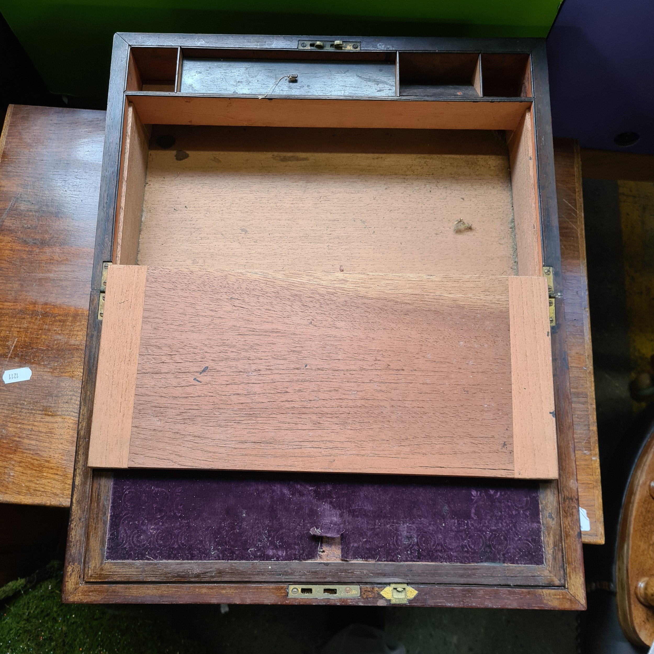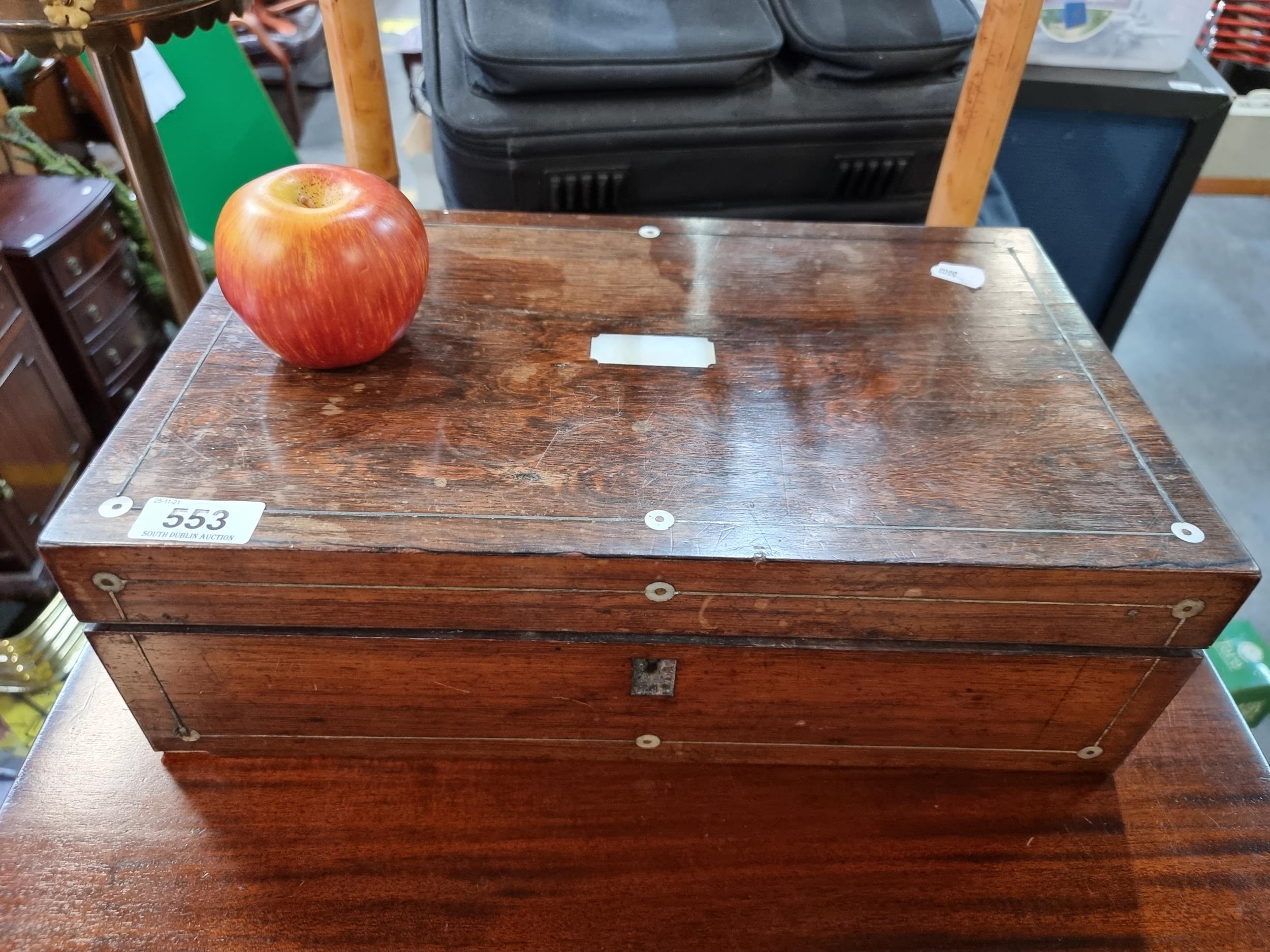 An antique wooden writing box with mother of pearl detailing. It opens to reveal a velvet covered writing slope and four stationary partitions. Lovely piece.