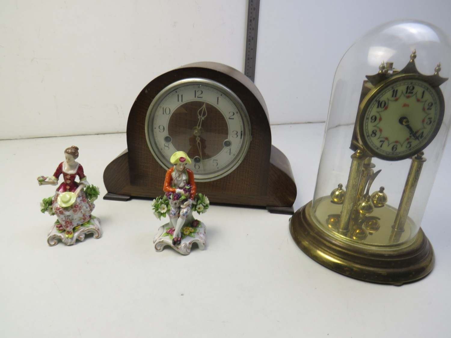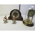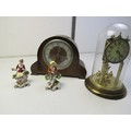 Two clocks and two staffordshire style figures includes a domed anniversary clock and a three key hole mantle clock