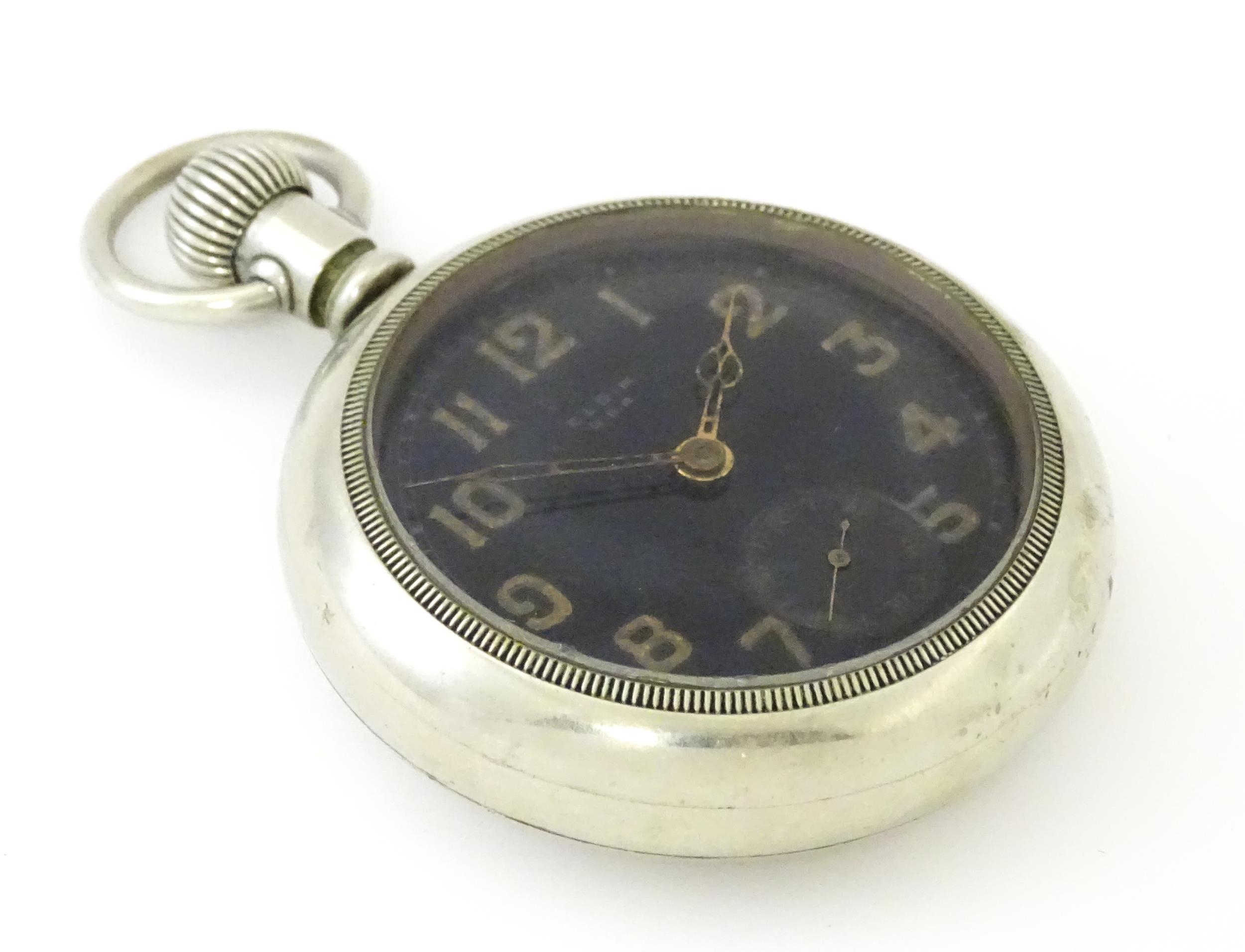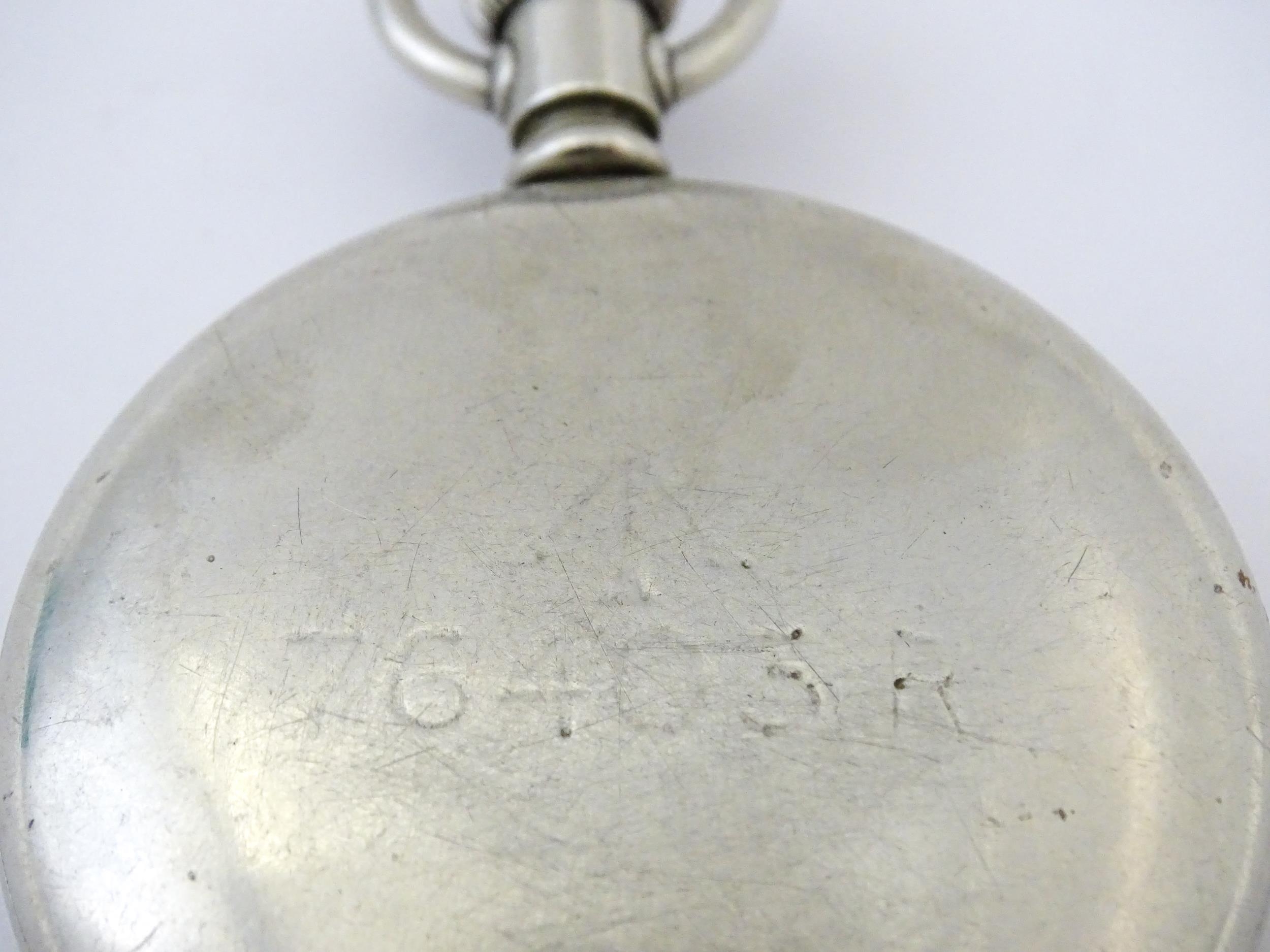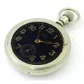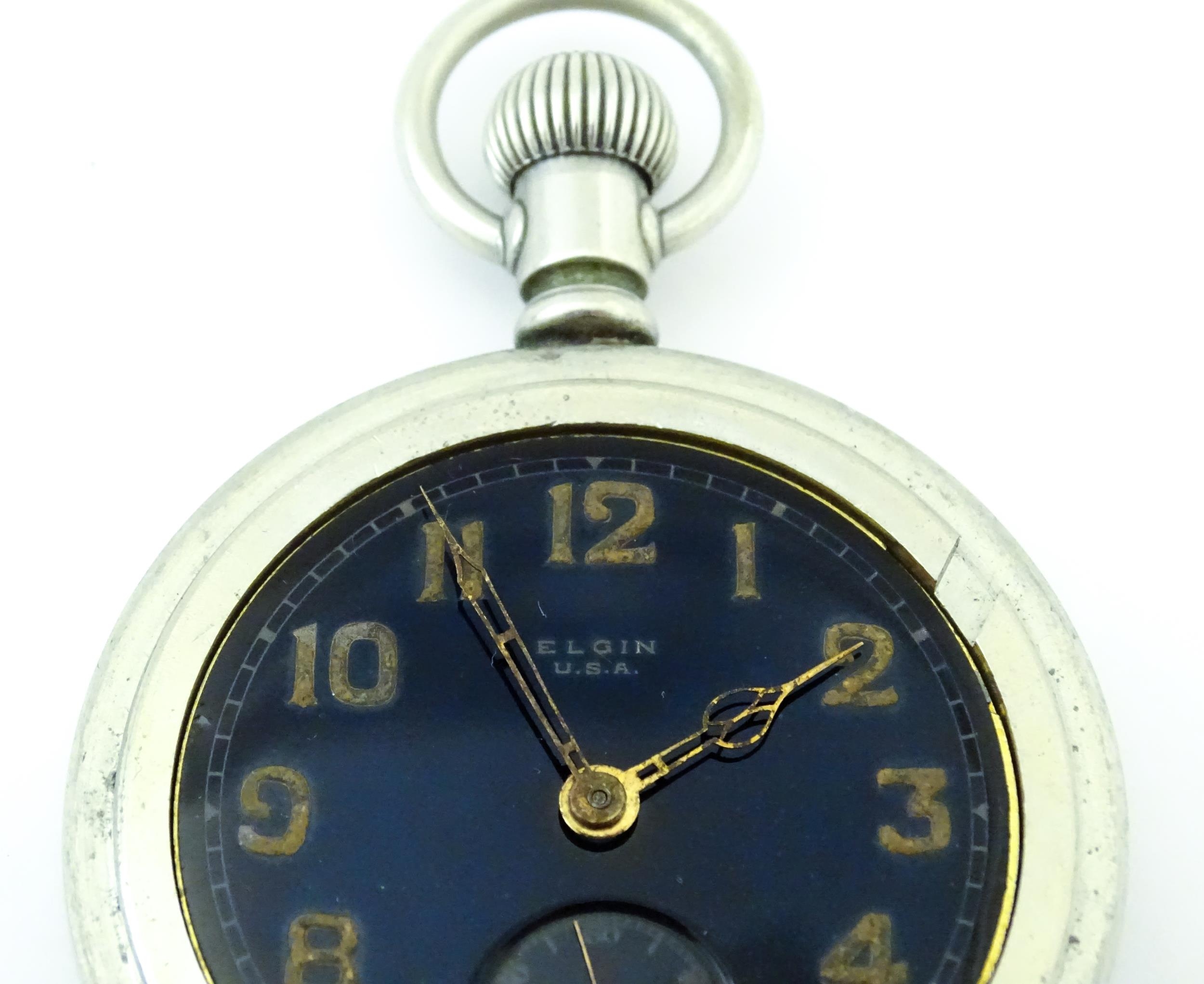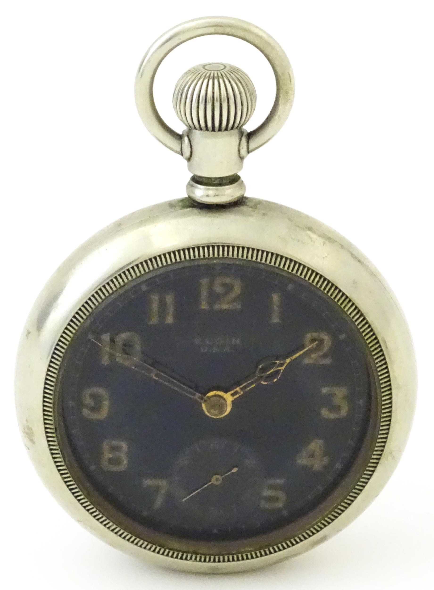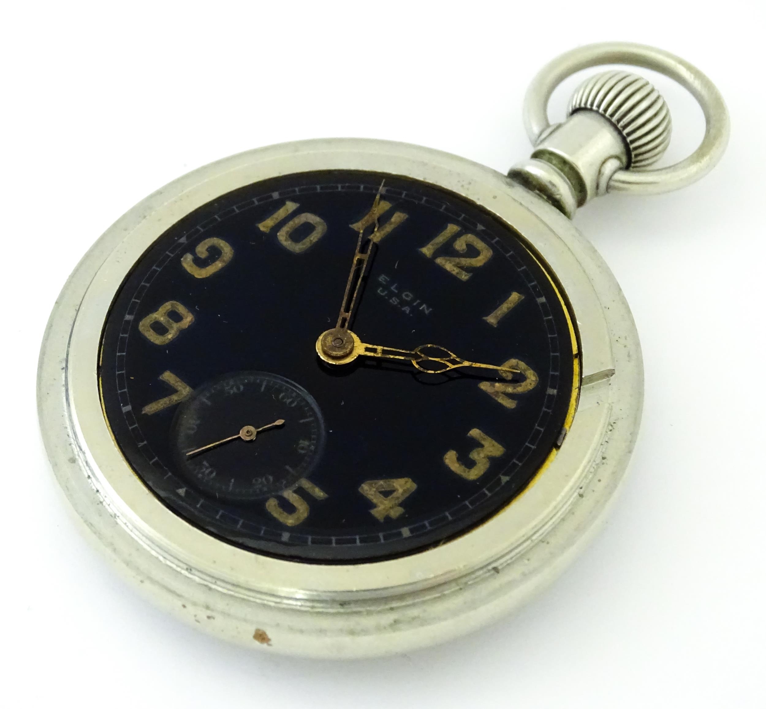 Militaria, First World War / WWI / World War 1 / WW1 : a GSTP type pocket watch by Elgin, USA. The case stamped '76403 R' and with Ministry of War broad arrow mark to the reverse. The black dial with Arabic numerals and subsidiary dial. Approx. 2 1/4" wide.
