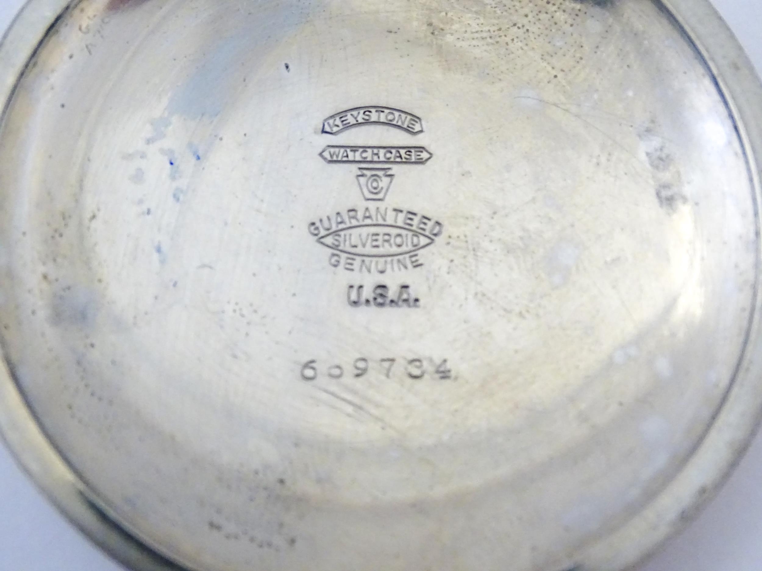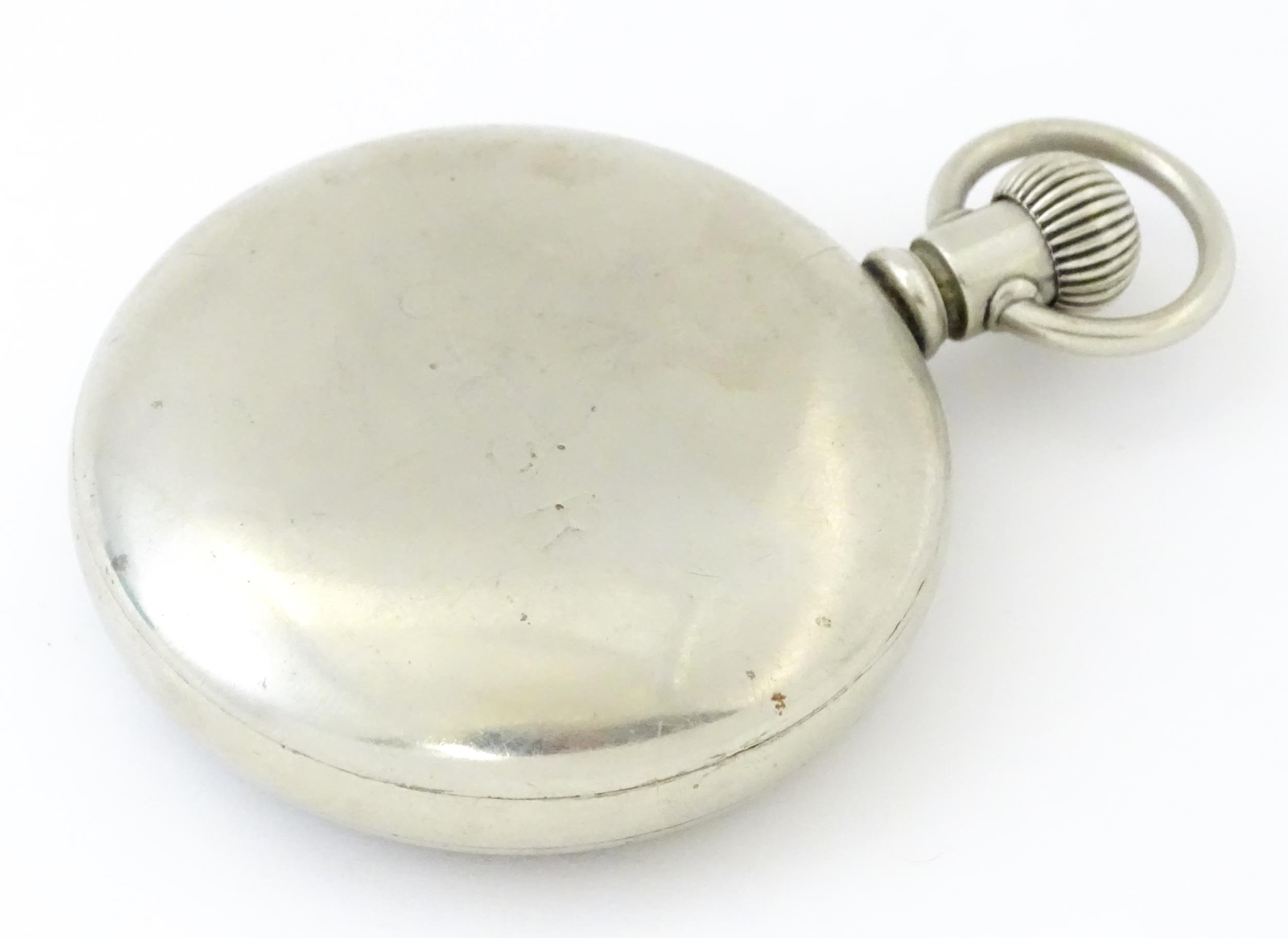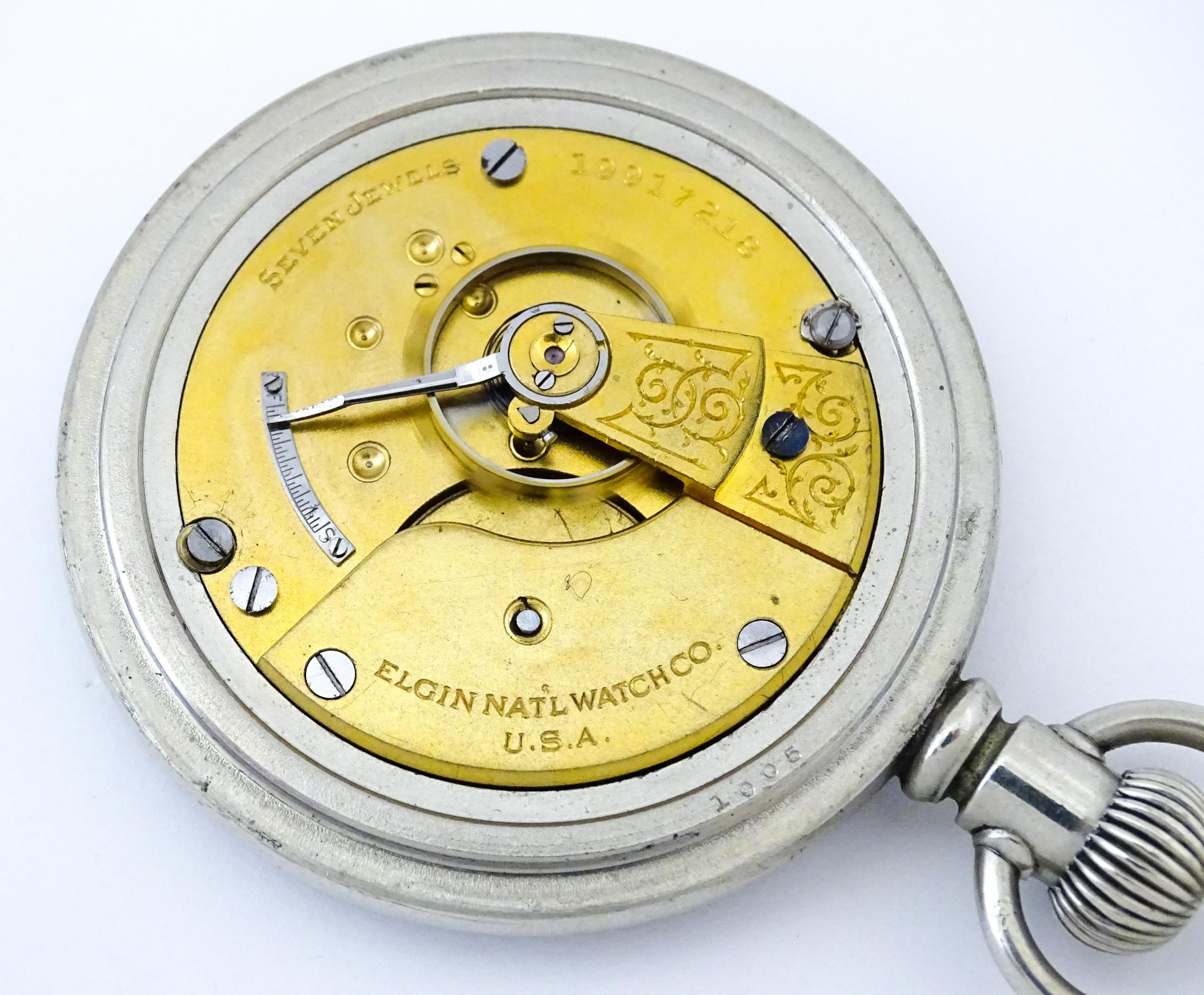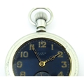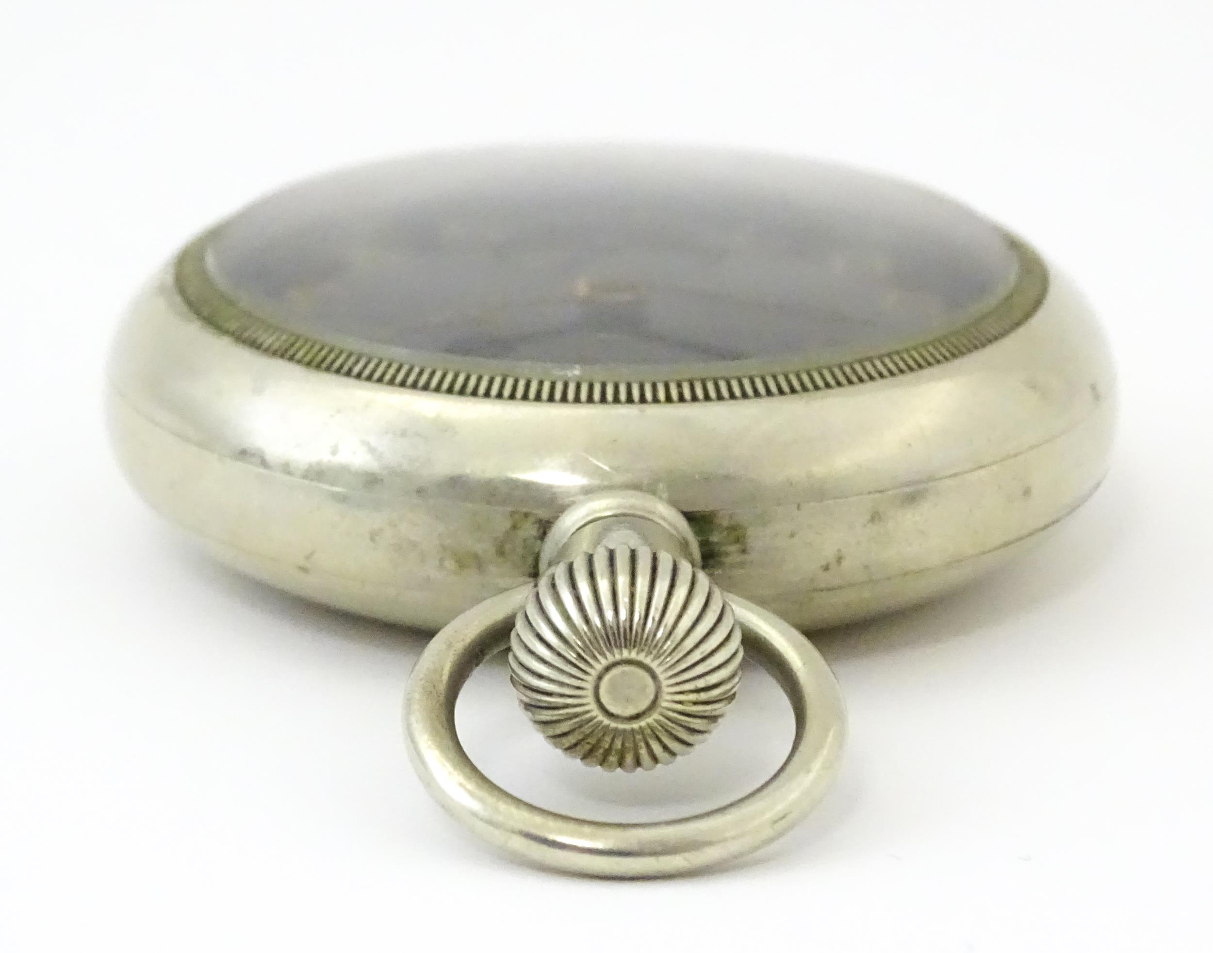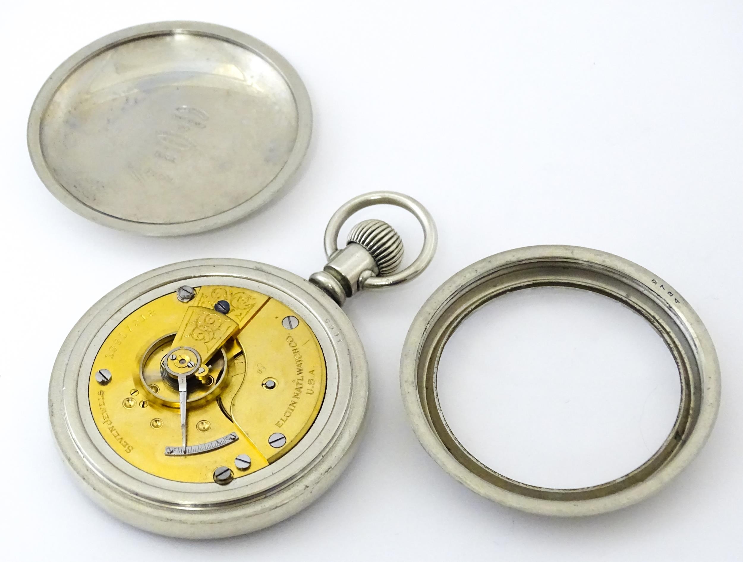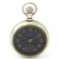 Militaria, First World War / WWI / World War 1 / WW1 : a GSTP type pocket watch by Elgin, USA. The case stamped '76403 R' and with Ministry of War broad arrow mark to the reverse. The black dial with Arabic numerals and subsidiary dial. Approx. 2 1/4" wide.