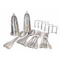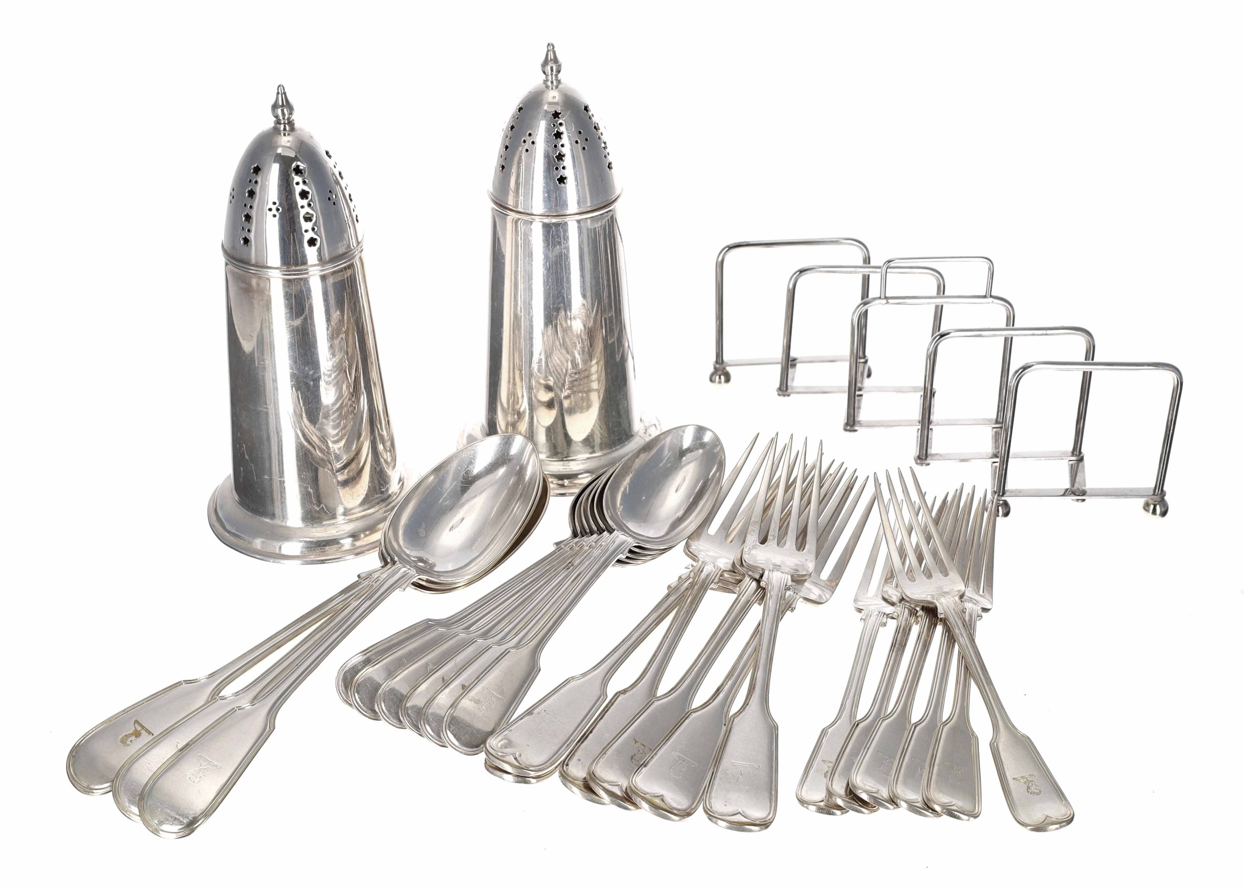 Pair of large silver plated casters/muffineers, 7.5" high; together with a concertina hinged toast rack; also a group of William Hutton & Sons fiddle and thread pattern forks and spoons bearing the Davenport crest