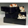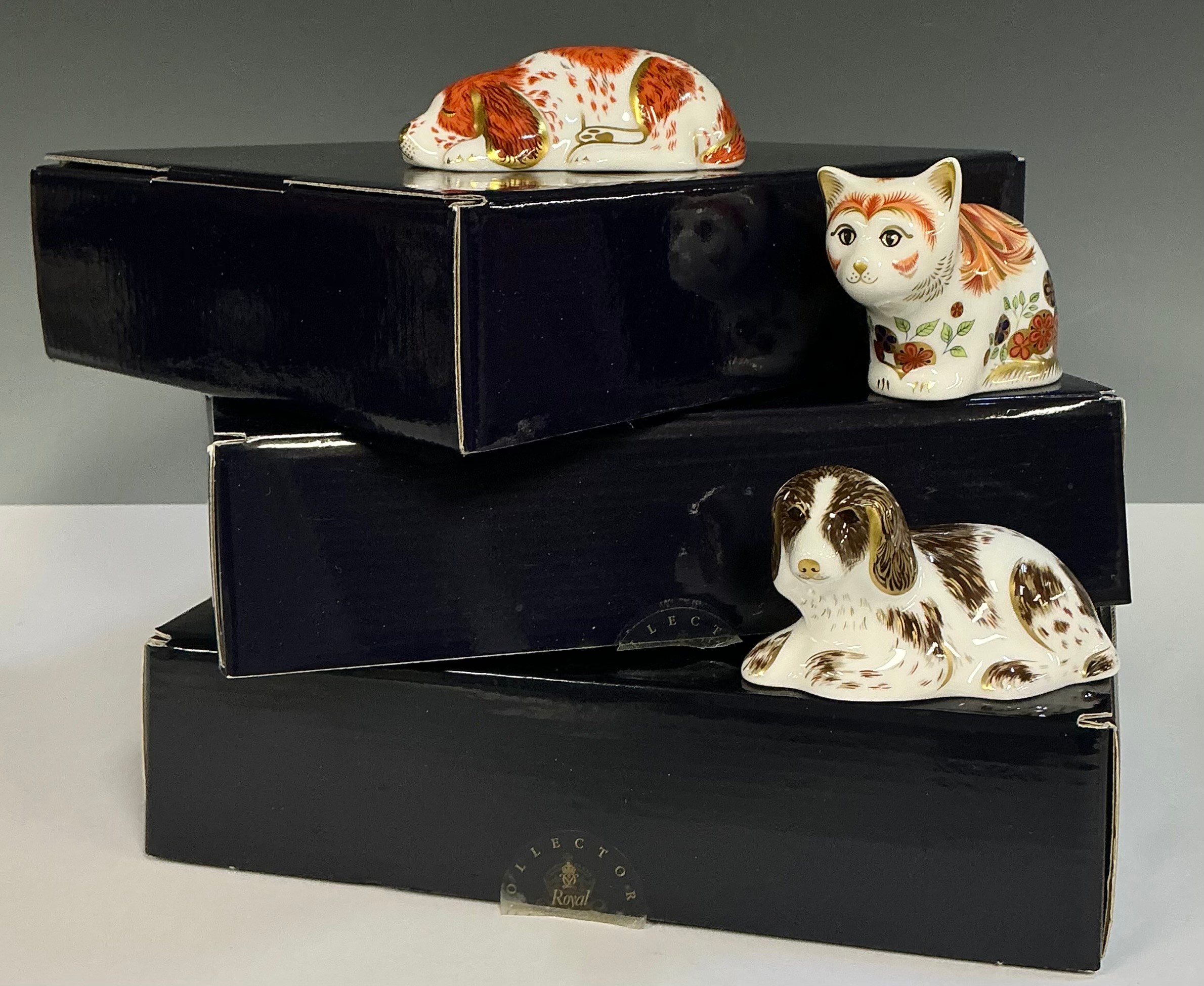 A Royal Crown Derby paperweight, Spice Kitten, Collector's Guild Member's Pack exclusive, gold stopper, 6cm, printed mark, presentation box; others similar, Puppy, gold stopper, boxed; Scruff, gold stopper, boxed (3)