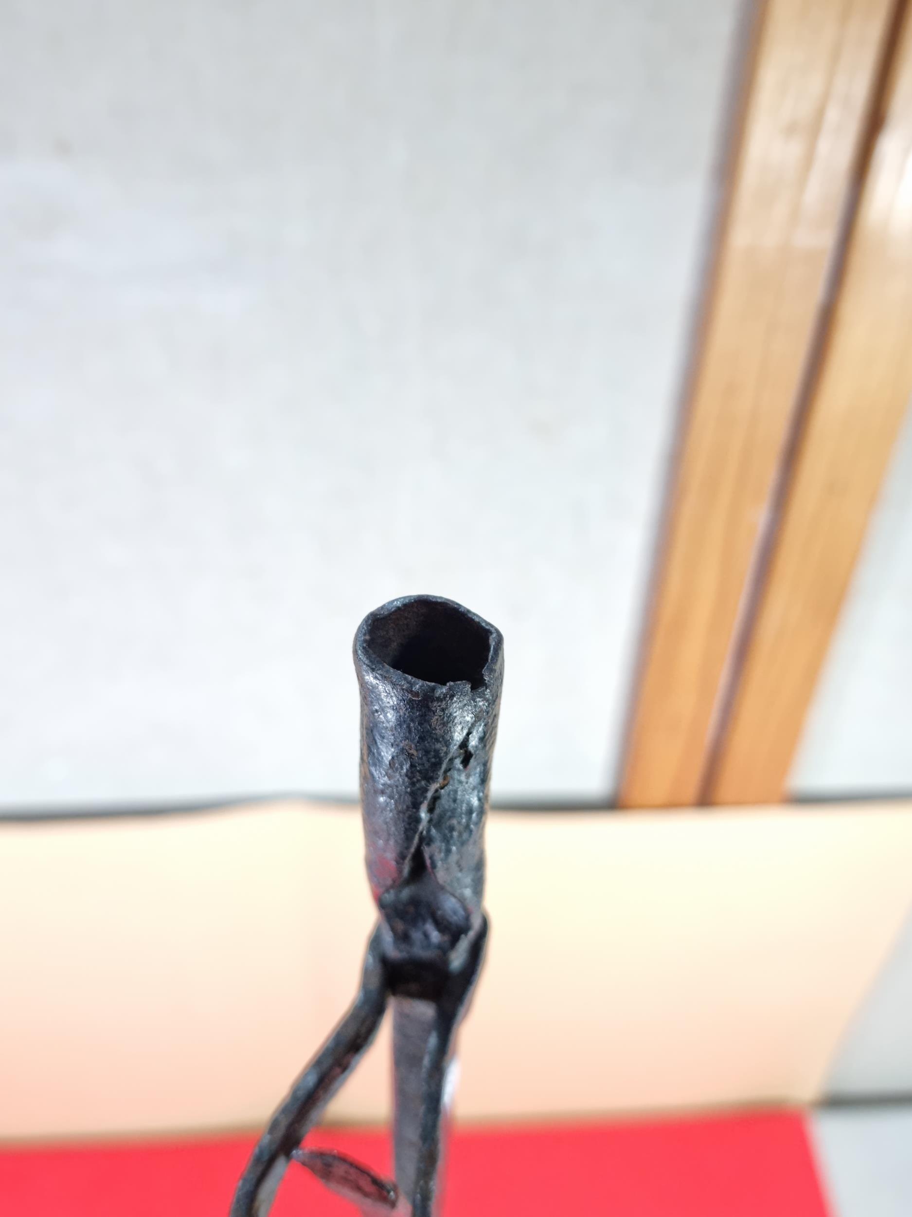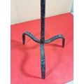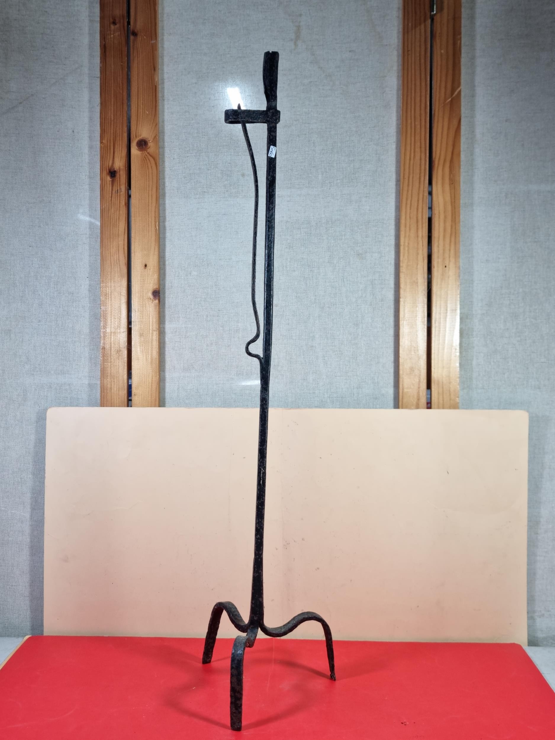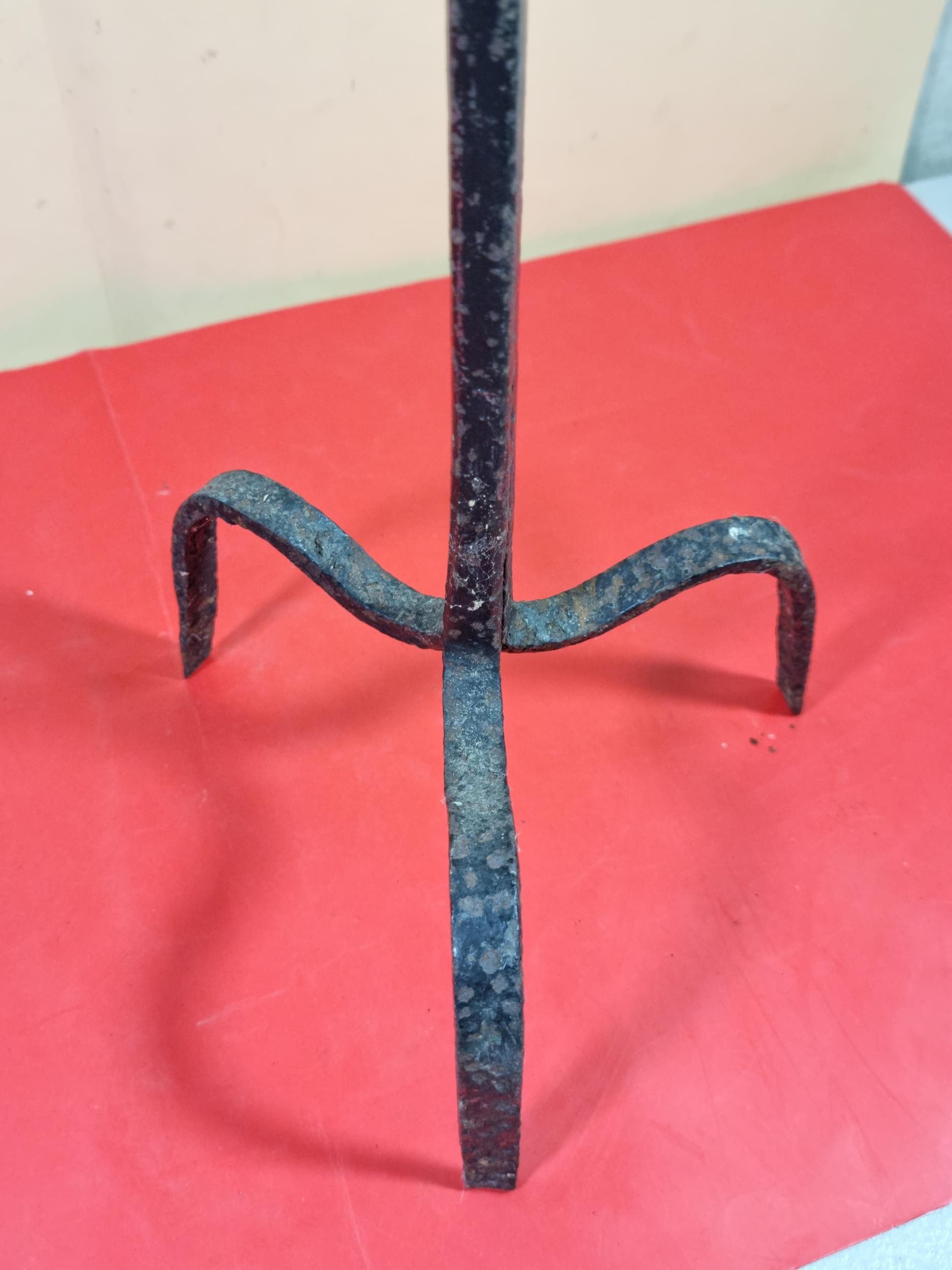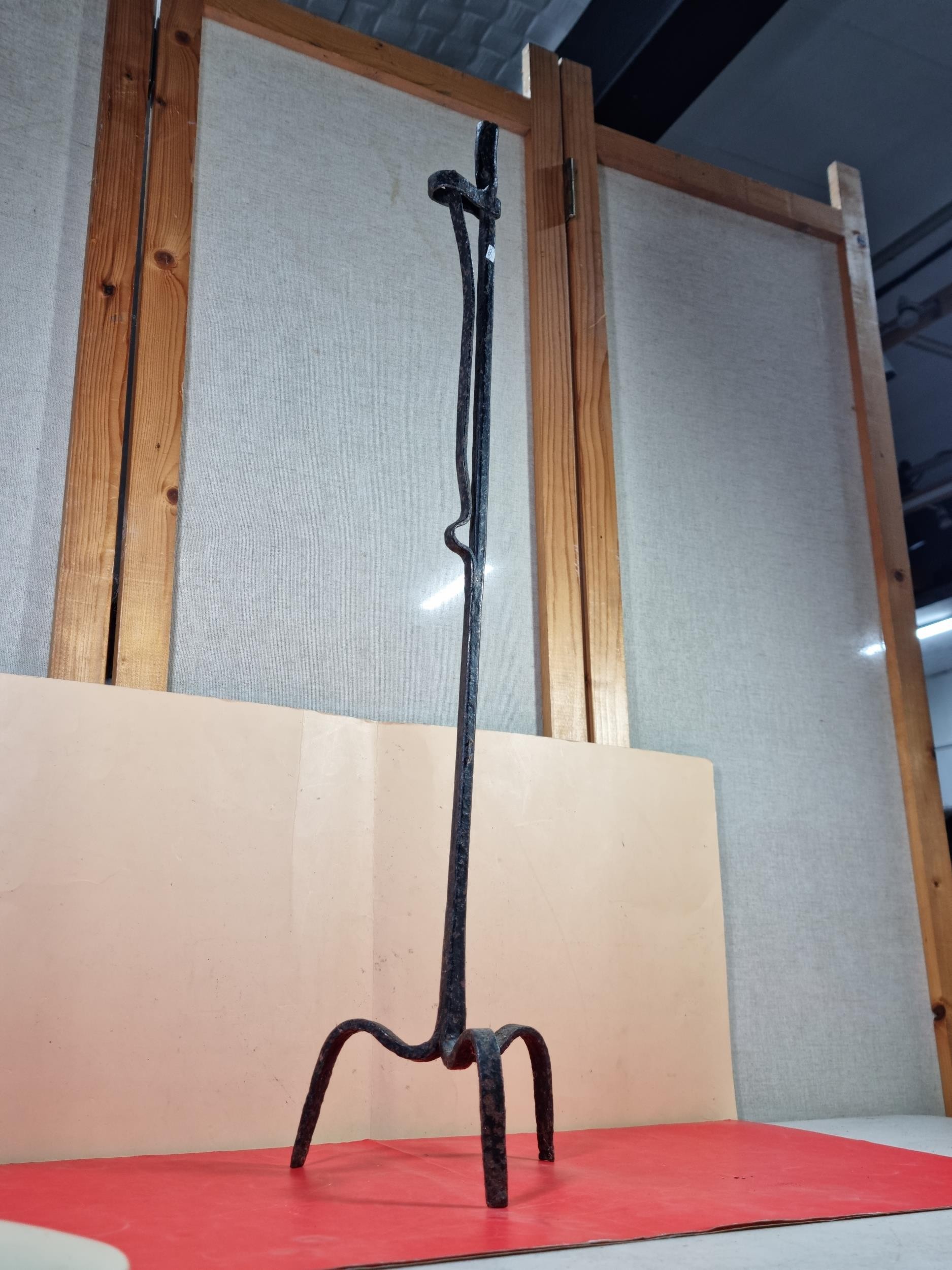A rare wrought iron floor standing 18th Century Peerman / Kienspanhalter made for bog wood the candle stick has a spring system in which the bog wood can be secured, the Peerman stands on three splayed feet the metal is pitted due to its age, a rare find. The piece stands at 82cm high