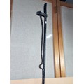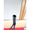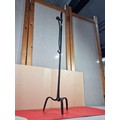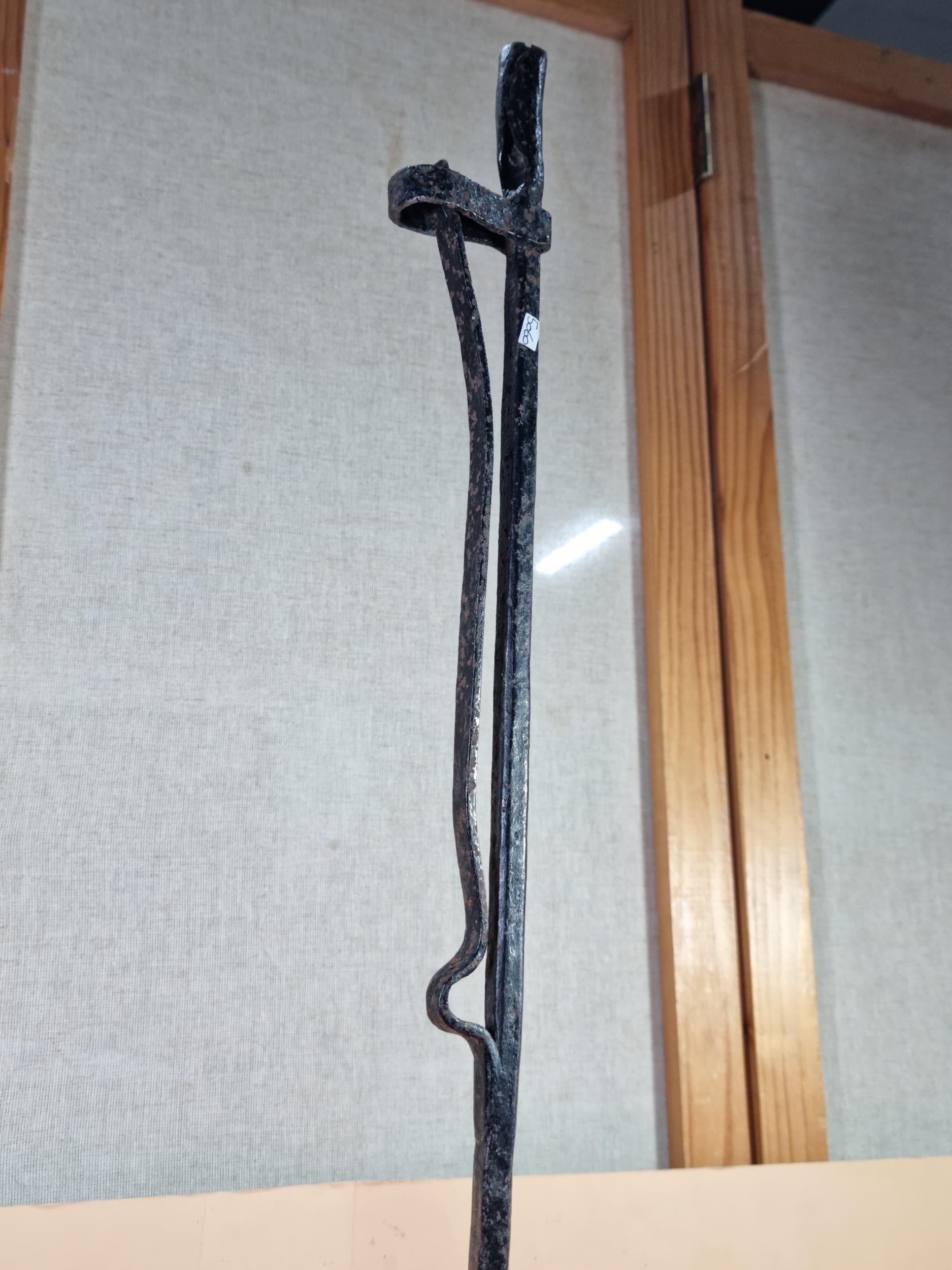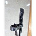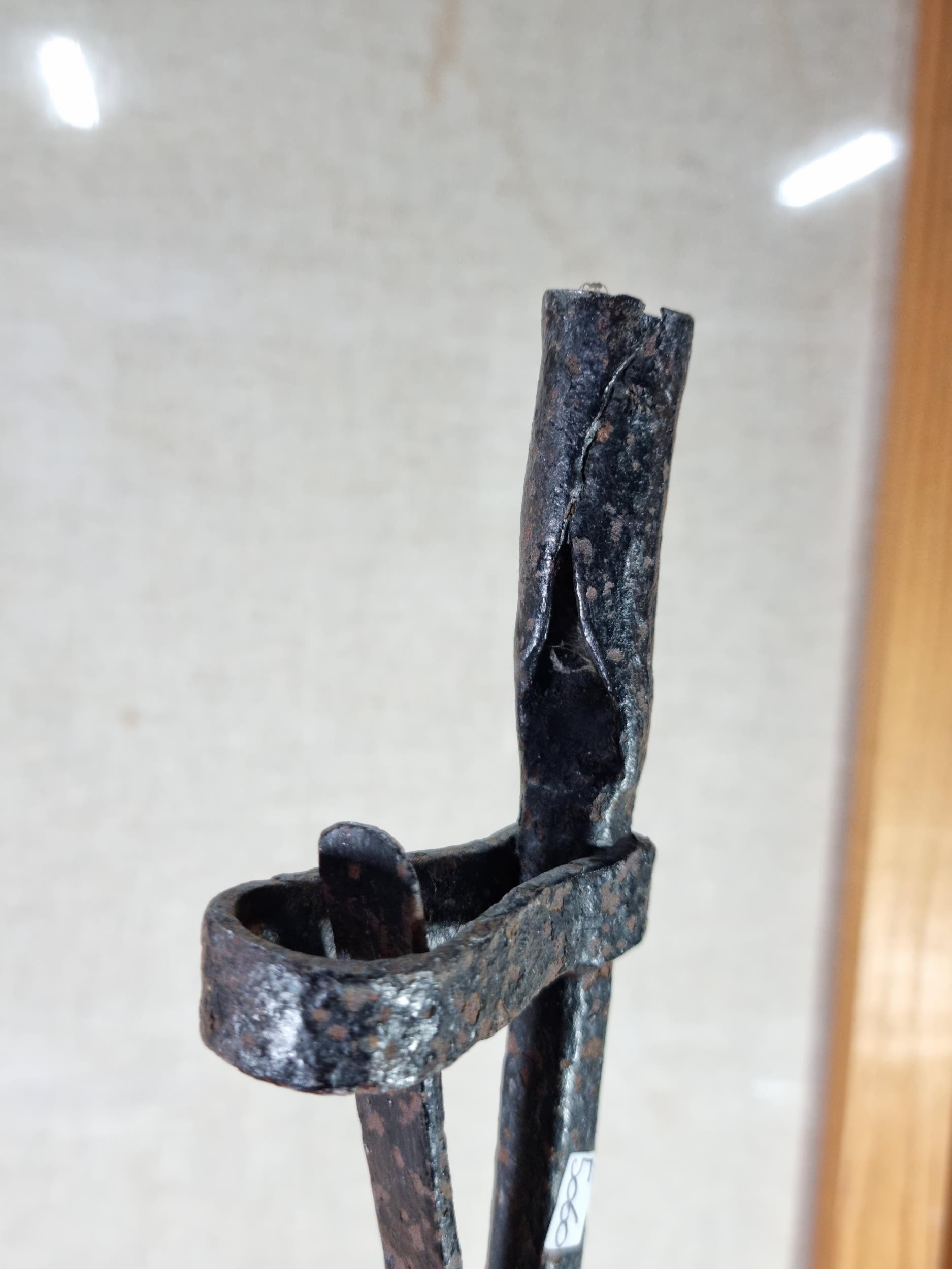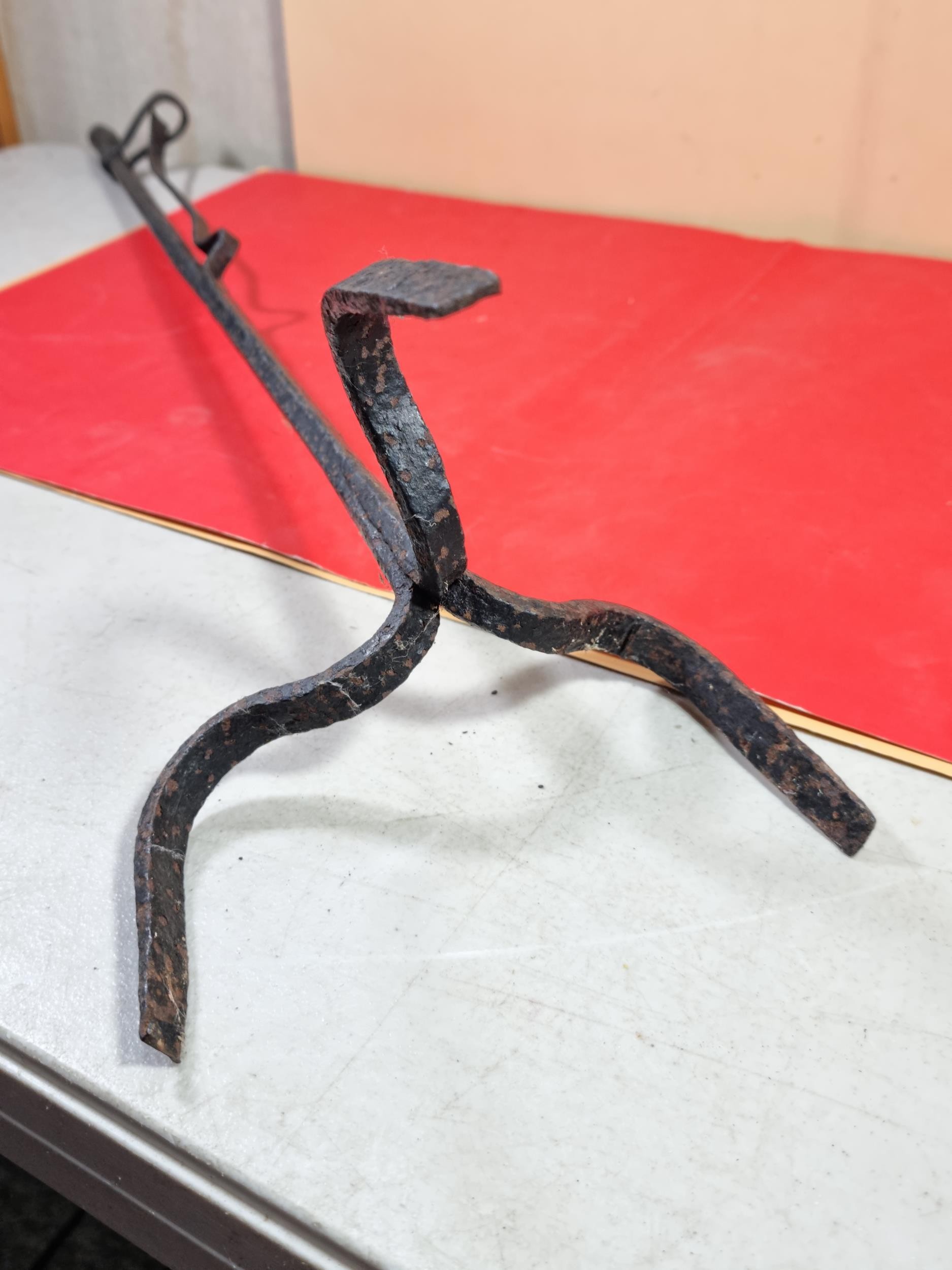 A rare wrought iron floor standing 18th Century Peerman / Kienspanhalter made for bog wood the candle stick has a spring system in which the bog wood can be secured, the Peerman stands on three splayed feet the metal is pitted due to its age, a rare find. The piece stands at 82cm high