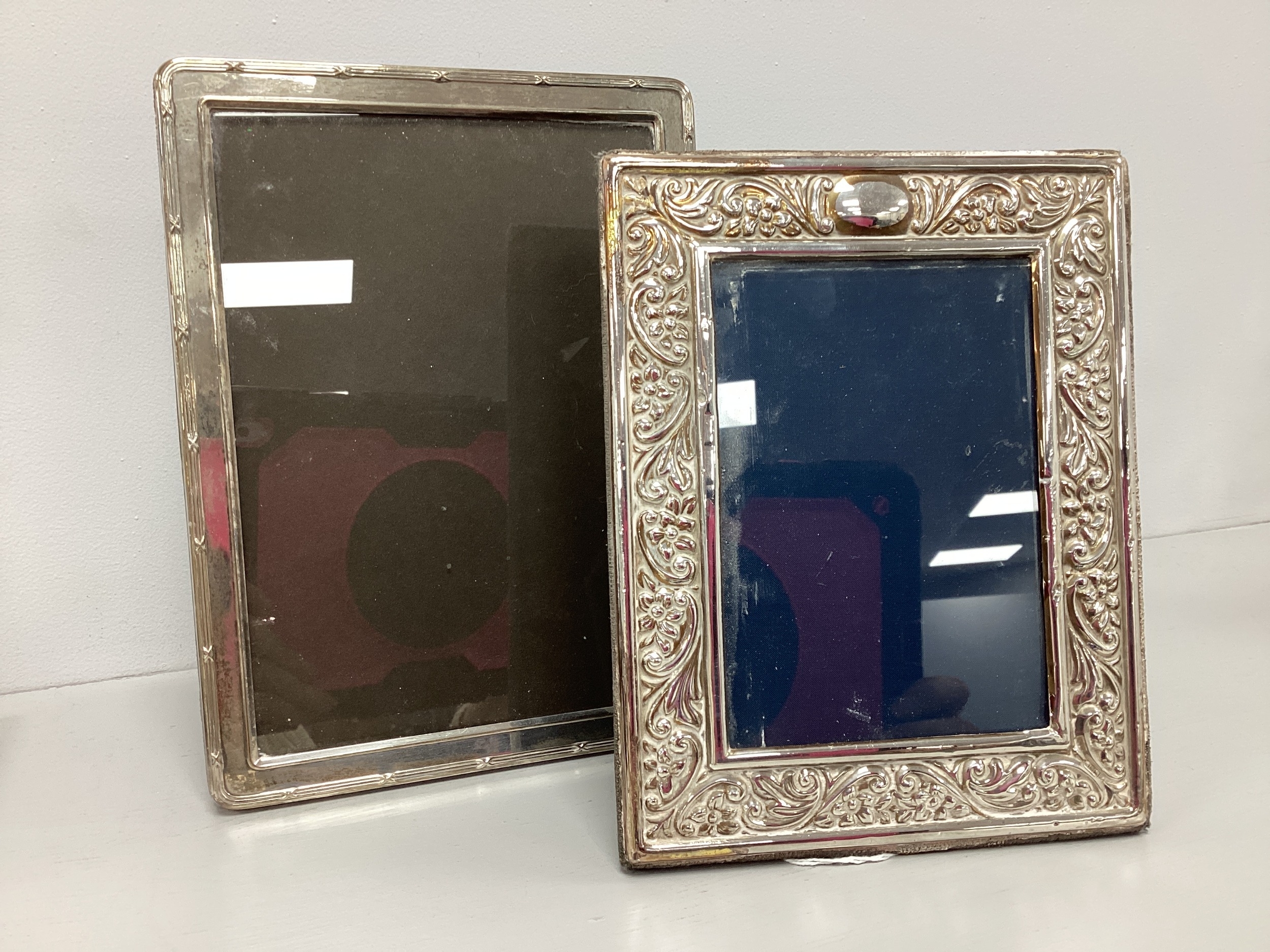 A Hallmarked Silver Mounted Photograph Frame, Carrs, Sheffield 1994, on plush easel back, 20.5cm hgh; Together with A Smaller Example, RC, Sheffield 1994, of textured design, on plush easel back. (2)