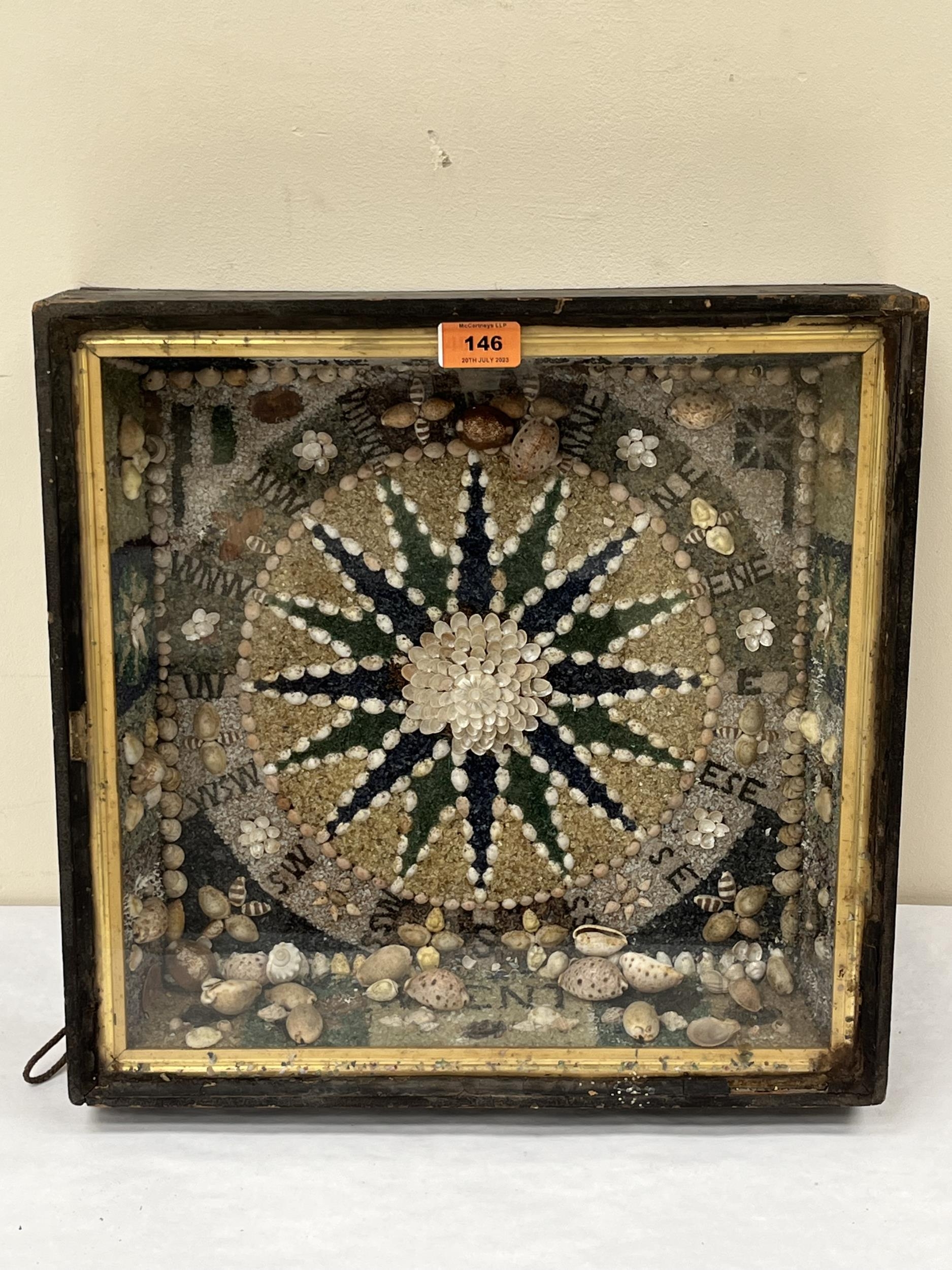 A 19th century cased sailors shellwork in the form of a compass. 16' x 16'. Some shells detached