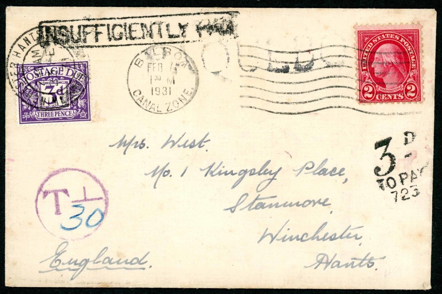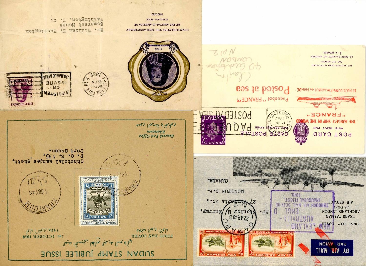 EARLY TO MODERN FOREIGN MIXTURE: Two cartons with the early to modern Foreign & Empire accumulation (no GB) of mint & used stamps, cards & covers with good range of USA inc. 1931 env. franked 2c tied Balboa, Canal Zone machine cancel to England with boxed "INSUFFICIENTLY STAMPED" "3D/TO PAY/723" h.s's in black "T 1/ " in circle in purple with ms '30' inserted with GB 3d p.due tied Winchester cds, etc., India inc. 1944/45 quartet of illustrated forces Christmas Air Letters to England, etc., New Zealand inc. 1920 mint Victory set SG 453/458 £60, 1940 mint Centenary issue SG 613/625 £70, etc. Plus much more (large qty)Cross Reference: AIR MAIL COVERS, UNITED STATES OF AMERICA, NEW ZEALAND, MILITARY - CENSORED MAIL