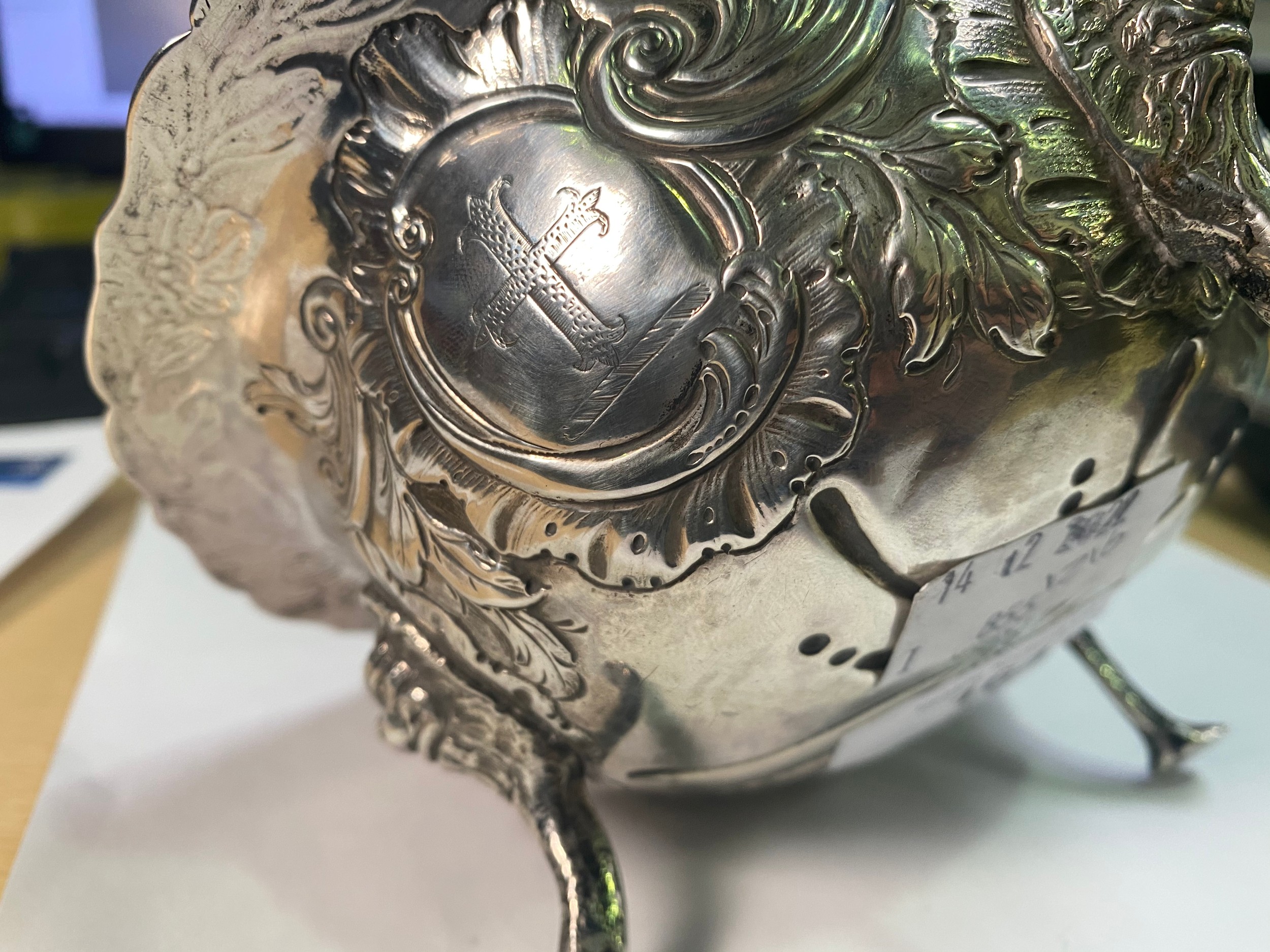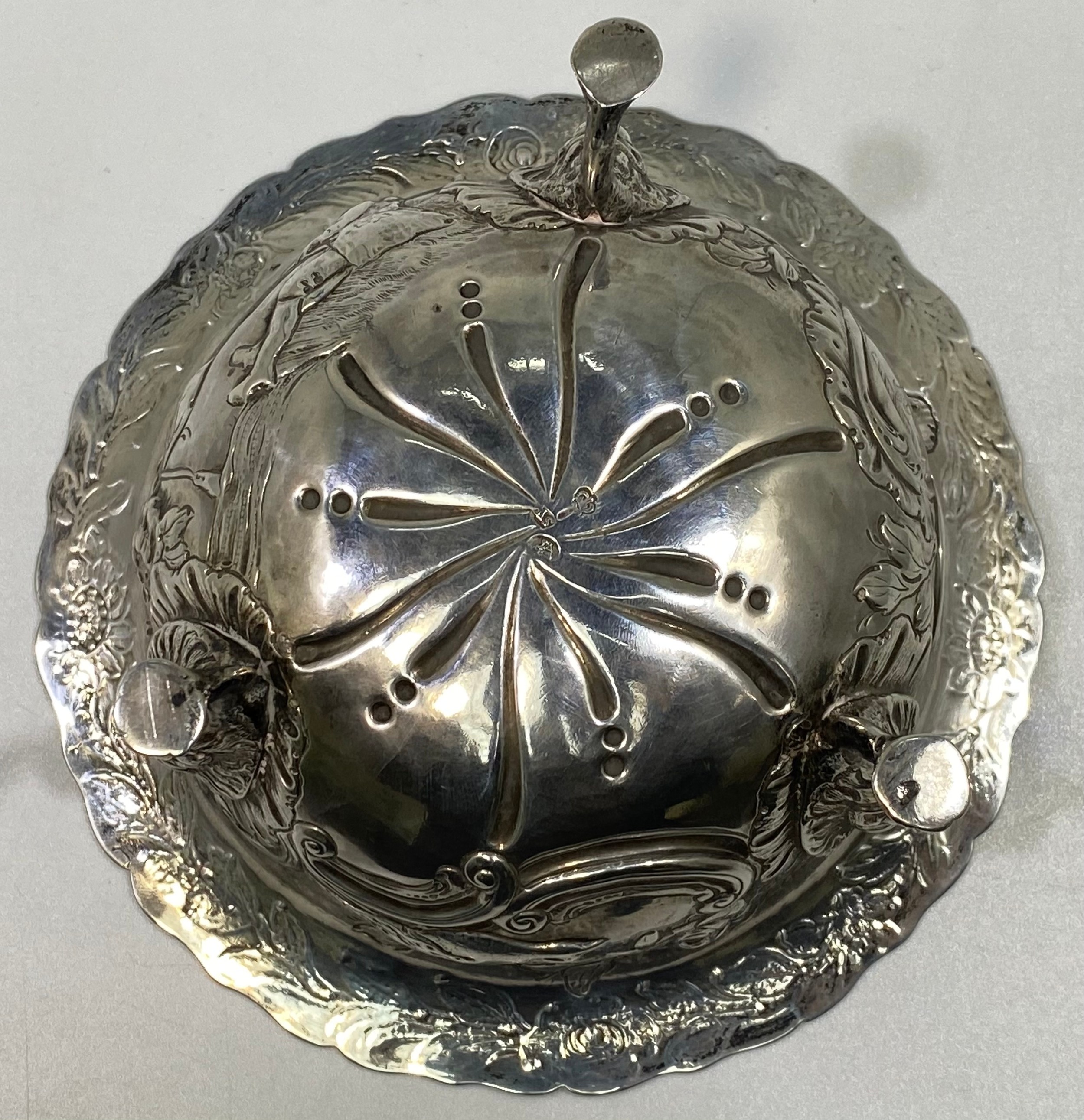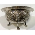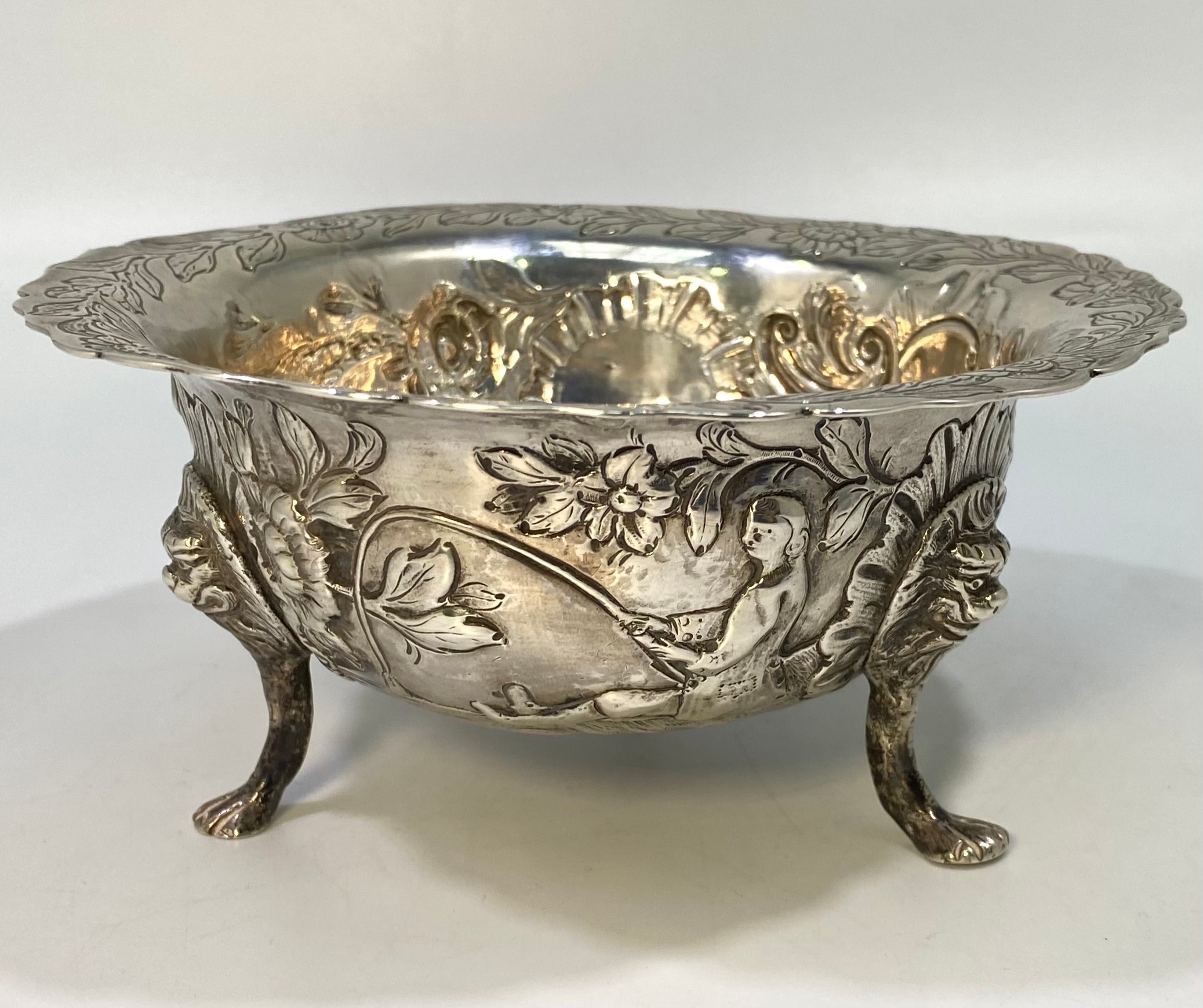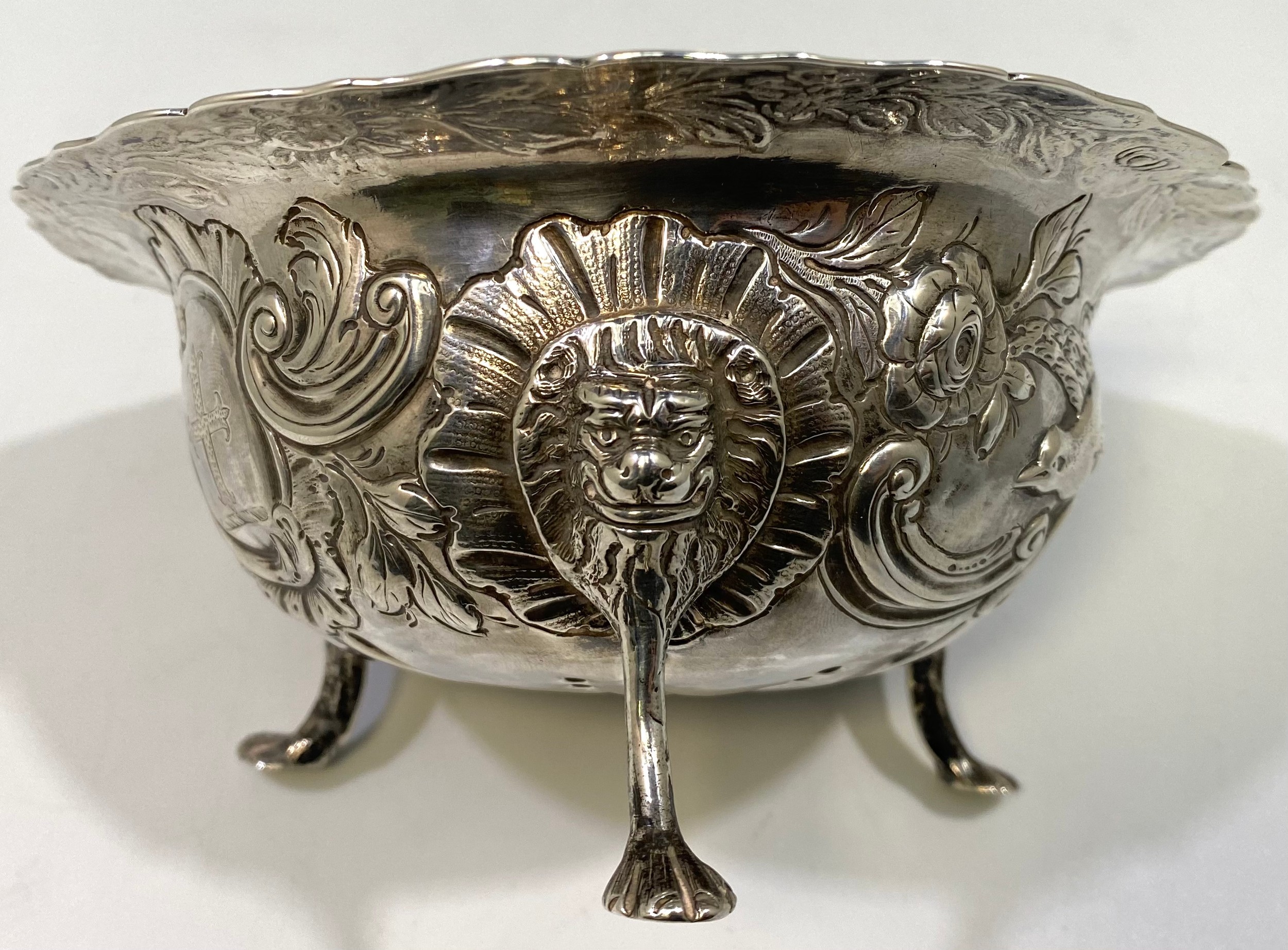 A George III Irish silver sugar bowl or bon-bon of circular form with everted rim, embossed and chased repousee decoration of a seated male figure fishing, a bird and cartouche engraved with a 'Cross Fleury' surrounded with scrolling foliage and flowers, raised on three cast lions mask monopod feet, hallmarks rubbed, Dublin, maker SW, Stephen Walsh, 6.35ozt, 15cm diameter