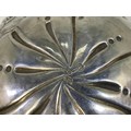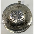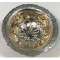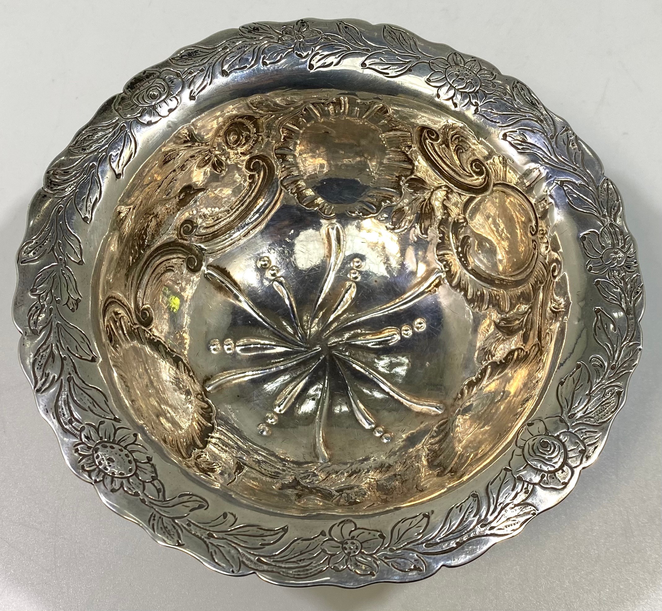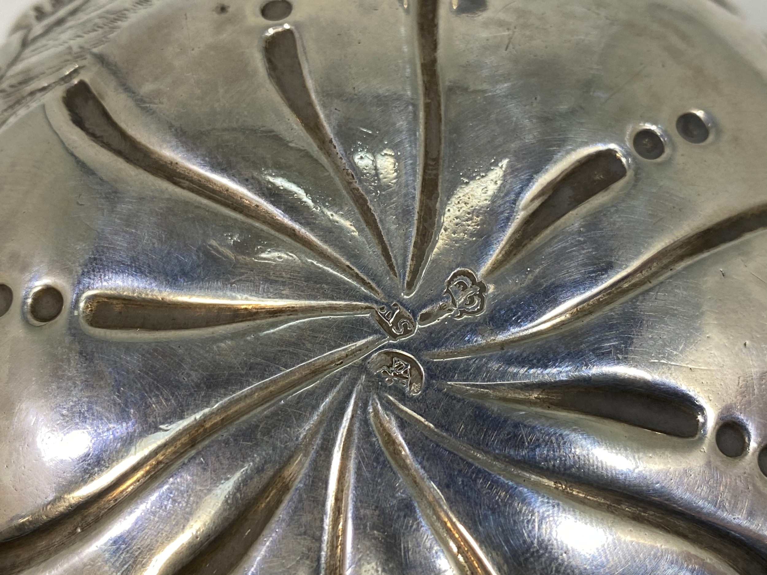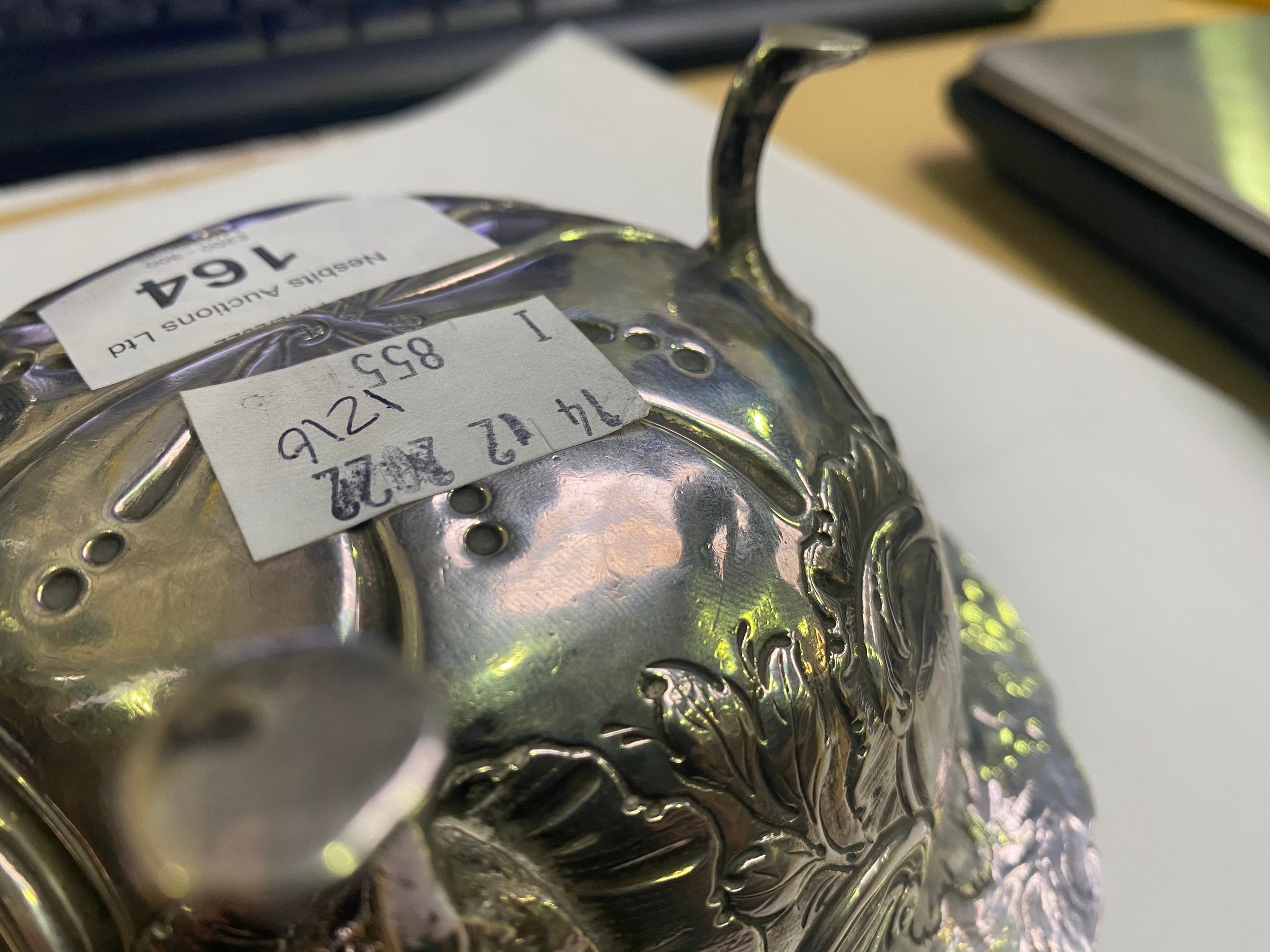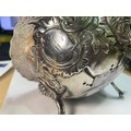 A George III Irish silver sugar bowl or bon-bon of circular form with everted rim, embossed and chased repousee decoration of a seated male figure fishing, a bird and cartouche engraved with a 'Cross Fleury' surrounded with scrolling foliage and flowers, raised on three cast lions mask monopod feet, hallmarks rubbed, Dublin, maker SW, Stephen Walsh, 6.35ozt, 15cm diameter