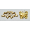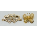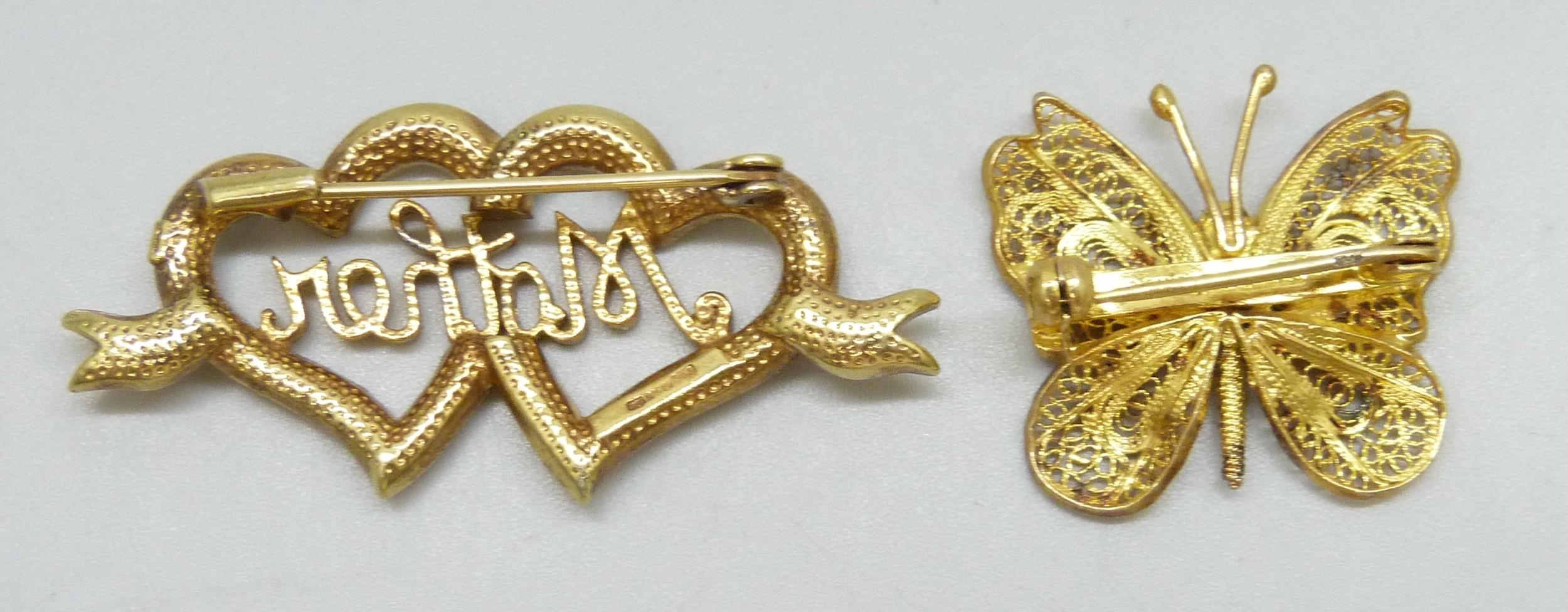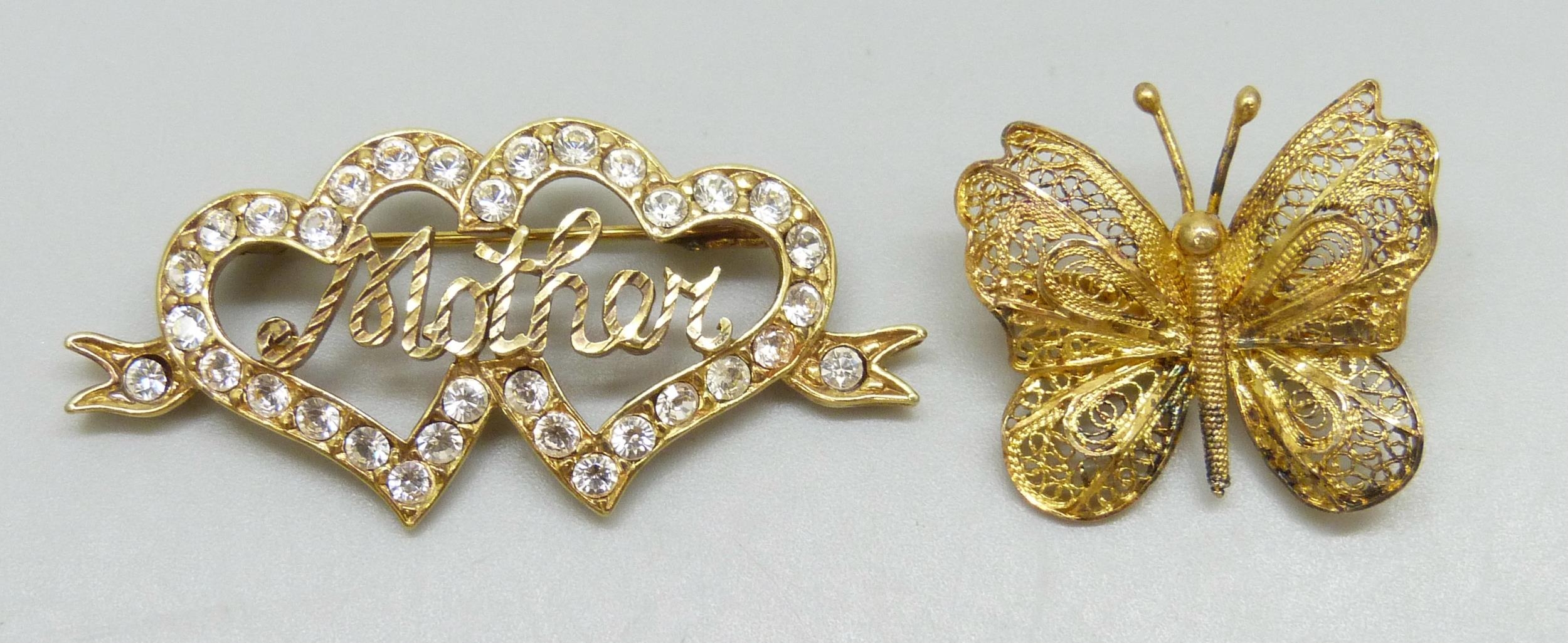 Two silver gilt brooches, a filigree butterfly and a ‘Mother’ example set with white stones, 4.8cm