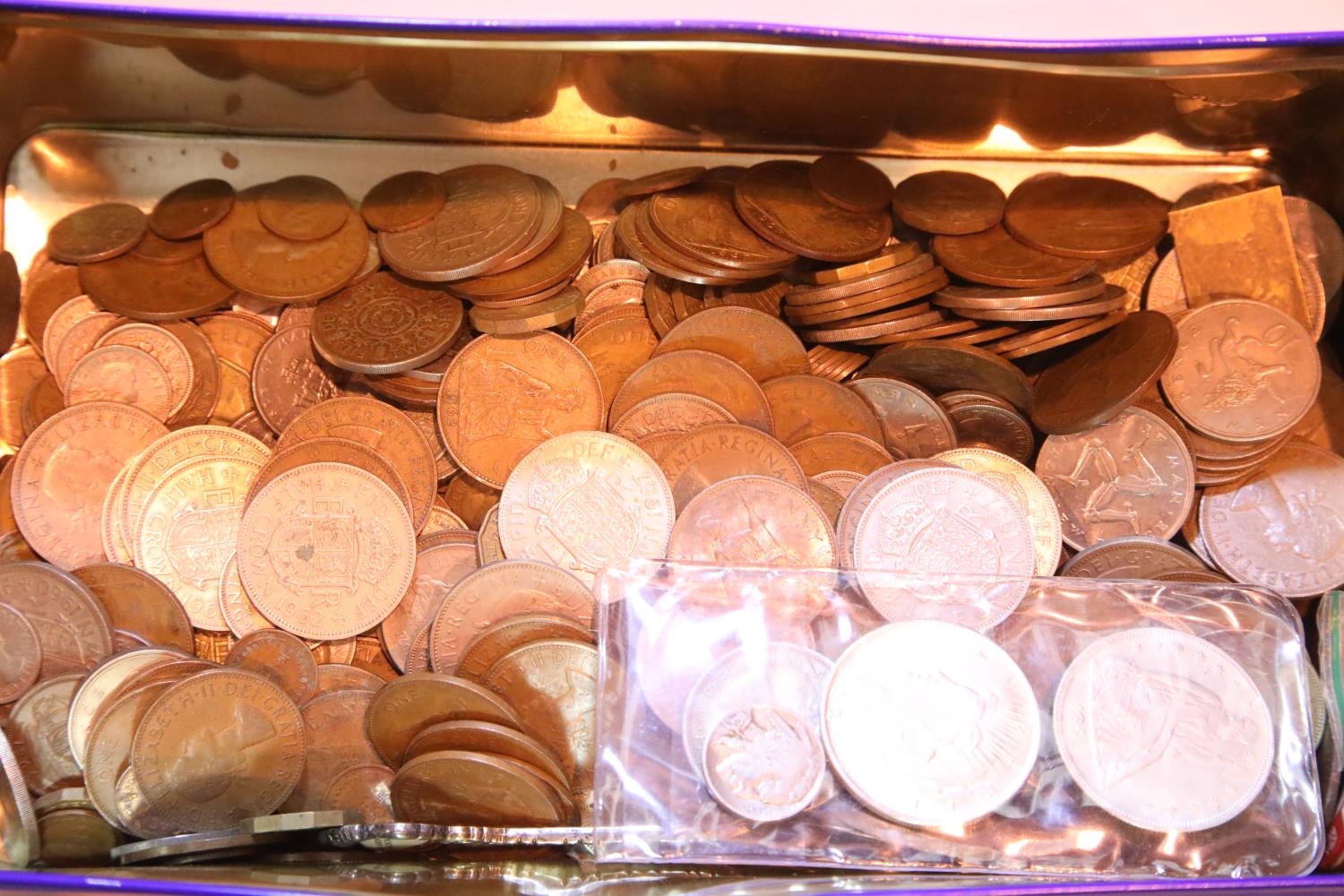 Tin of approximately 4kg of British coins, predecimal. Not available for in-house P&P.