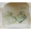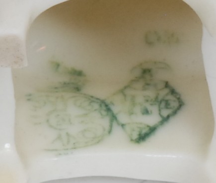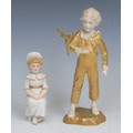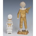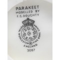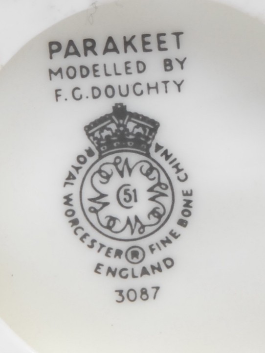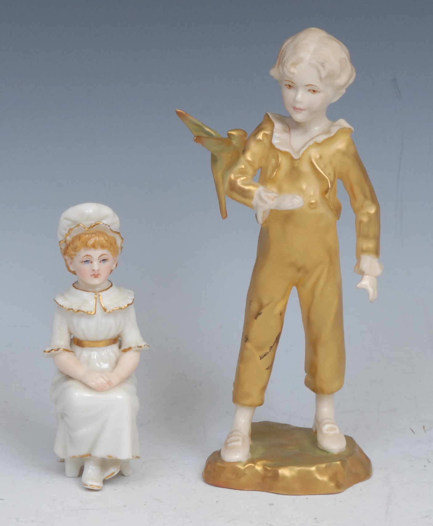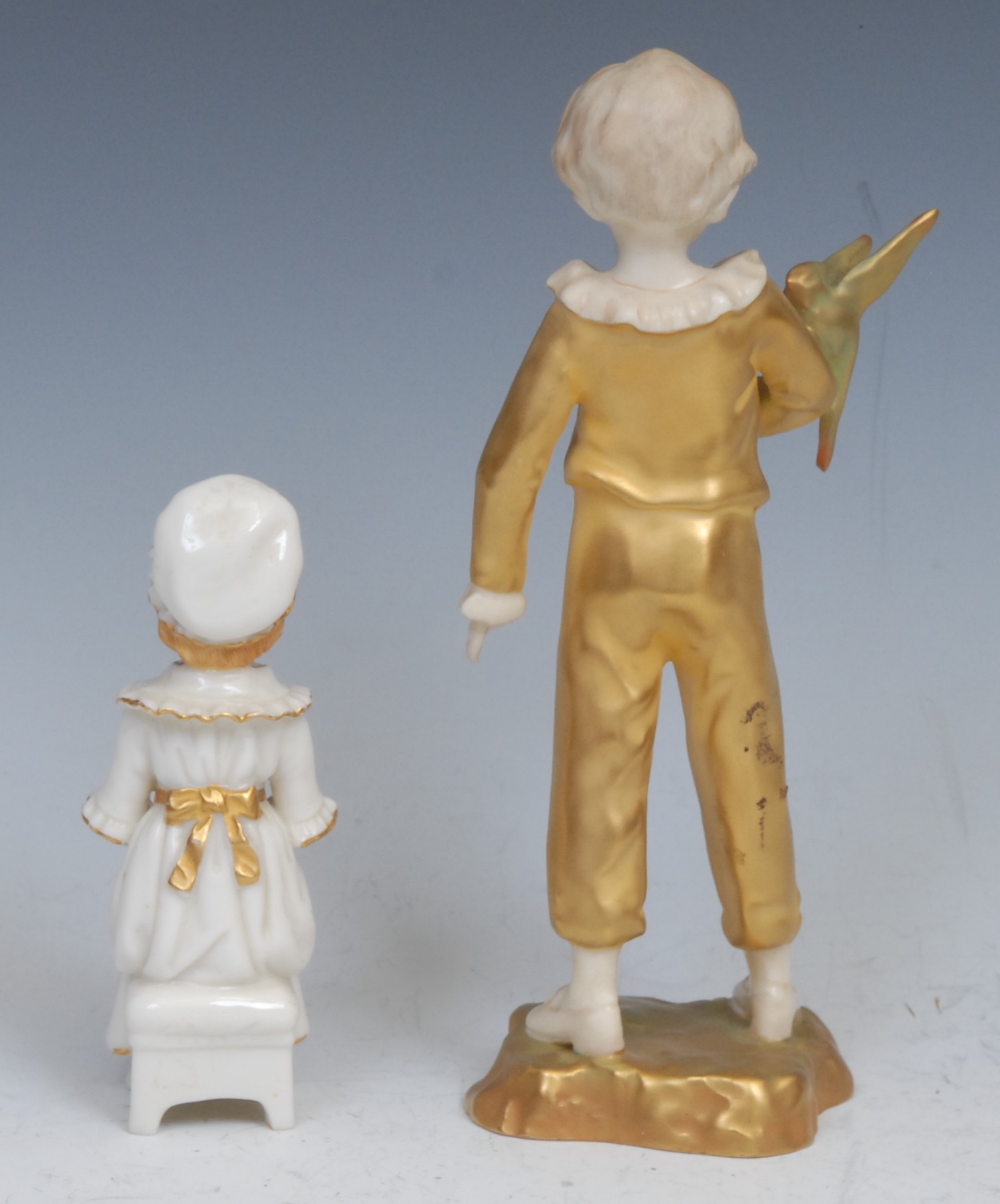 Royal Worcester figure, after James Hadley, of a girl, on a chair, she with hands on her knee, in flesh tones and gilt, 10cm high, printed mark in green, c.1880; another, Parakeet, by Frieda Doughty, 17cm high, printed mark in black (2)